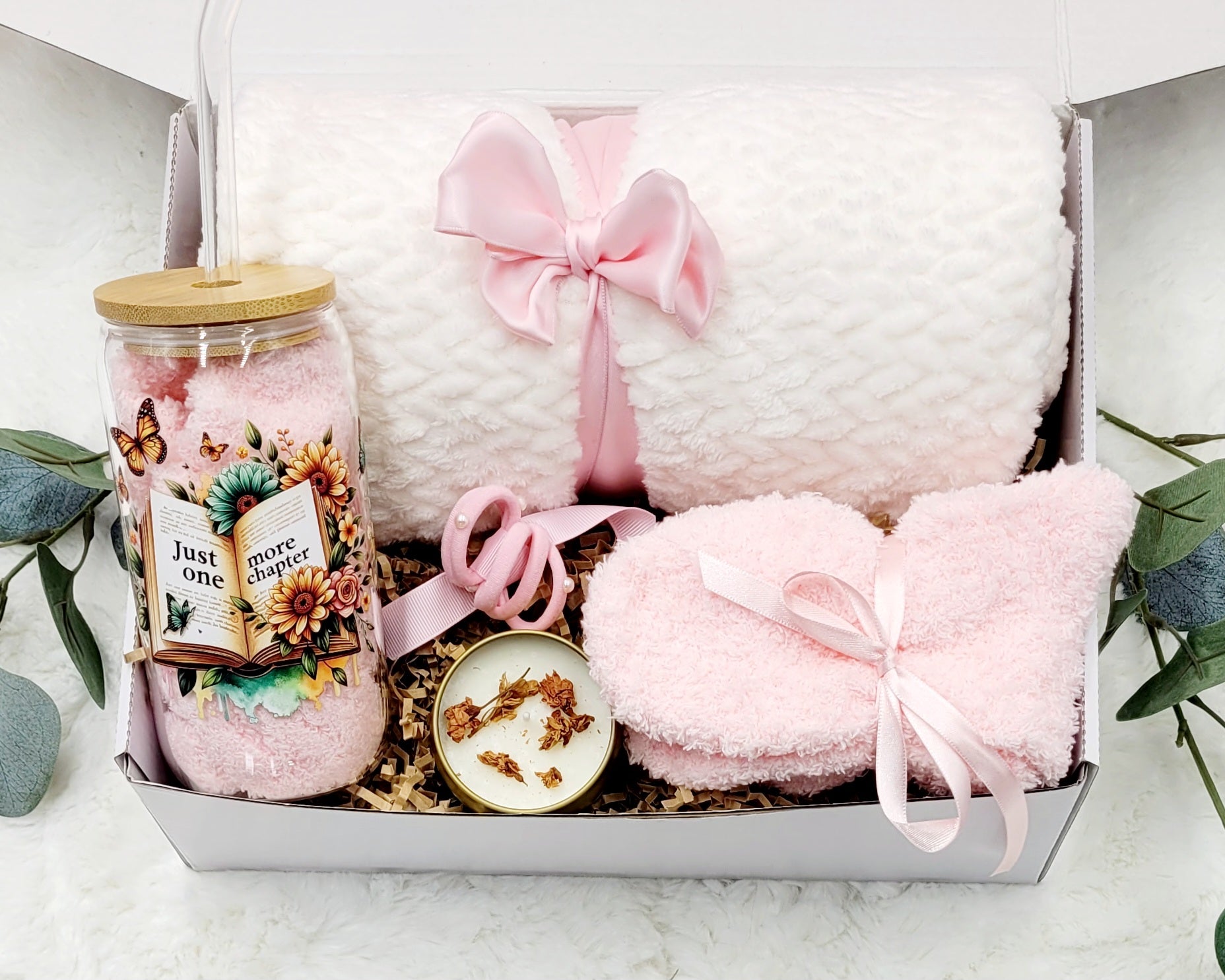Introducing the perfect gift for the book lover in your life - our Book Lover Pink Gift Box! This beautifully curated set includes a "just one more chapter" tumbler, perfect for sipping on their favorite beverage while engrossed in a new novel. The set also includes a cozy candle, fuzzy socks, scrunchie, and a plush blanket - everything they need for a relaxing literary escape. Whether they're a fan of romance, mystery, or fantasy, this gift box is sure to delight any bookworm. Give the gift of comfort and relaxation with our Book Lover Pink Gift Box - it's the ultimate treat for anyone who loves to get lost in a good book.