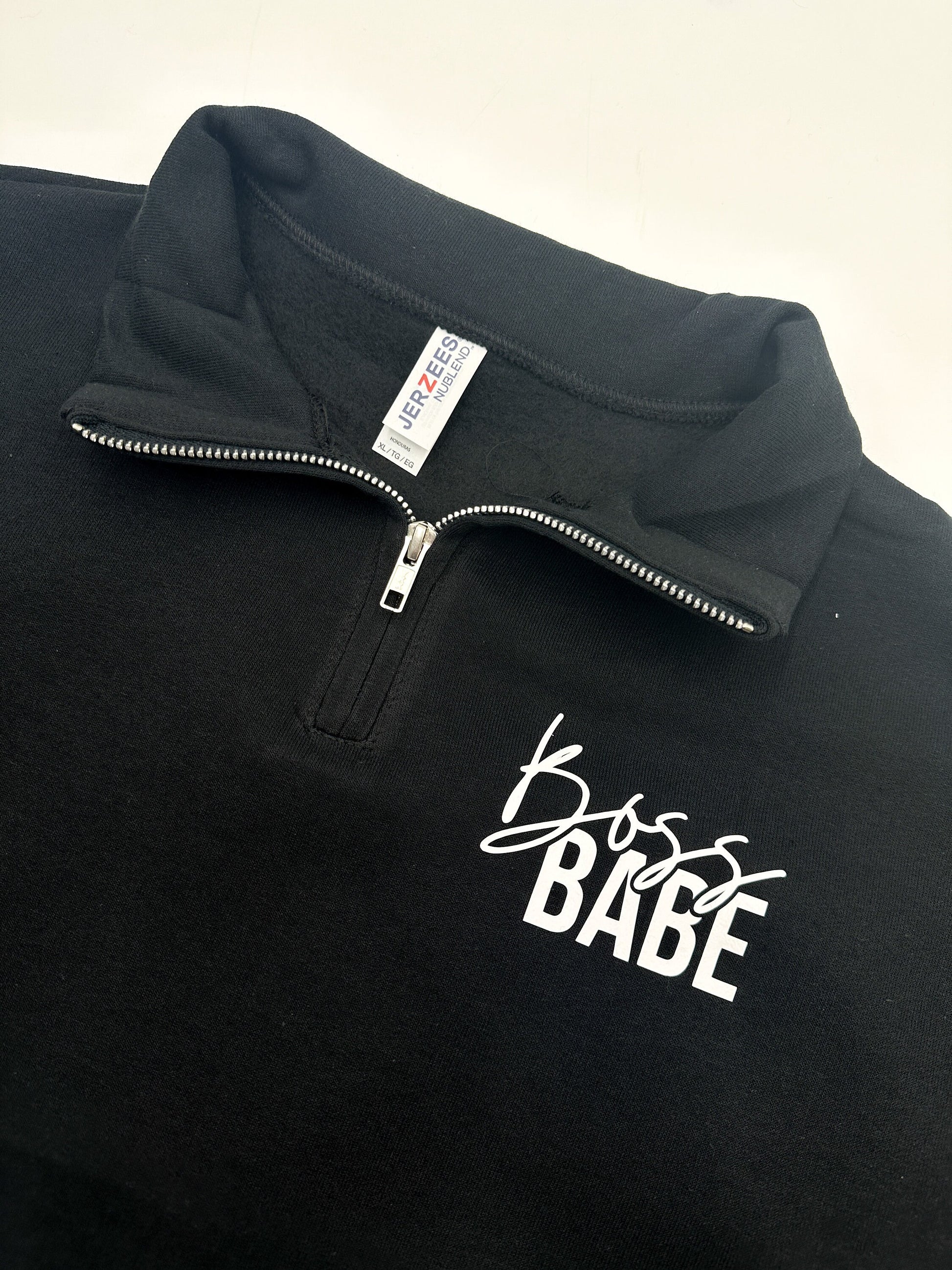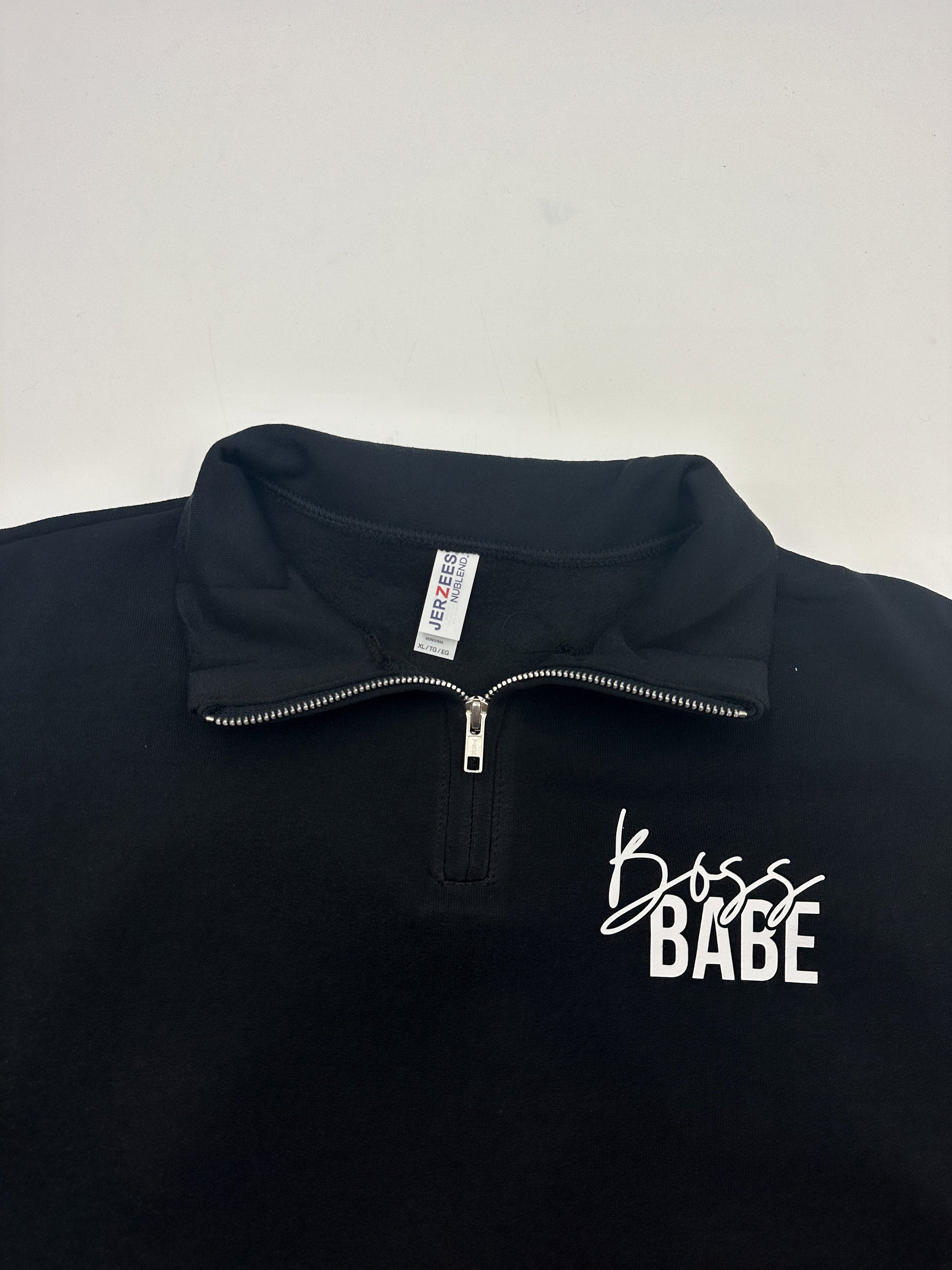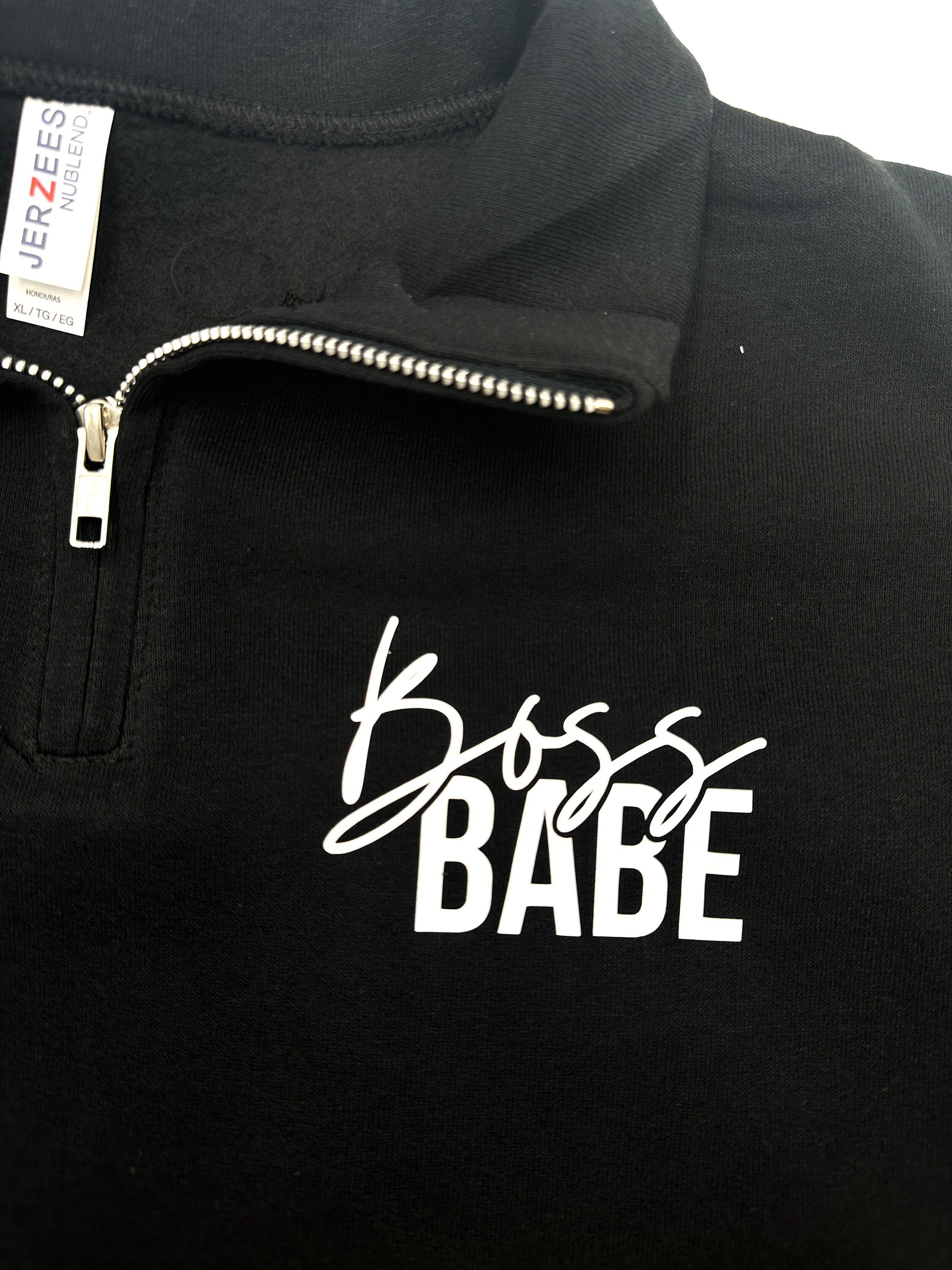 Stay cozy and stylish with this Boss Babe Quarter-Zip Sweatshirt. Crafted from a soft cotton-poly blend, this trendy quarter-zip is made for comfort and perfect for everyday wear. Keep your look on-point with this essential piece.
