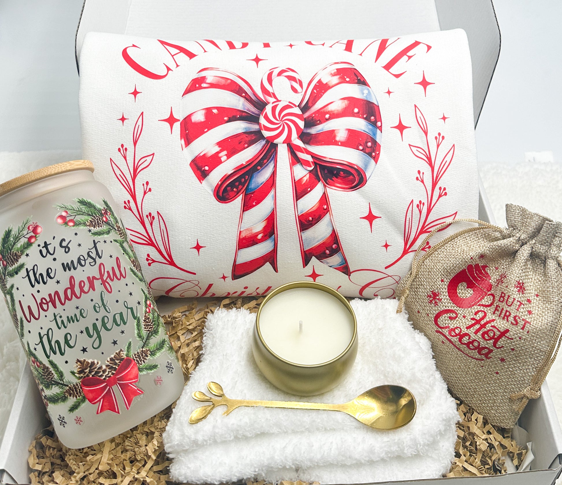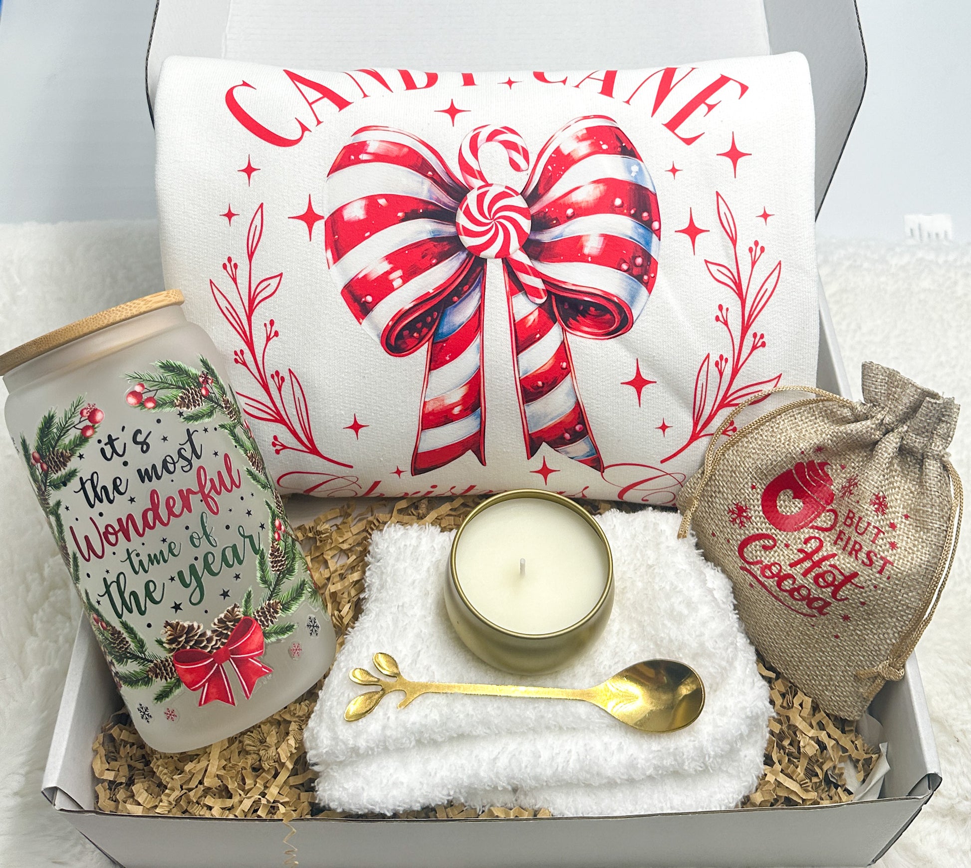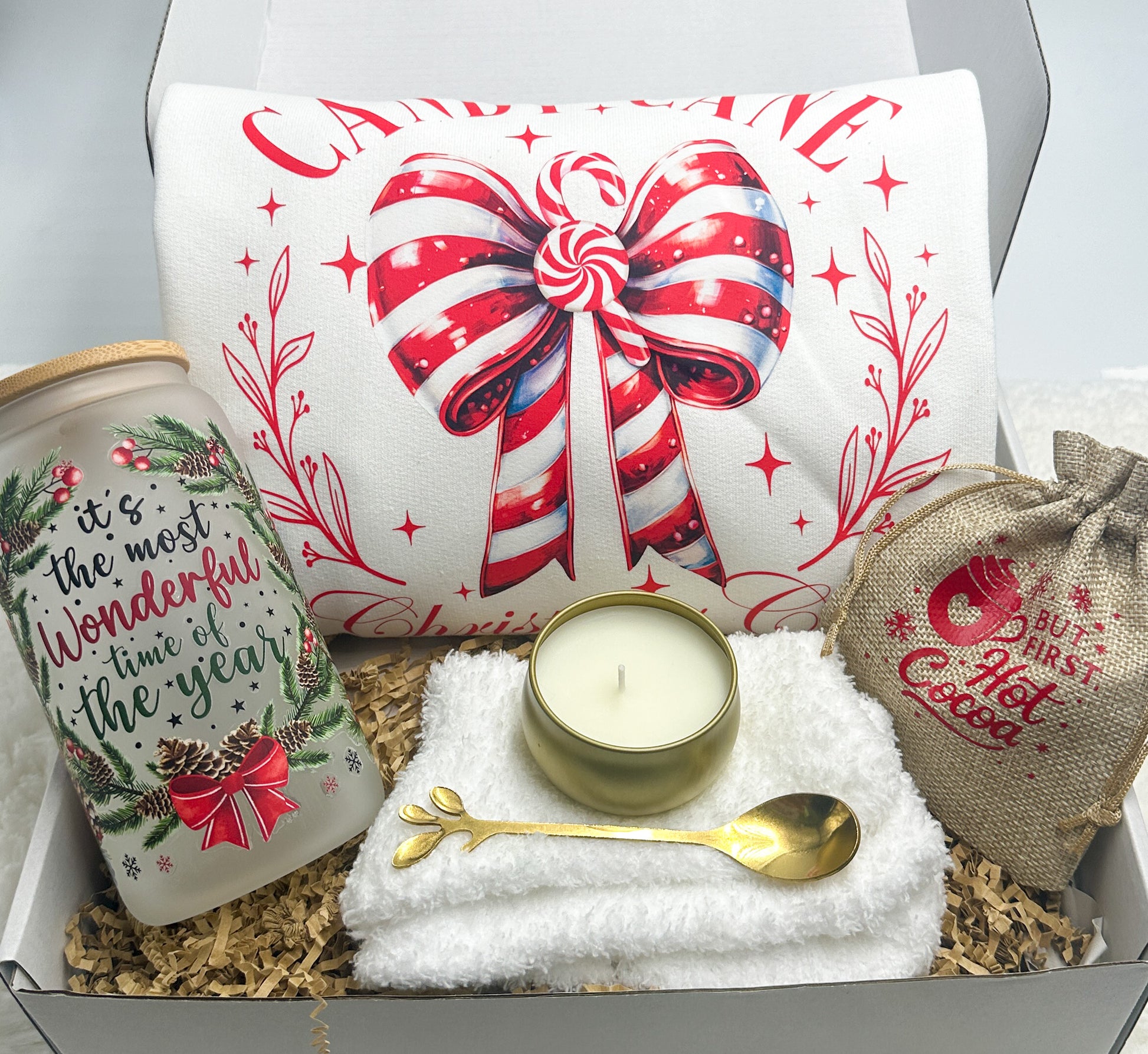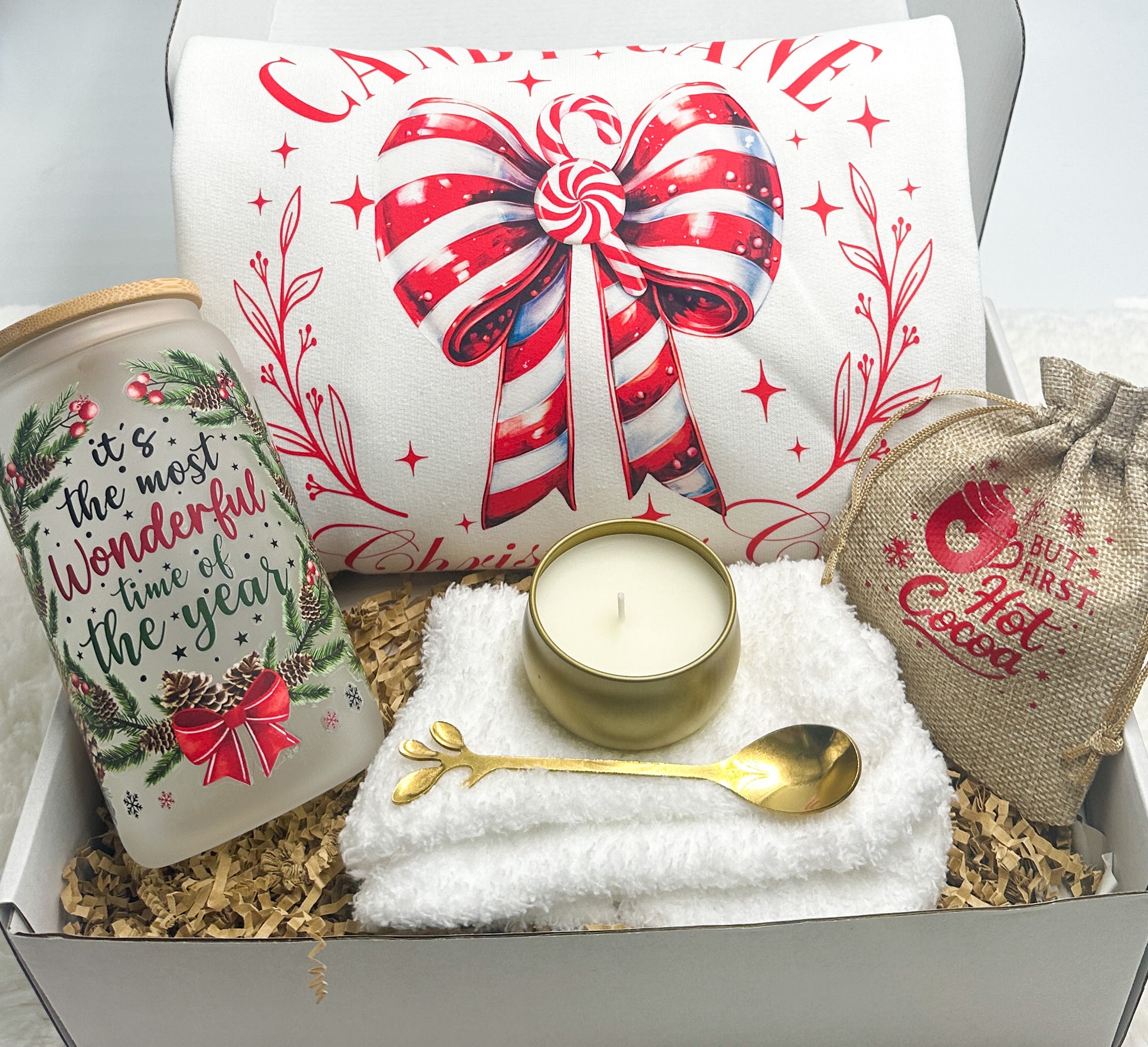 Indulge in the festive spirit with the Candy Cane Christmas Gift Box from GabsDoodleBugDesigns. This thoughtfully curated set includes a cozy Candy Cane Christmas club Sweatshirt, a luscious hot cocoa bag, warm fuzzy socks, a delightful candle, and a charming gold spoon. To top it off, enjoy the holiday cheer with our "It's the most wonderful time of the year" 16 oz tumbler. Perfect for gifting or treating yourself, this exclusive box embodies the warmth and joy of the season. Get yours today and experience the magic of Christmas with GabsDoodleBugDesigns.