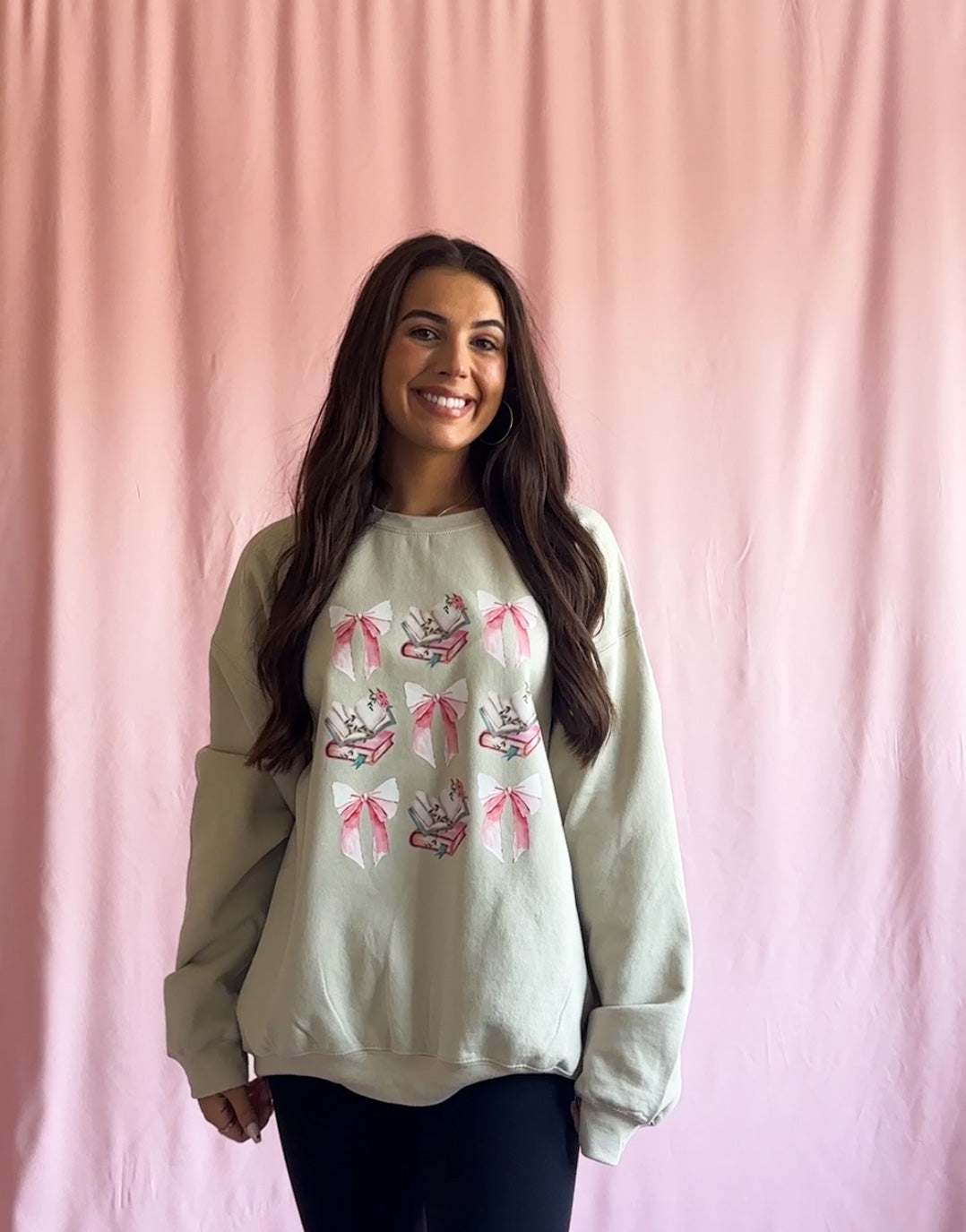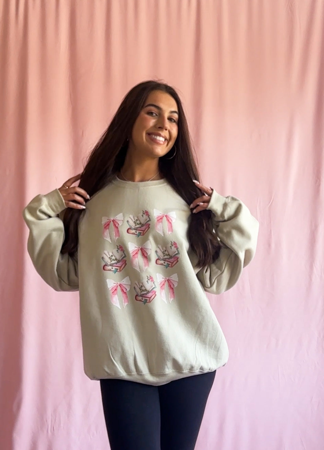 This sweatshirt features an all-over print of delicate pink bows and vintage books, making it the perfect addition to any book lover's wardrobe. This sweatshirt is perfect for lounging at home or running errands in style. The pastel pink color and playful print make it a fun and flirty option for casual outings, while the relaxed fit ensures maximum comfort. Show off your love for literature and style with this adorable coquette pink bow book sweatshirt.