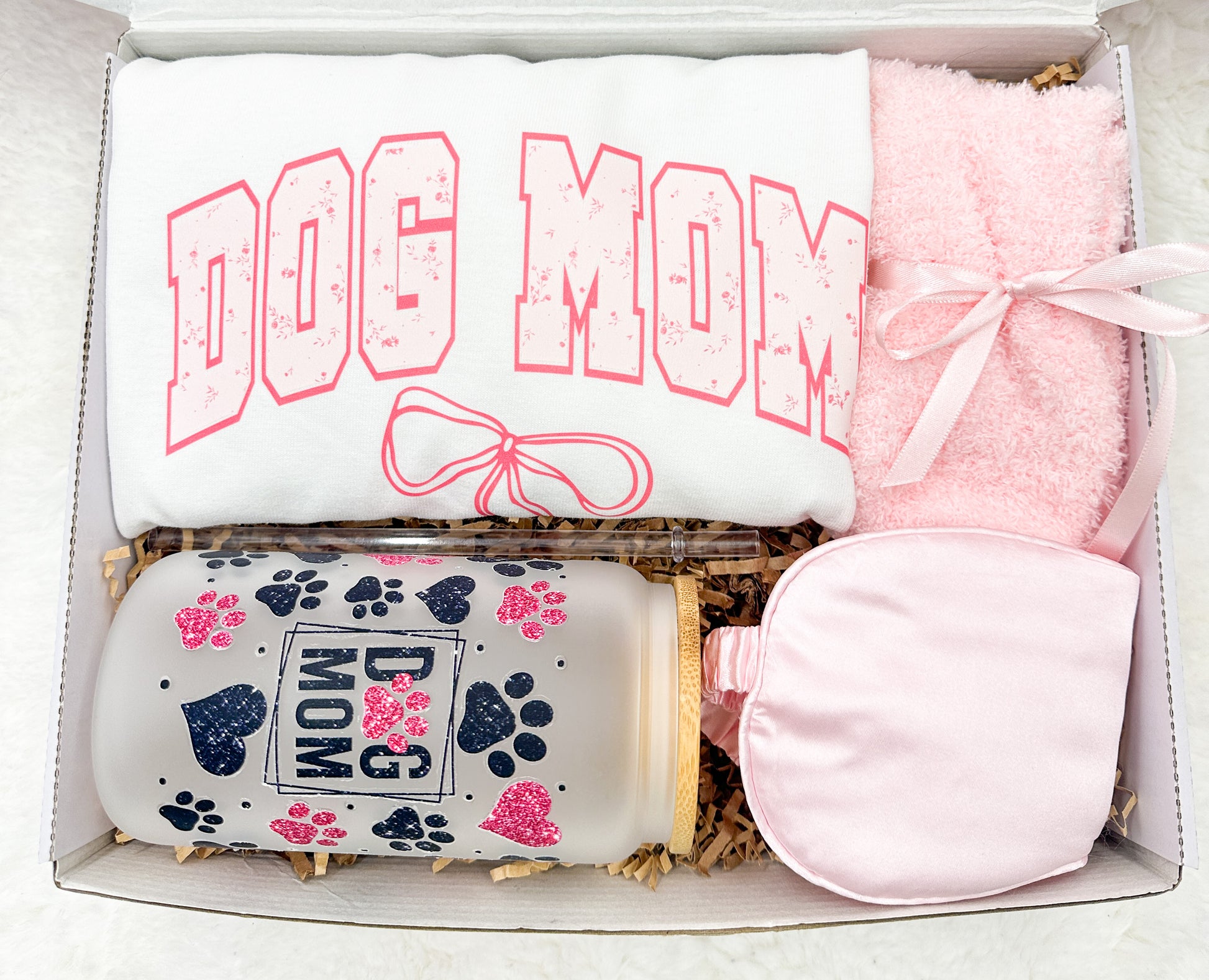 Spoil the dog mom in your life with our delightful Dog Mom Gift Box! This thoughtfully curated collection includes a cozy dog mom t-shirt, a stylish and practical 16 oz frosted tumbler, a luxurious sleep mask for those well-deserved afternoon naps, and a pair of super soft fuzzy socks to keep her toes warm on chilly evenings. Perfect for any occasion - whether it's a birthday, Mother's Day, or just because - this gift box is sure to bring joy to any dog mom's heart. Show your appreciation for the special dog mom in your life with this fabulous gift box!