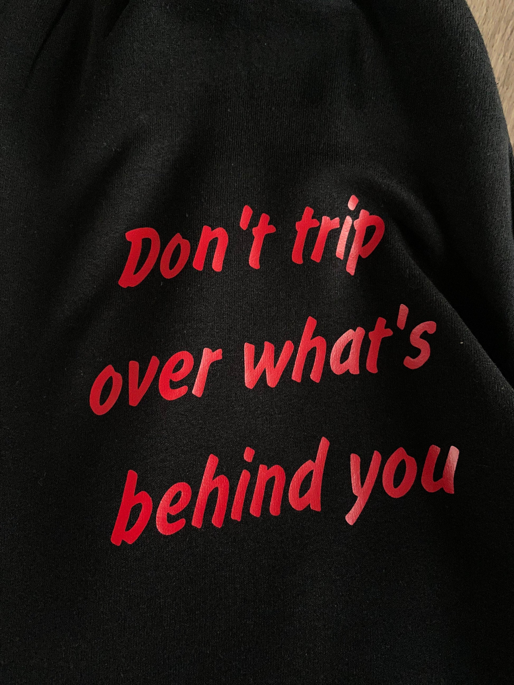 Stay comfy and stylish in the Don't Trip Over What's Behind You Sweatpants. These lightweight sweatpants are perfect for lounging at home, running errands, or working out. The "Don't trip over what's behind you" graphic is a fun reminder to stay mindful.