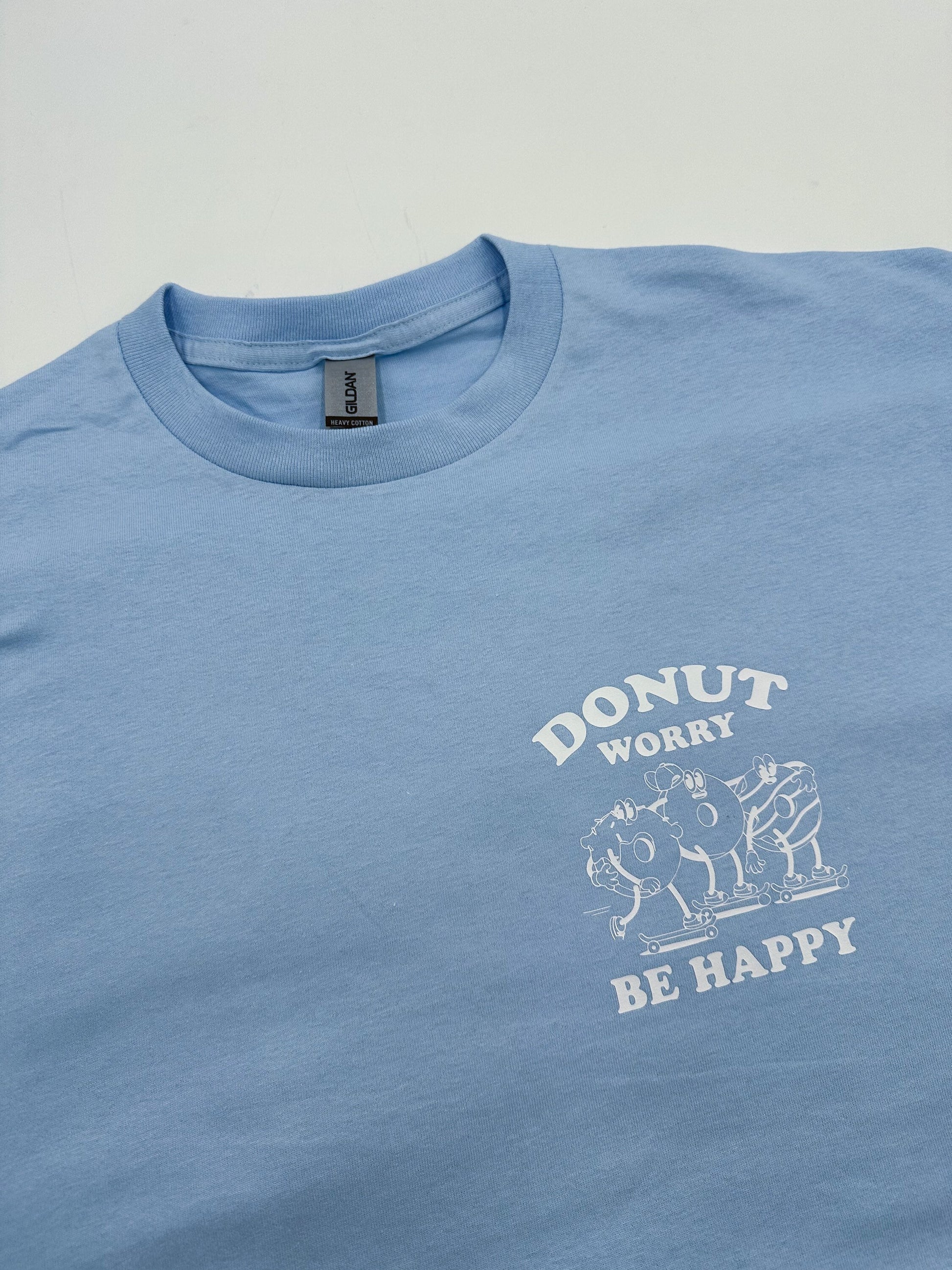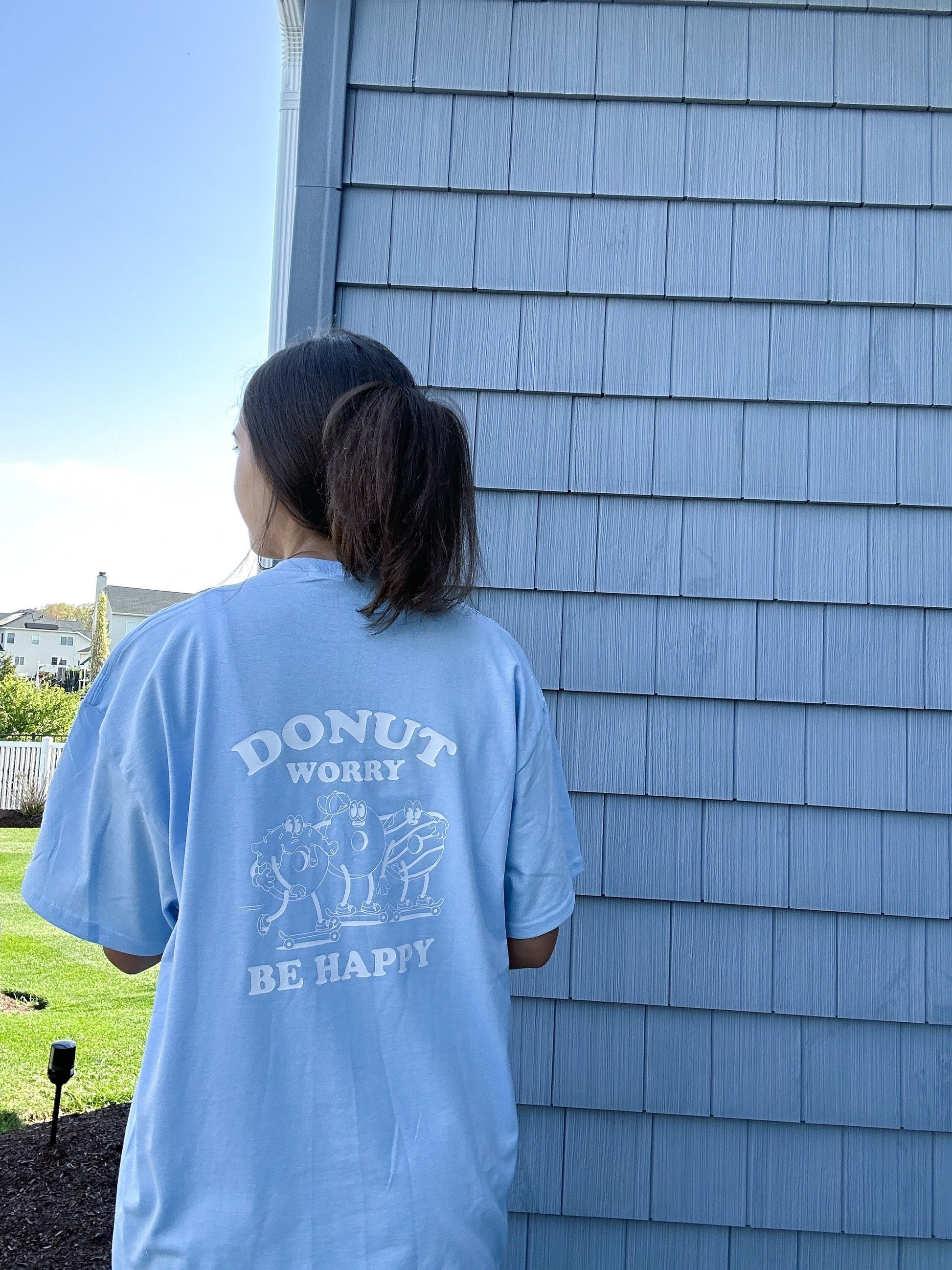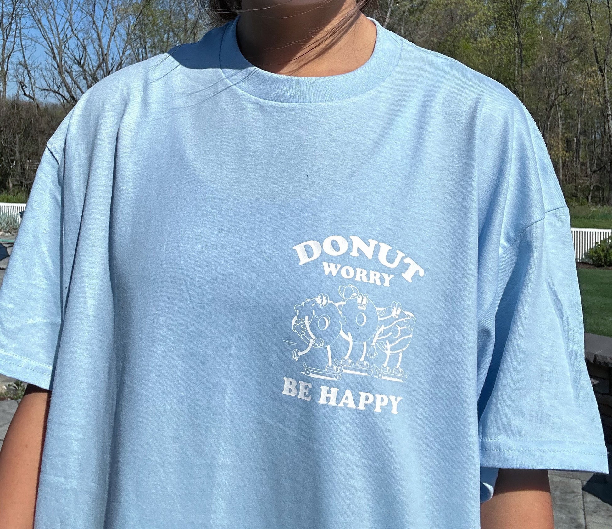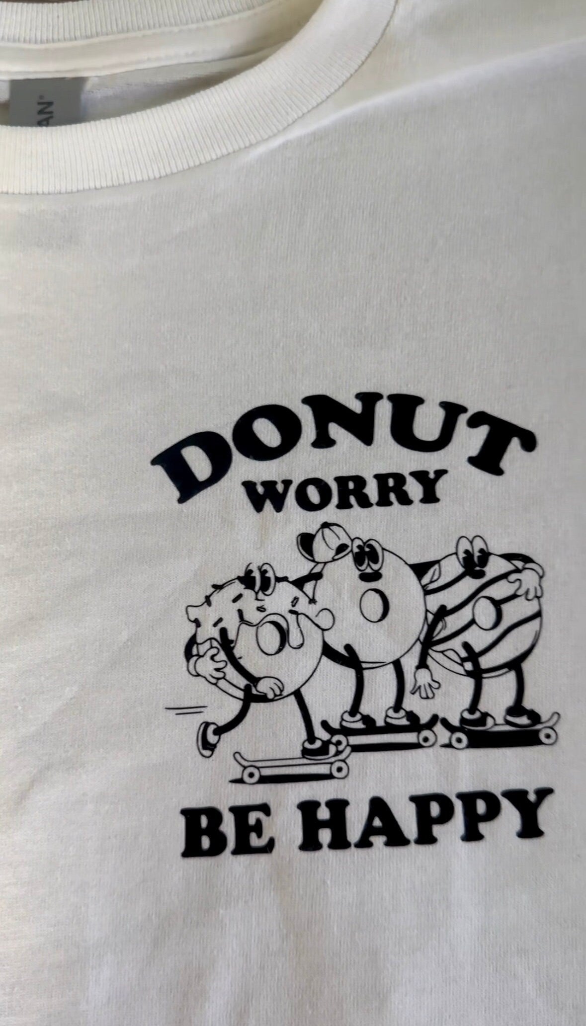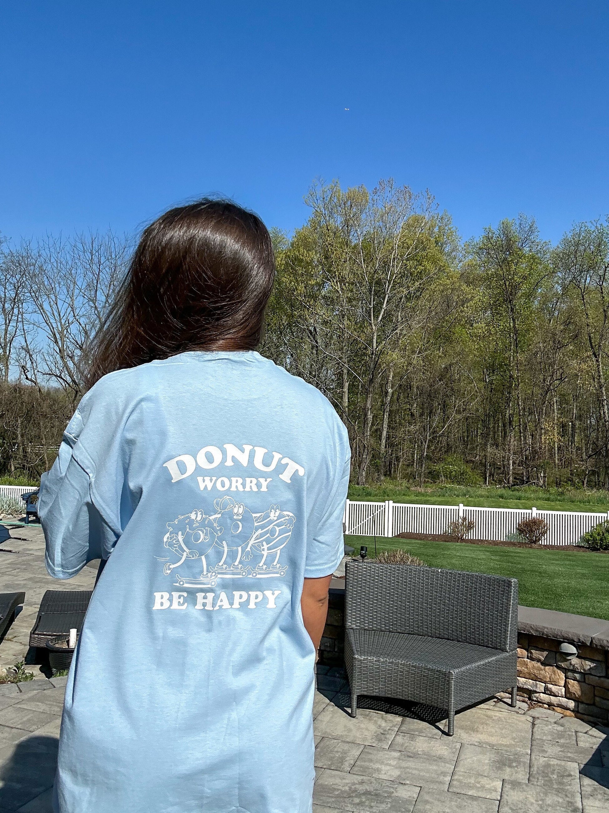 This "Donut Worry, Be Happy" Tshirt will give you the perfect boost of positivity. Designed with a cheeky donut motif, this relaxed-fit shirt is perfect for casual days.
