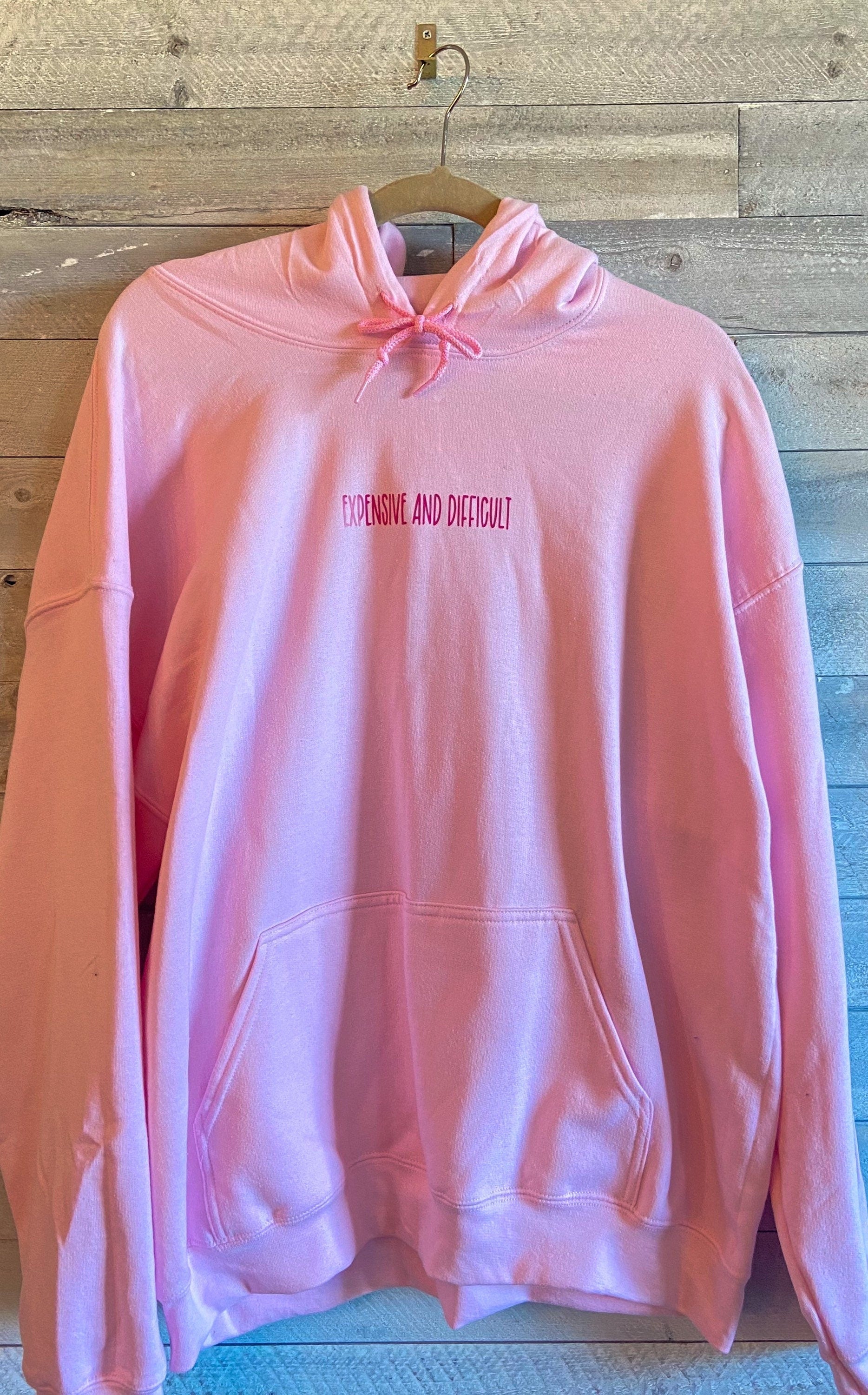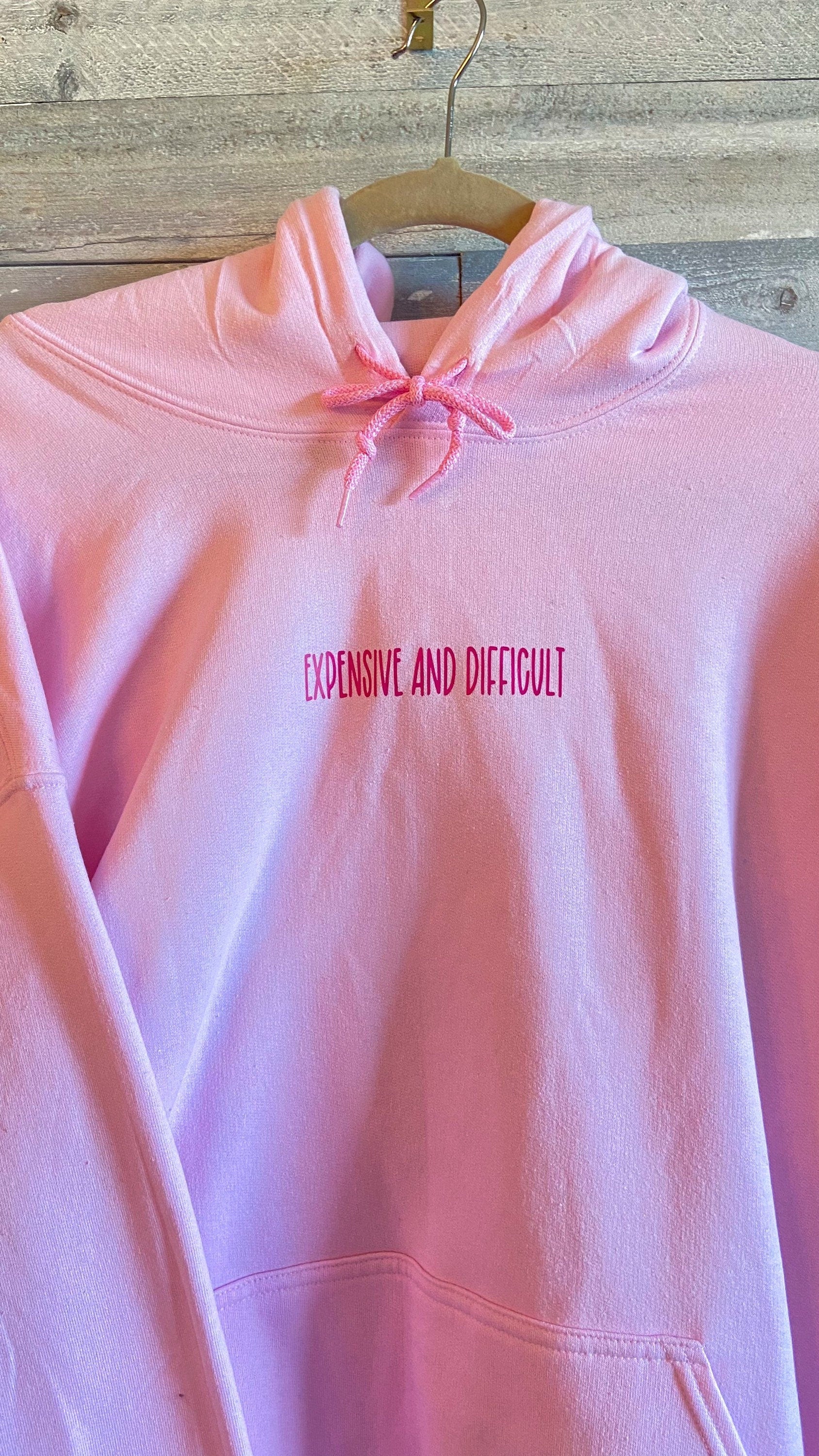 This stylish pink hoodie is the perfect addition to your summer wardrobe. The "expensive & difficult" sweatshirt offers a unique and trendy look with its oversized design and funny sarcastic statement. Perfect for fashion-forward ladies, this aesthetic hoodie is sure to be an eye-catching statement piece.