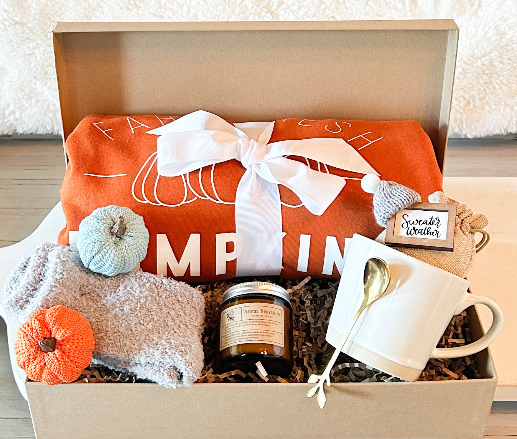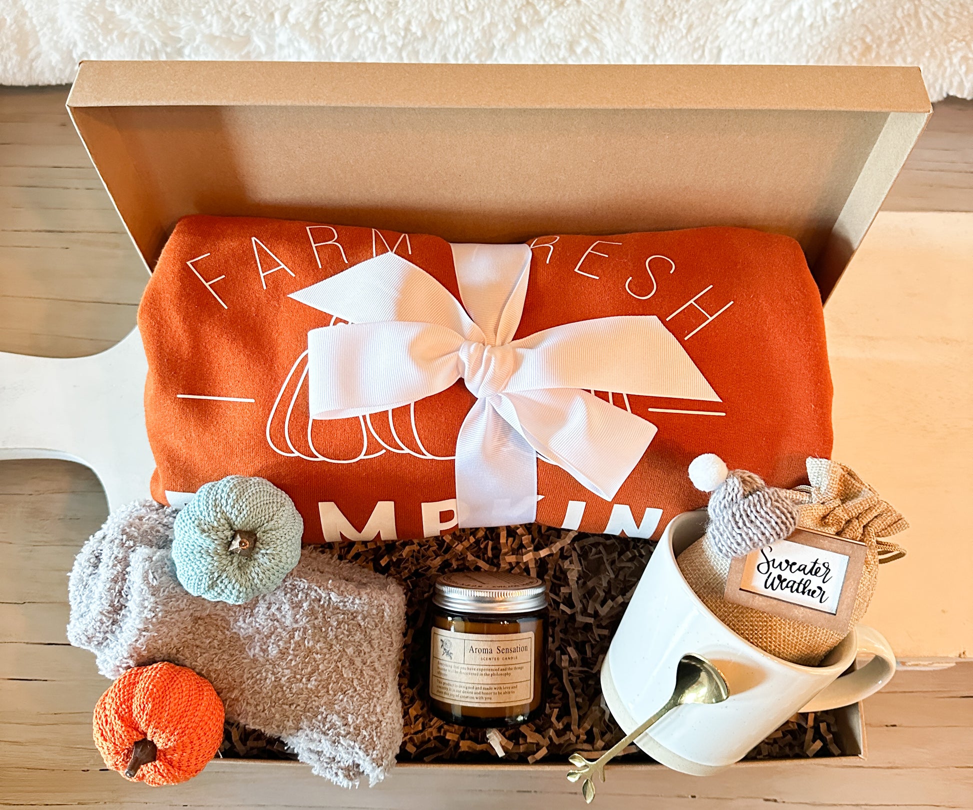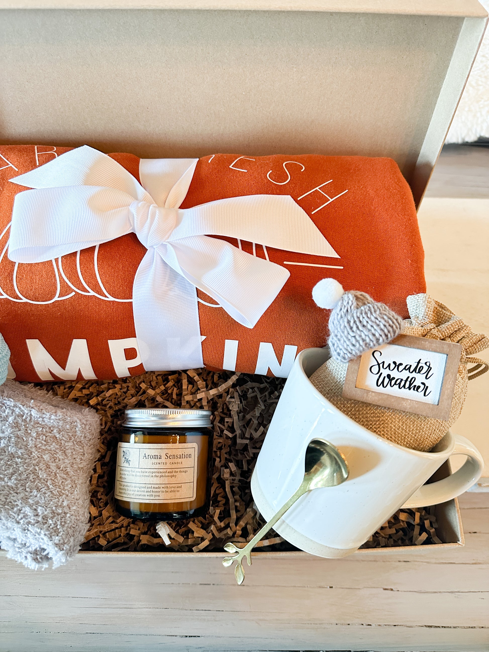 This Fall Gift Basket is the perfect way to enjoy the season. It includes a cozy "Farm Fresh Pumpkins" sweater, fuzzy socks to keep your feet warm, a "Sweater Weather" mini sign, a luxurious candle, a mug with spoon, and a burlap bag with a beverage. Treat yourself and explore the season!