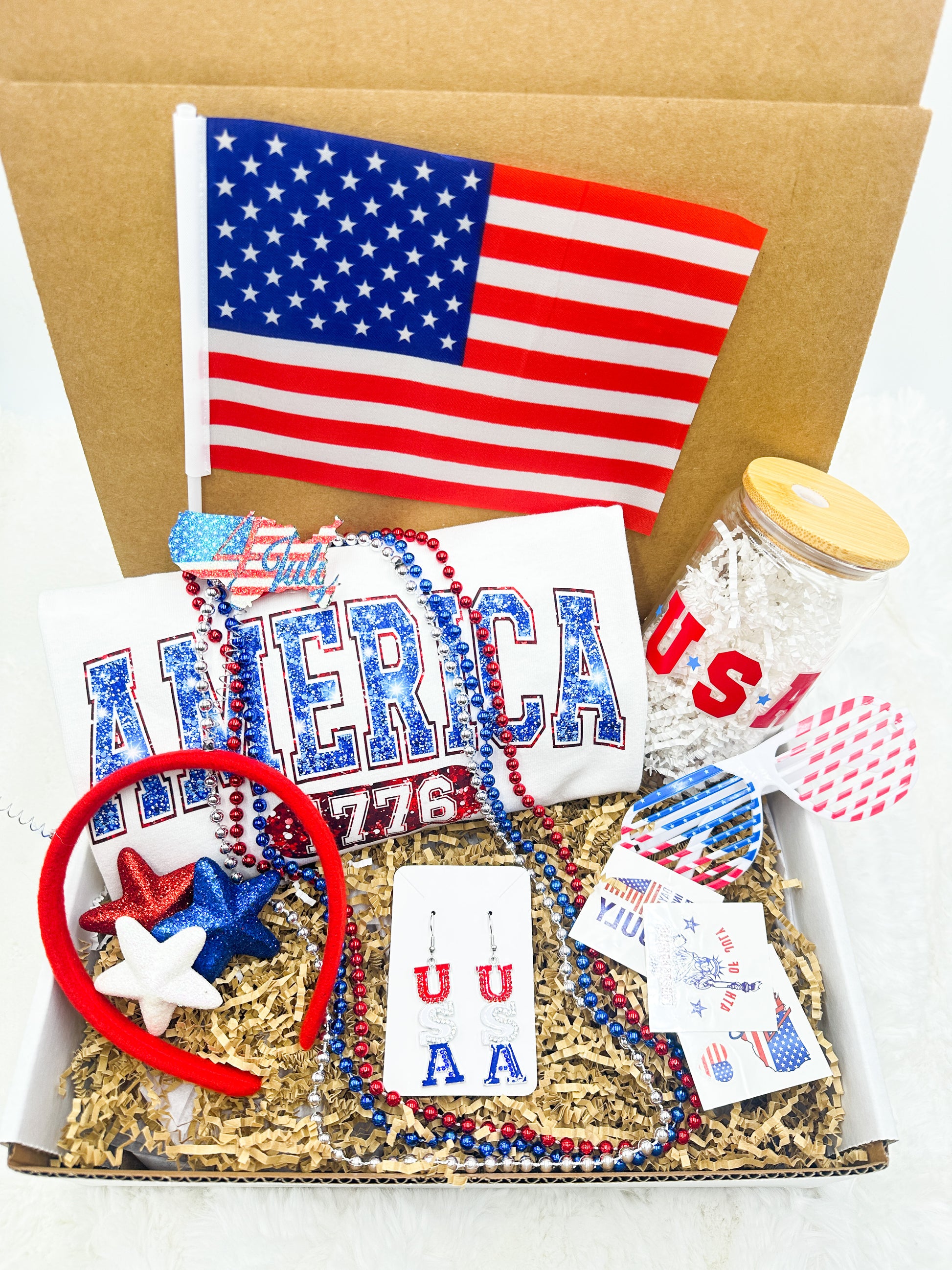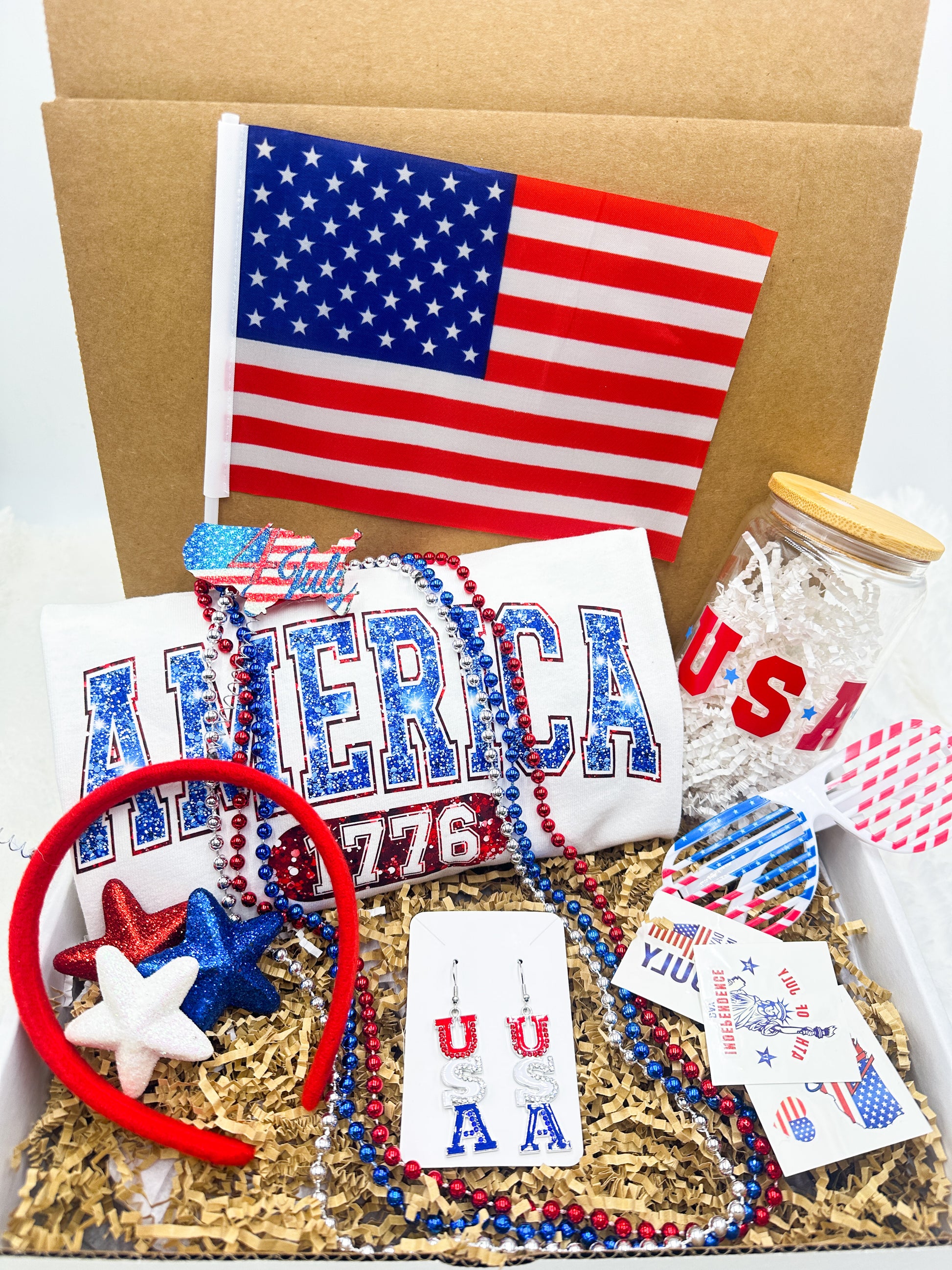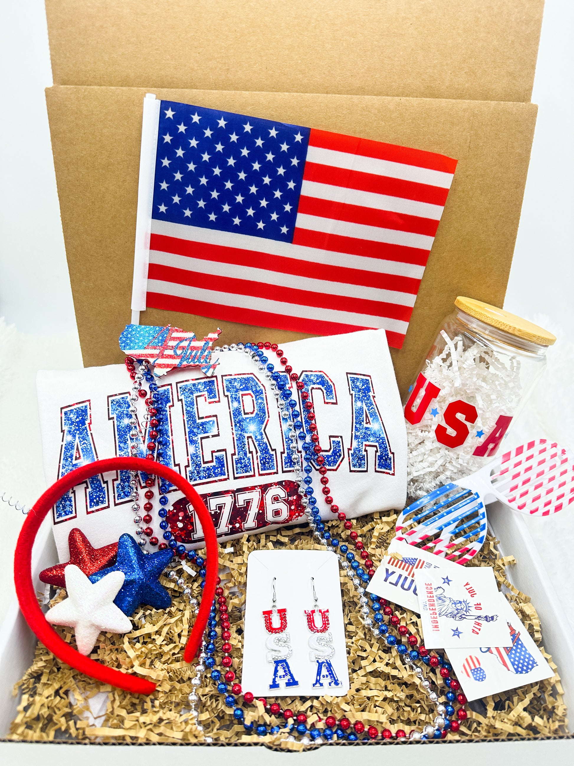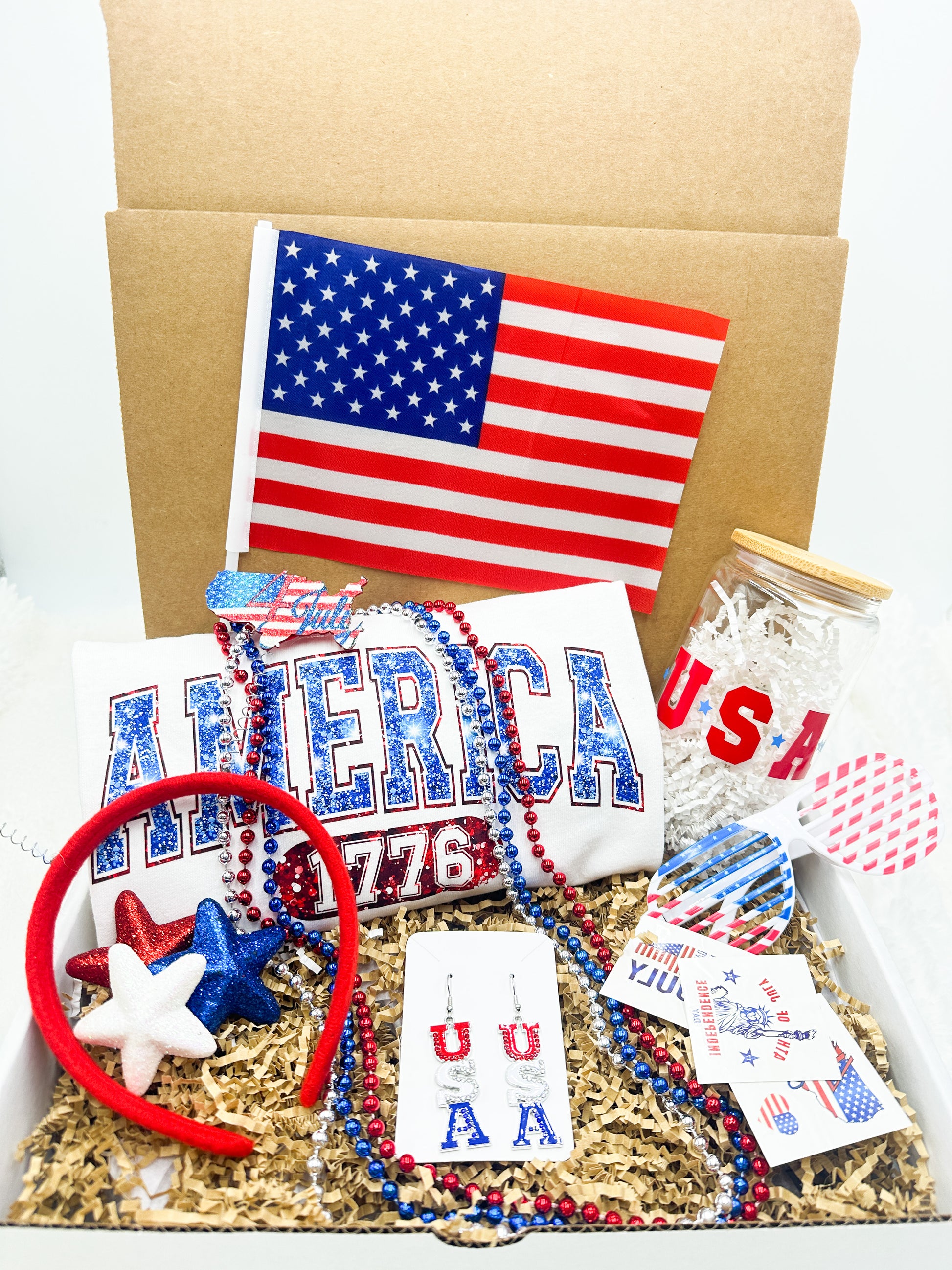 Celebrate the spirit of freedom and patriotism with this festive Fourth of July Gift Basket! Packed with everything you need to shine bright during your Independence Day celebrations, this basket features a fun and sparkly t-shirt with a bold "America" graphic that will make you stand out. Stay refreshed in true red, white, and blue style with a 16 oz USA tumbler, perfect for all your favorite drinks. Show off your patriotic side with a collection of assorted earrings and temporary American tattoos, adding that perfect finishing touch to your outfit. Adorn yourself with red, white, and silver bead necklaces and a variety of Fourth of July-themed headbands, featuring the stars and stripes. And don't forget the American flag glasses to complete your all-American look! Whether you're hosting a BBQ, heading to a parade, or just enjoying the fireworks, this gift basket has everything you need to celebrate in style.