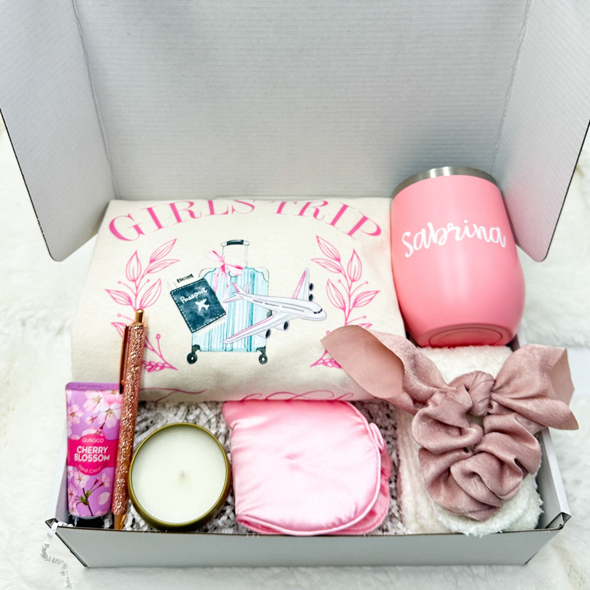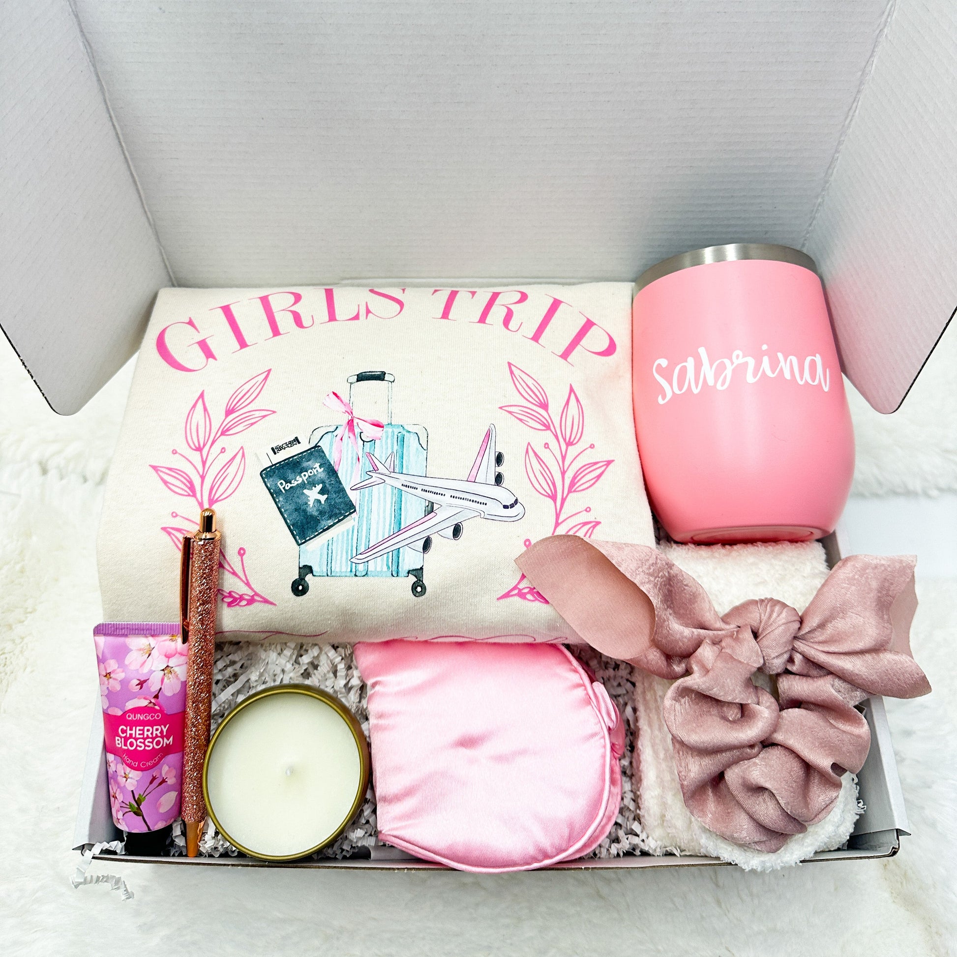 This fun and thoughtful gift box is the ultimate treat for your next girls' trip! Inside, you'll find a stylish "Girls Trip" shirt that’s perfect for making memories with your best friends. Sip in style with a custom-name wine tumbler, ideal for toasting to all your adventures. The scrunchie and hair tie will keep your hair in place while you're on the go, and the pink pen adds a touch of playful charm. After a long day of fun, pamper yourself with the luxurious hand lotion and slip into the softest fuzzy socks for ultimate relaxation. Whether you're heading out for a weekend getaway or just reminiscing about past trips, this box has everything you need for the perfect girls' trip experience!