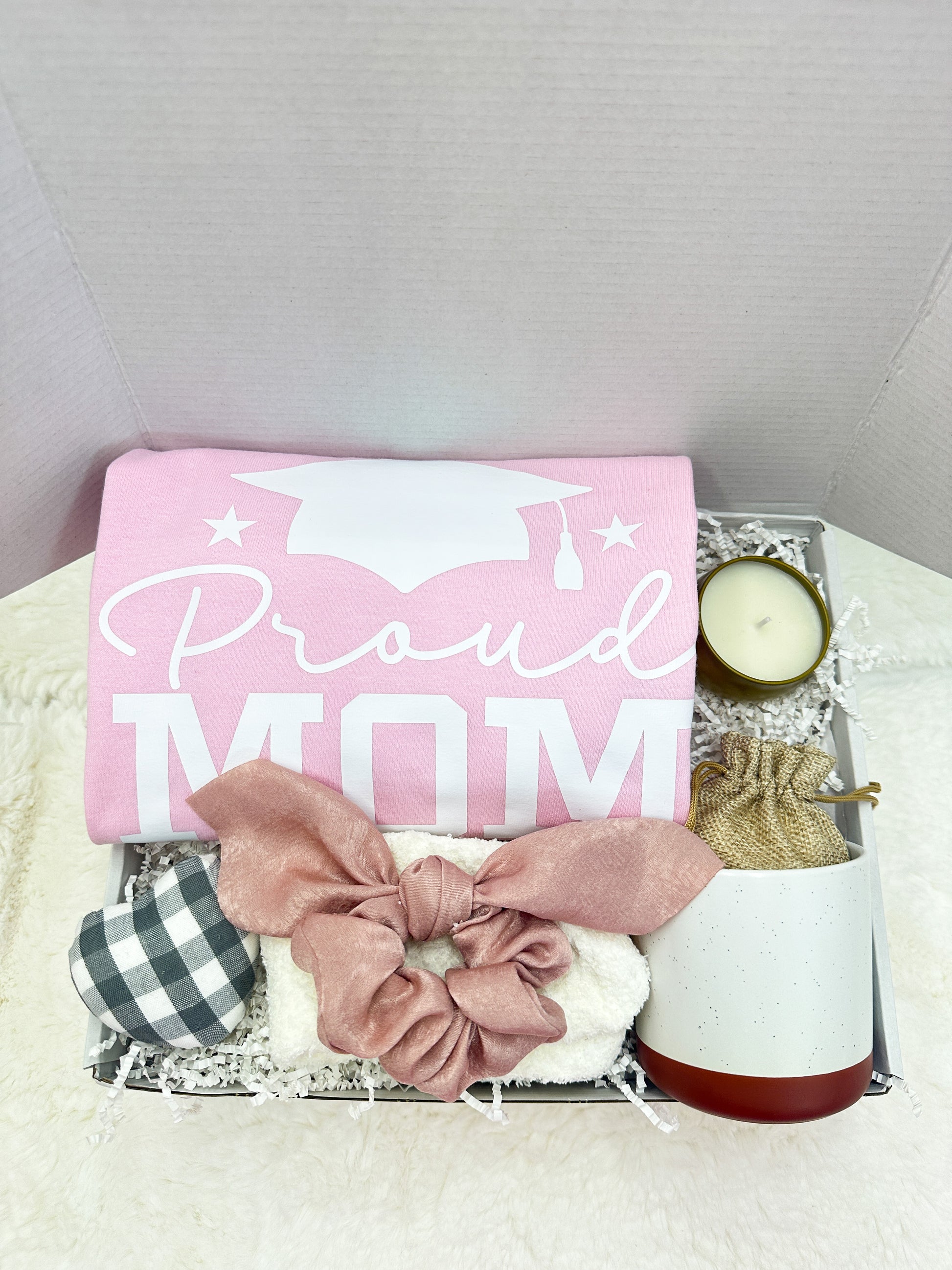 Celebrate the special milestone of graduation with this thoughtfully curated Graduation Mom Gift Box! The box includes a soft pink "Proud Mom" t-shirt, a perfect way for her to proudly wear her heart on her sleeve. There's also a matching mug for her to enjoy a warm drink while reflecting on her child's achievement. Cozy fuzzy socks will keep her comfy as she takes in the excitement of the day, and the burlap bag filled with a beverage adds a refreshing touch. A heart-shaped desktop decoration serves as a sweet reminder of the love and pride she feels, while the soothing candle helps her unwind and savor the moment. This gift box is the perfect way to honor a mom who’s been with her graduate every step of the way!
