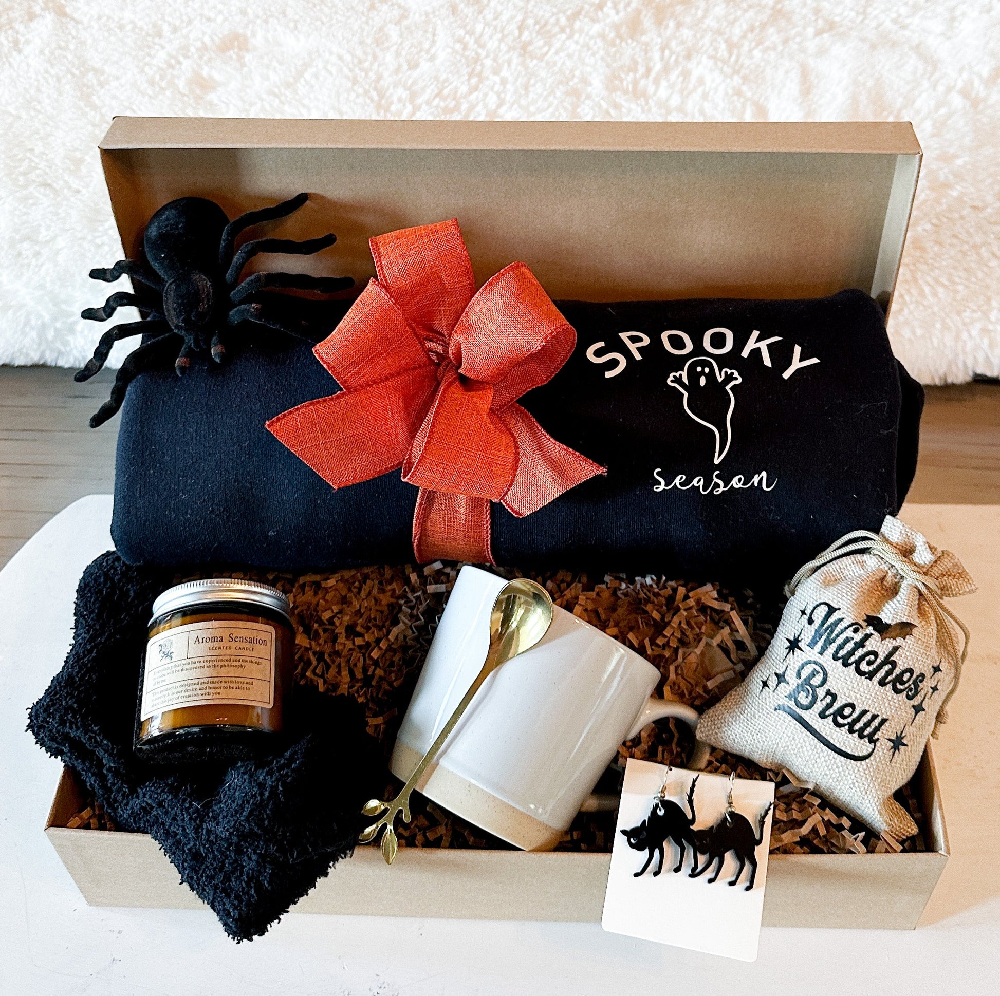 Everyone deserves to be gifted a spooky basket for the Halloween season. All the spooky necessities are embodied in this box. This includes a spooky season sweatshirt, socks, a candle, a mug and spoon, a burlap bag with tea, and handmade black cat earrings.