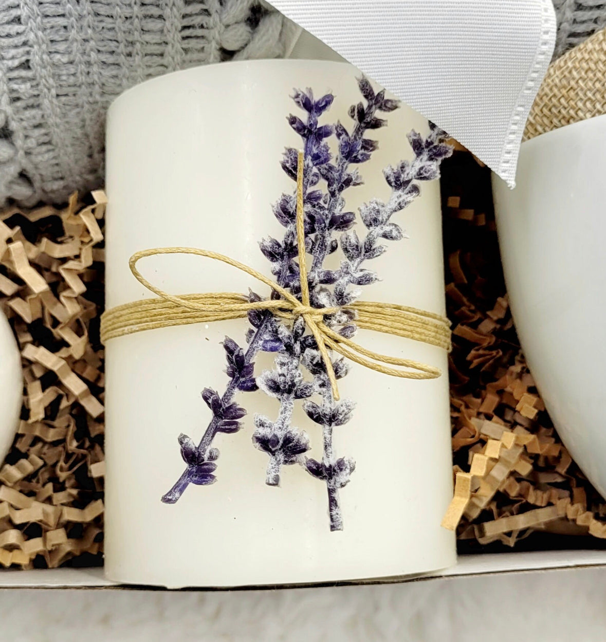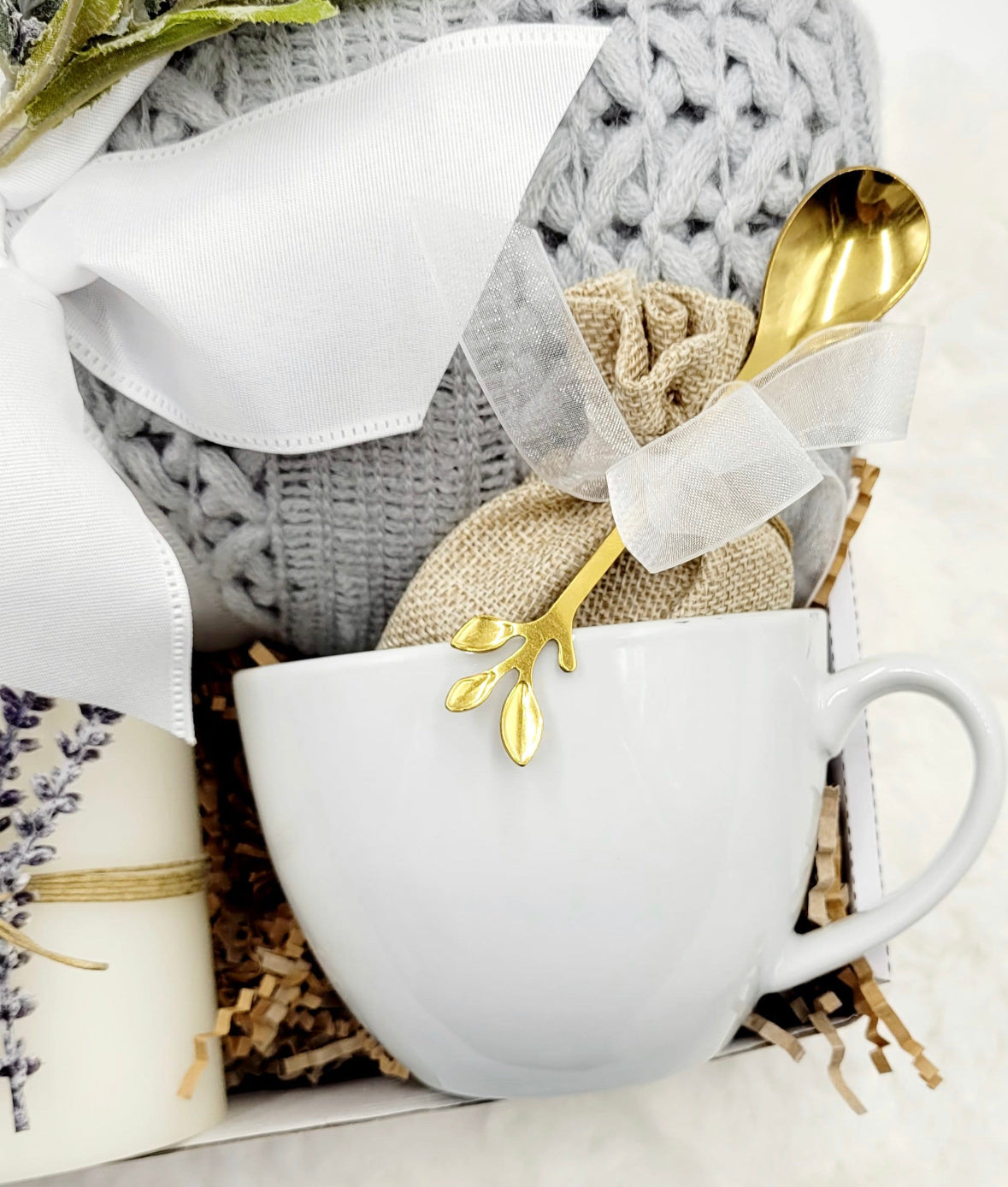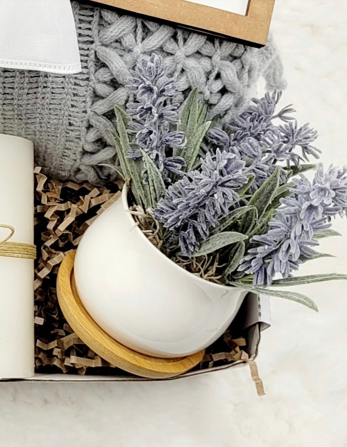 Our Lavender Gift Basket contains a selection of high-quality items to bring relaxation and serenity to any home or office. The basket includes a cozy blanket, a stylish mug with a gold spoon, a burlap bag with a special beverage, a faux lavender pot, a "live a good story" wood sign, and a battery-operated candle. Perfect for any occasion.
