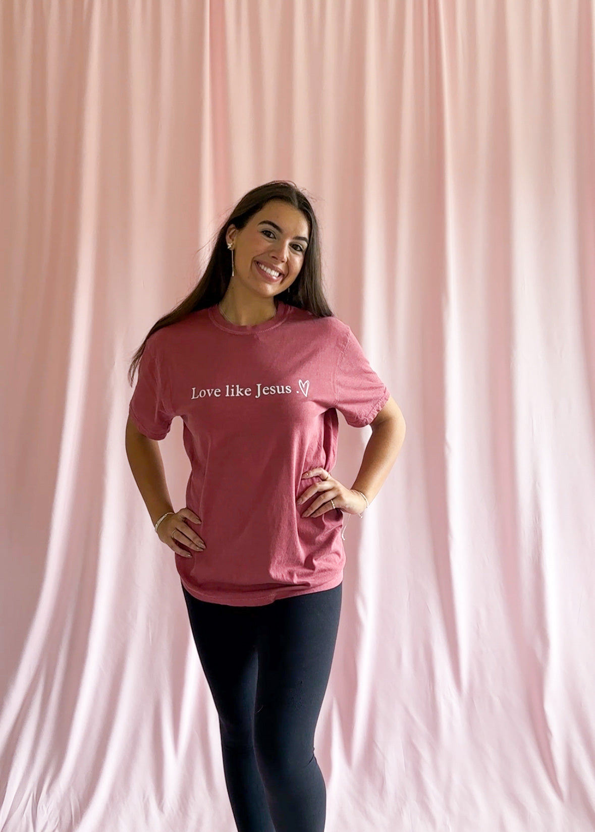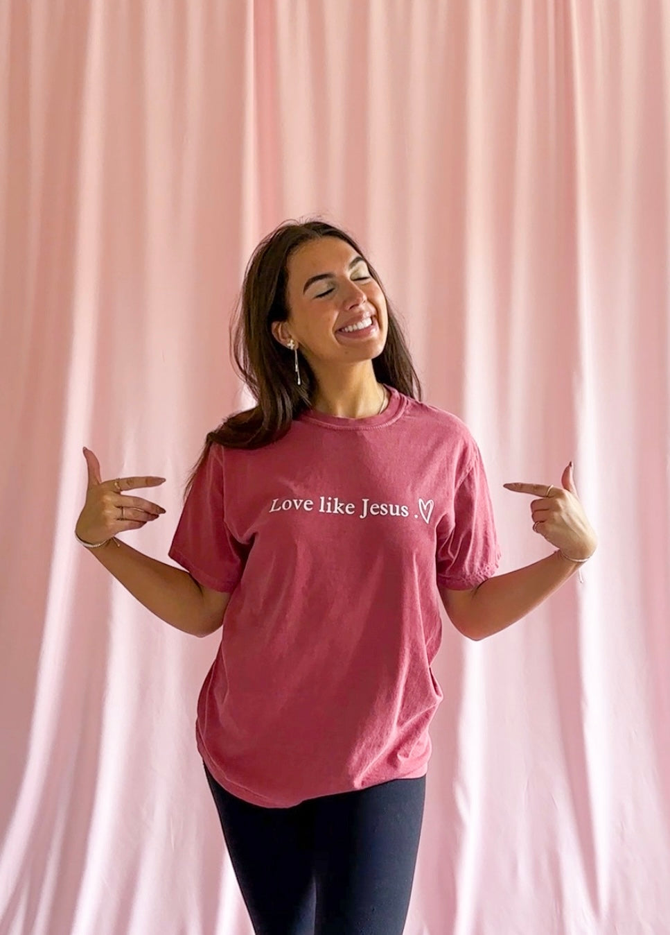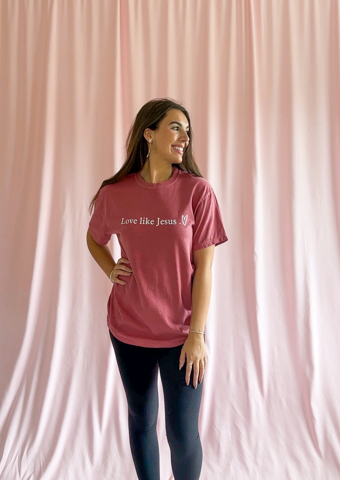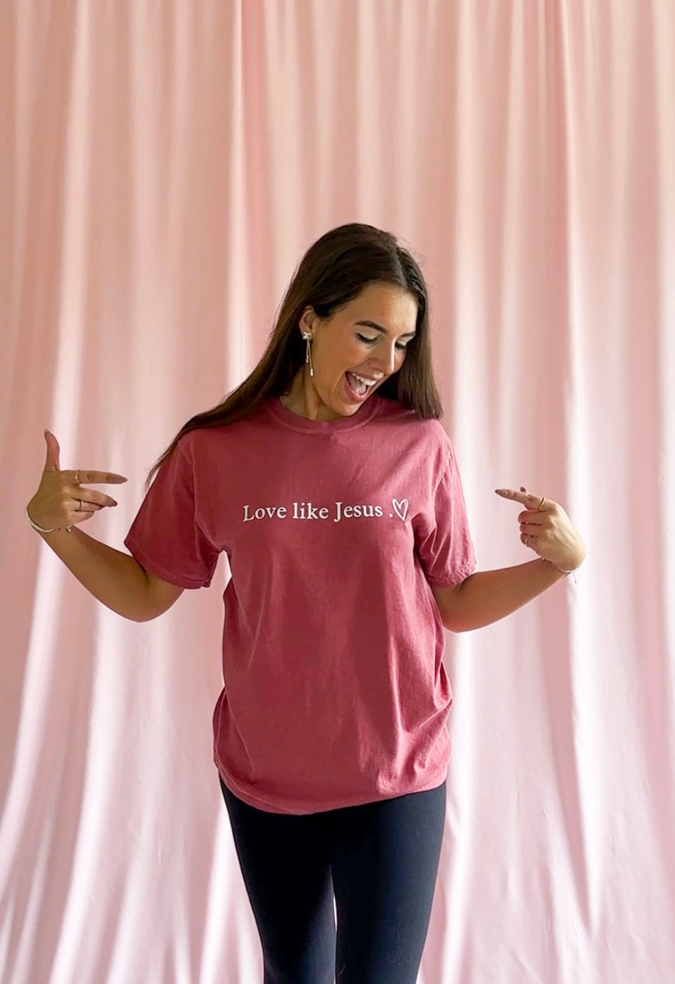 Show your love for Jesus with this stylish and comfortable Love Like Jesus tshirt. This shirt features a heart graphic and a powerful message that will inspire those around you. Made from soft and breathable fabric, this tshirt is perfect for everyday wear or casual outings. For an oversized look, consider sizing up when ordering. Spread love and positivity with this beautiful Christian tshirt that will make a great addition to any woman's wardrobe.
