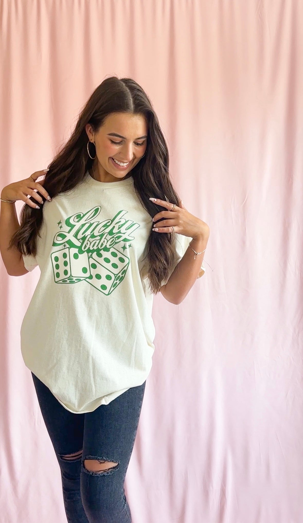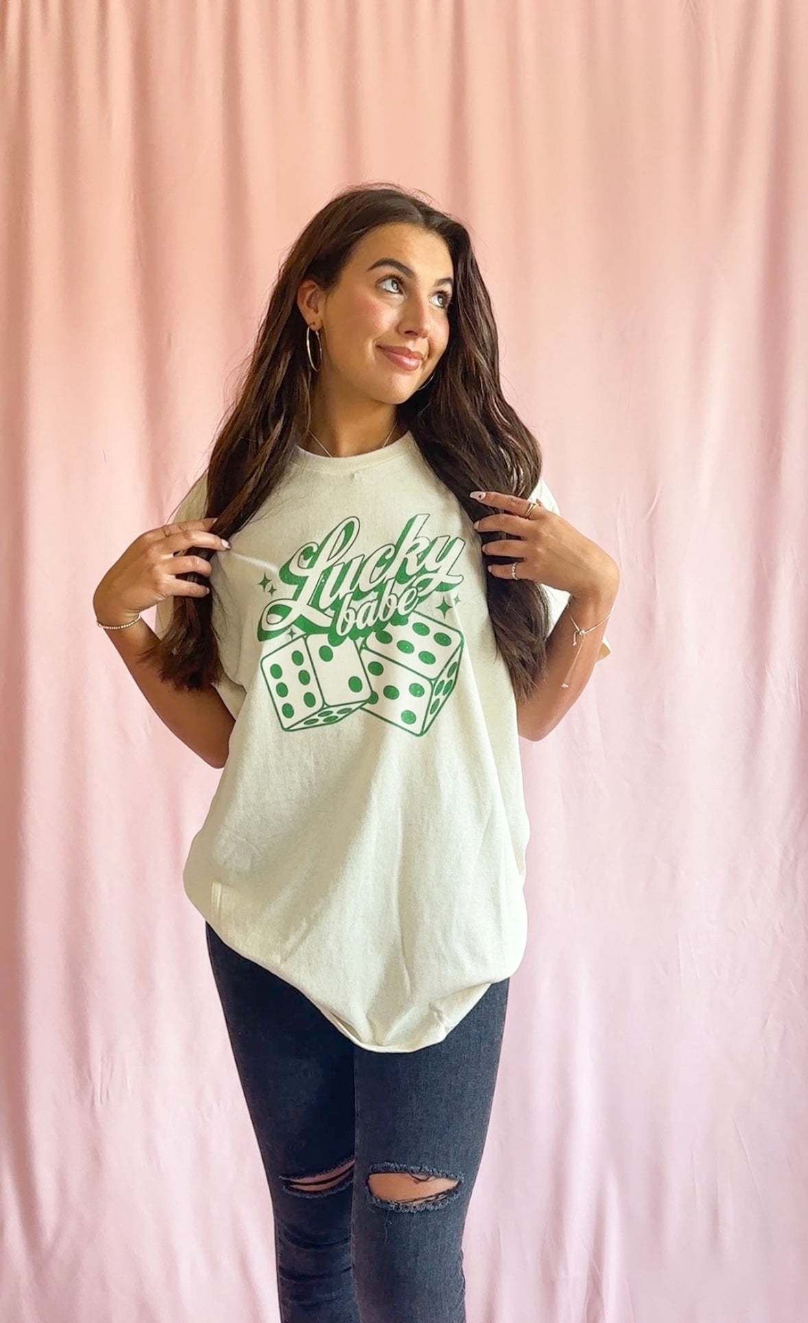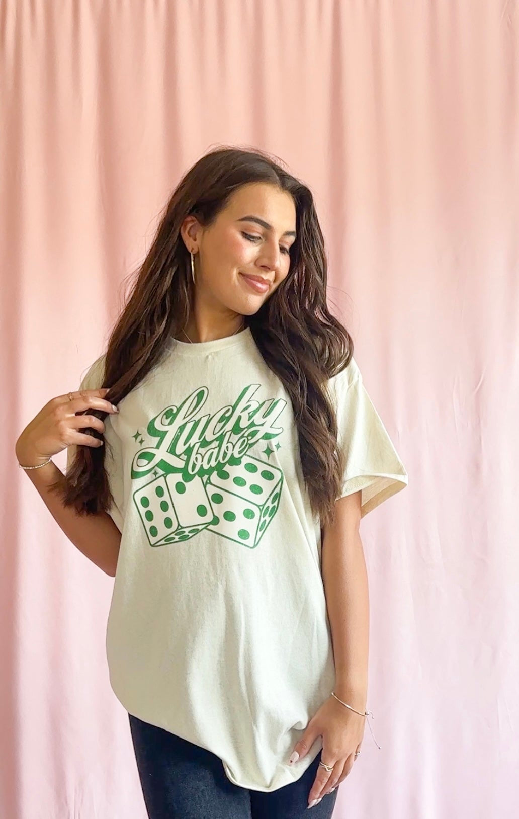 Get lucky in our Lucky Babe Shirt! This fun and playful t-shirt is perfect for celebrating St. Patty's day or any day you're feeling lucky. The vibrant green color and playful dice design make it a standout piece for any casual outfit. For an oversized and relaxed look, we recommend sizing up. Made from high-quality, comfortable fabric, this shirt will be your new go-to for adding a touch of luck to your wardrobe. Add some fun to your closet with our Lucky Babe Shirt!