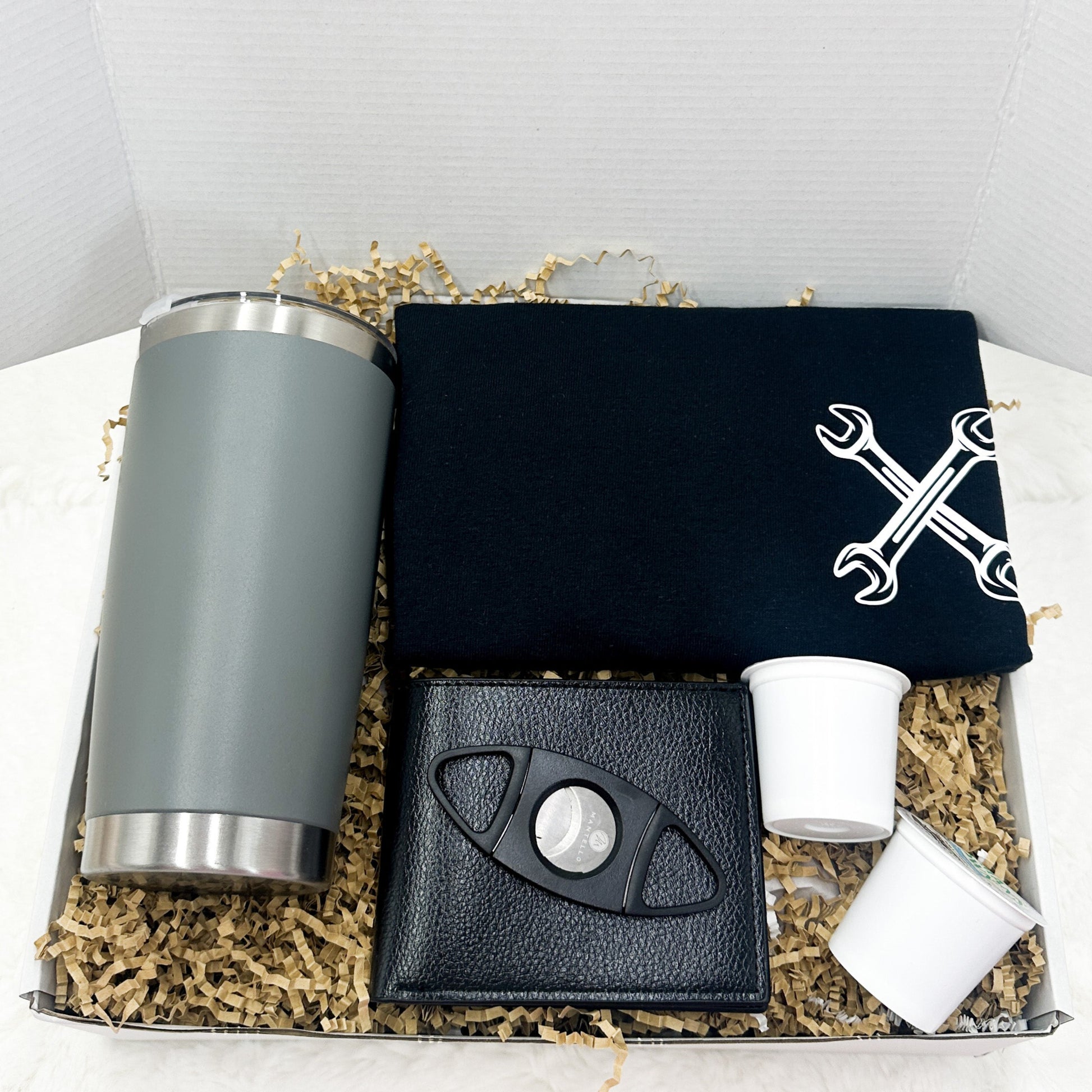 This Men’s Gift Box is the ultimate blend of style, relaxation, and practicality. It includes a unique t-shirt featuring a bold wrench design, perfect for a casual yet cool look. For those mornings that need a little extra boost, a rich, flavorful coffee will keep him energized. The sleek grey tumbler ensures his beverage stays at the perfect temperature while he's on the go. A high-quality cigar cutter is included for those moments when he wants to unwind and enjoy a premium cigar, and a stylish wallet adds both functionality and sophistication to his everyday essentials. This thoughtfully crafted gift box is sure to impress any man who appreciates both comfort and style.