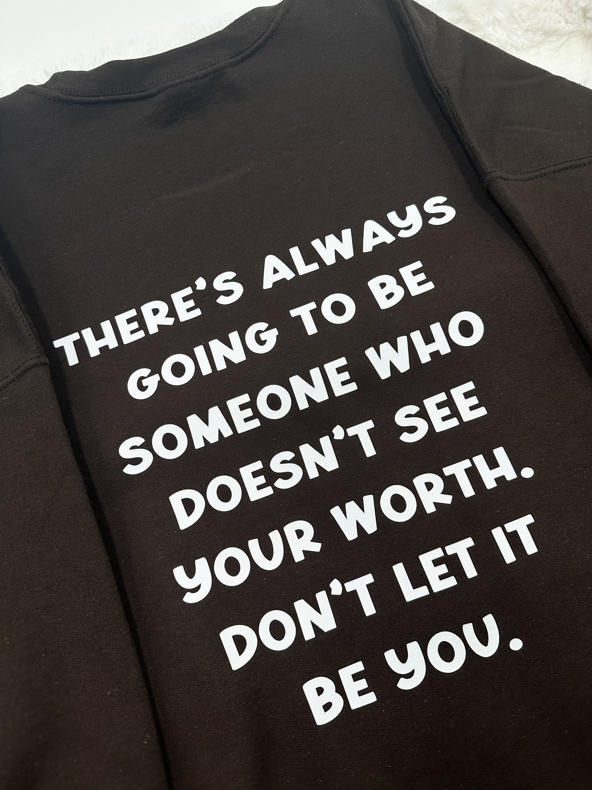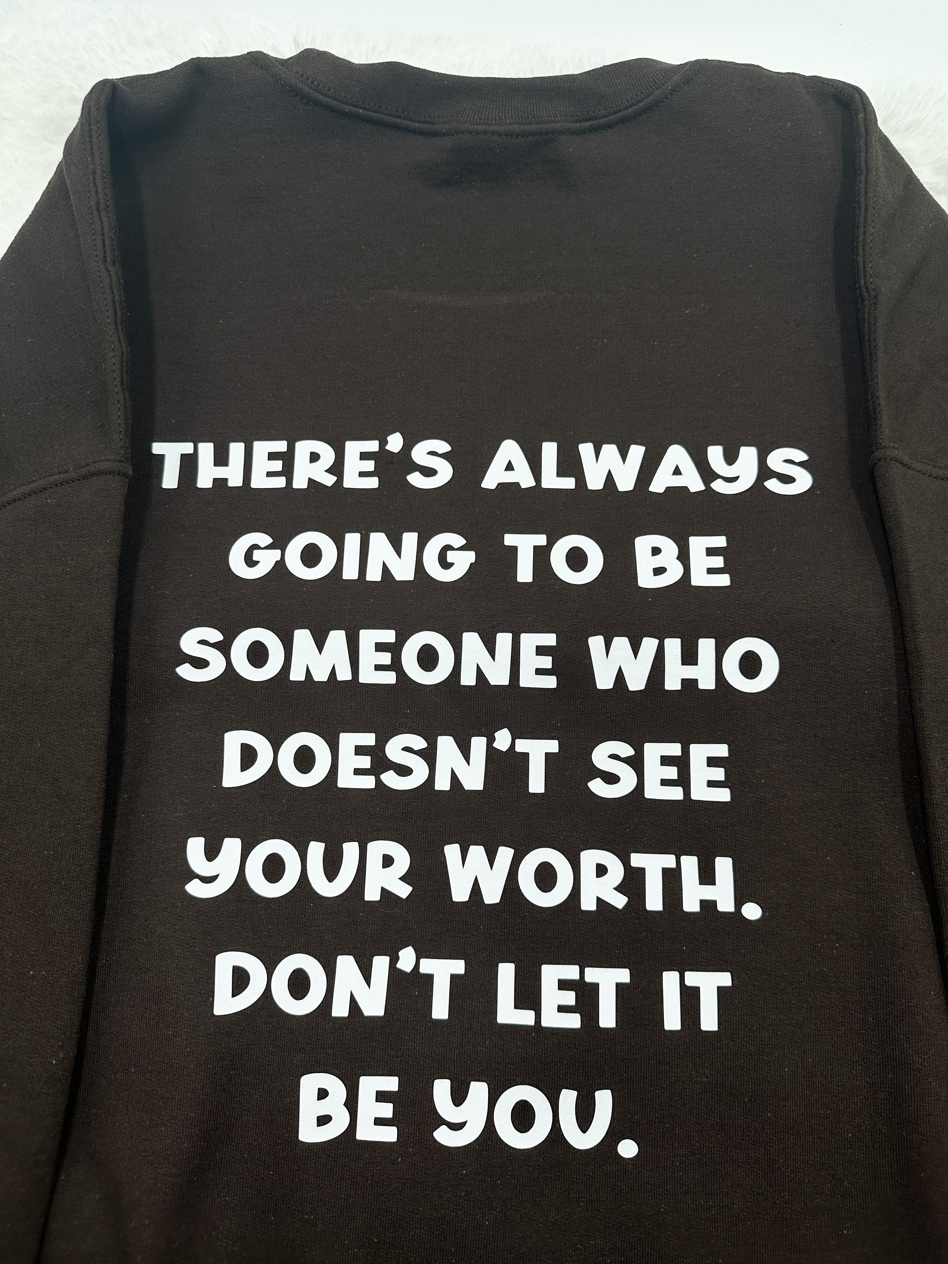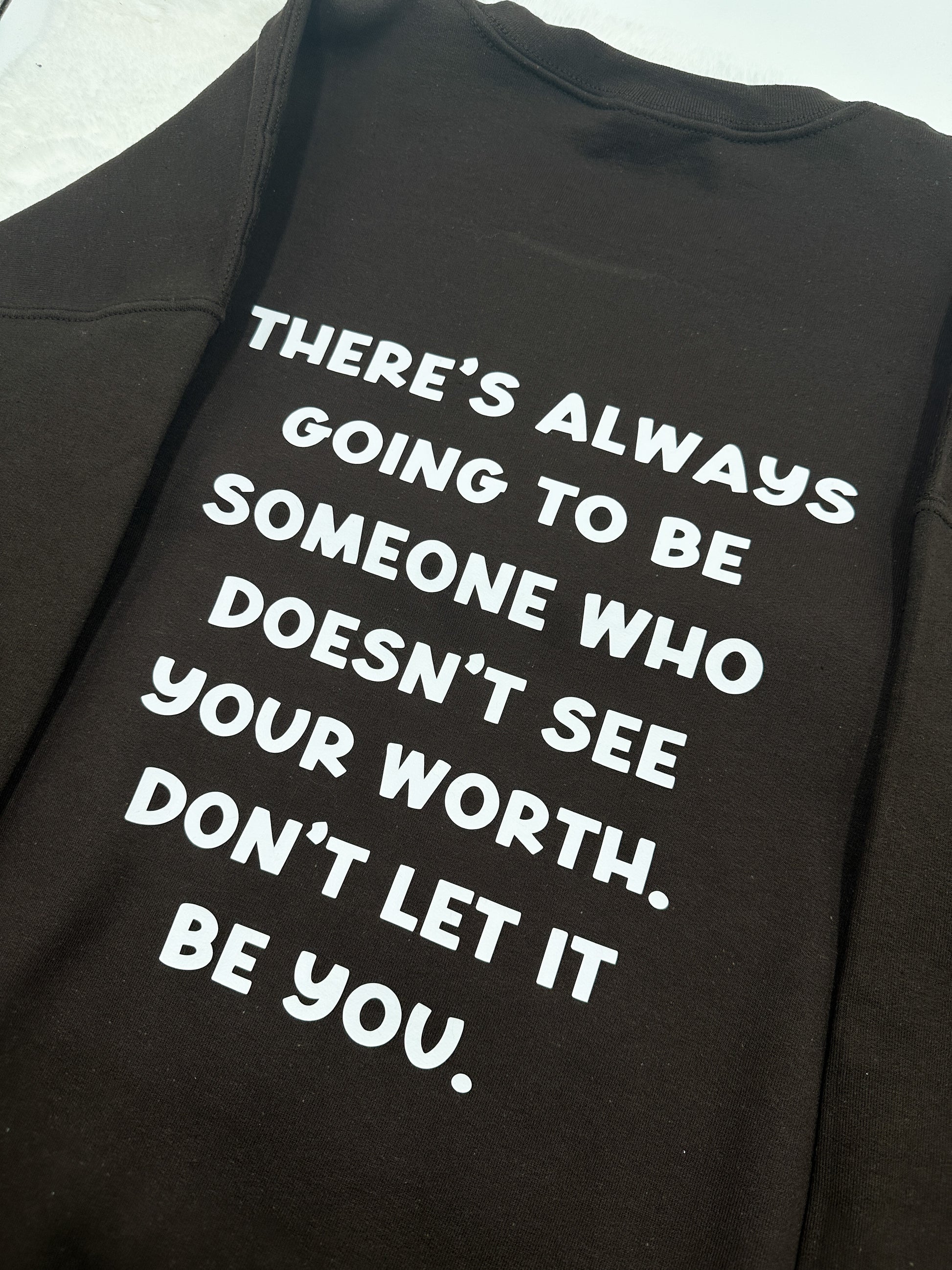 Introducing our motivational crewneck sweatshirt, perfect for those days when you need a little extra encouragement. Featuring the inspiring message "There's always going to be someone who doesn't see your worth. Don't let it be you." This sweatshirt is both trendy and cute. Available in a range of sizes, we recommend sizing up for an oversized look. Made from high-quality materials, you can wear it for all your daily activities.