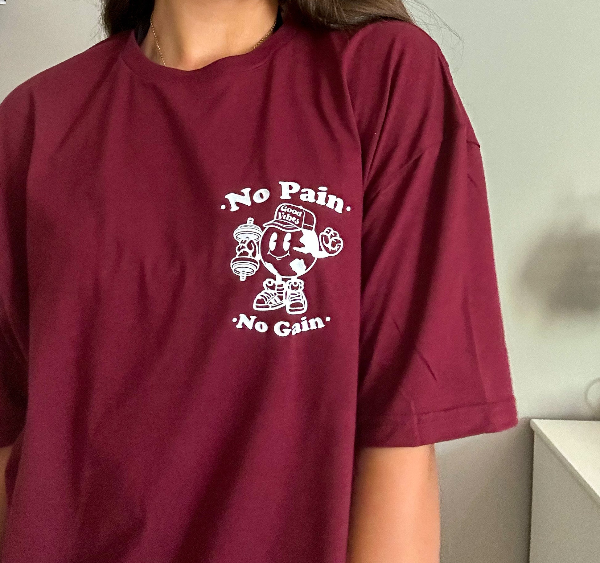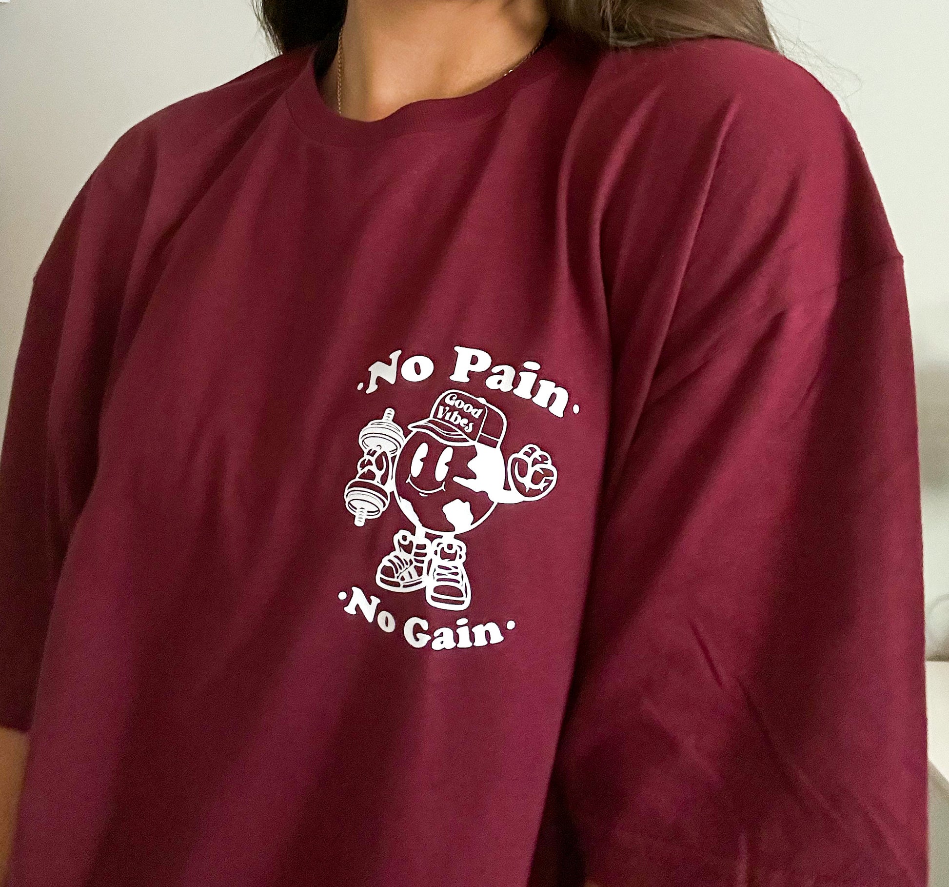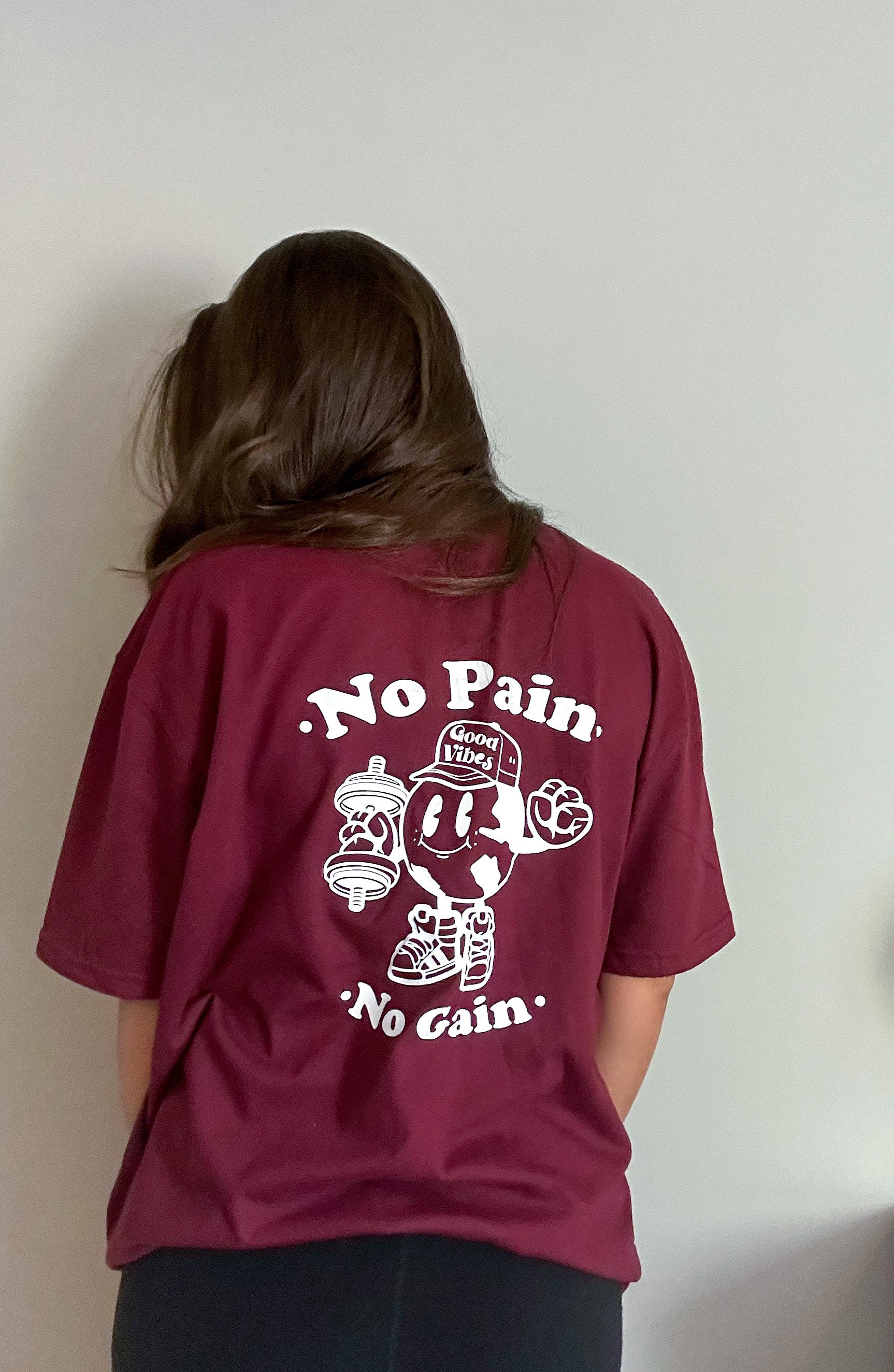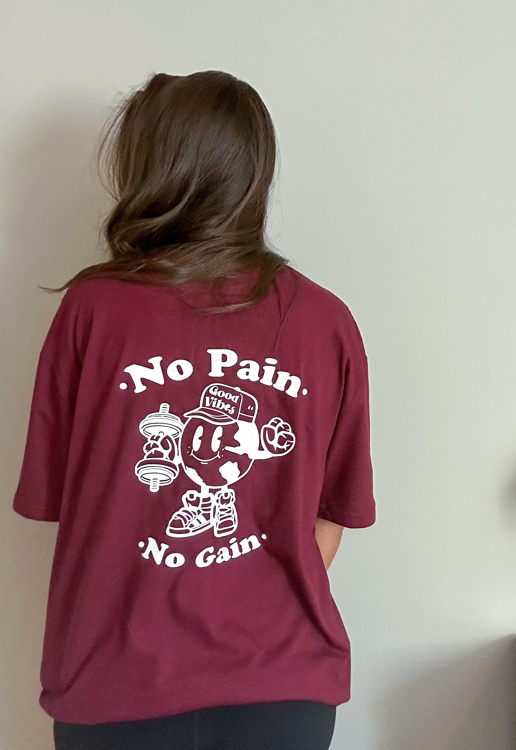 Introducing our No Pain, No Gain tee, the perfect addition to your workout wardrobe. This tee is made for all genders, providing a comfortable and stylish pump cover for your workouts. Available in maroon, white, or black tees, this shirt is versatile and can be worn for any type of exercise. With its motivational slogan, you'll be reminded to push through the pain and achieve your fitness goals. Get your No Pain, No Gain tee today and take your workout to the next level