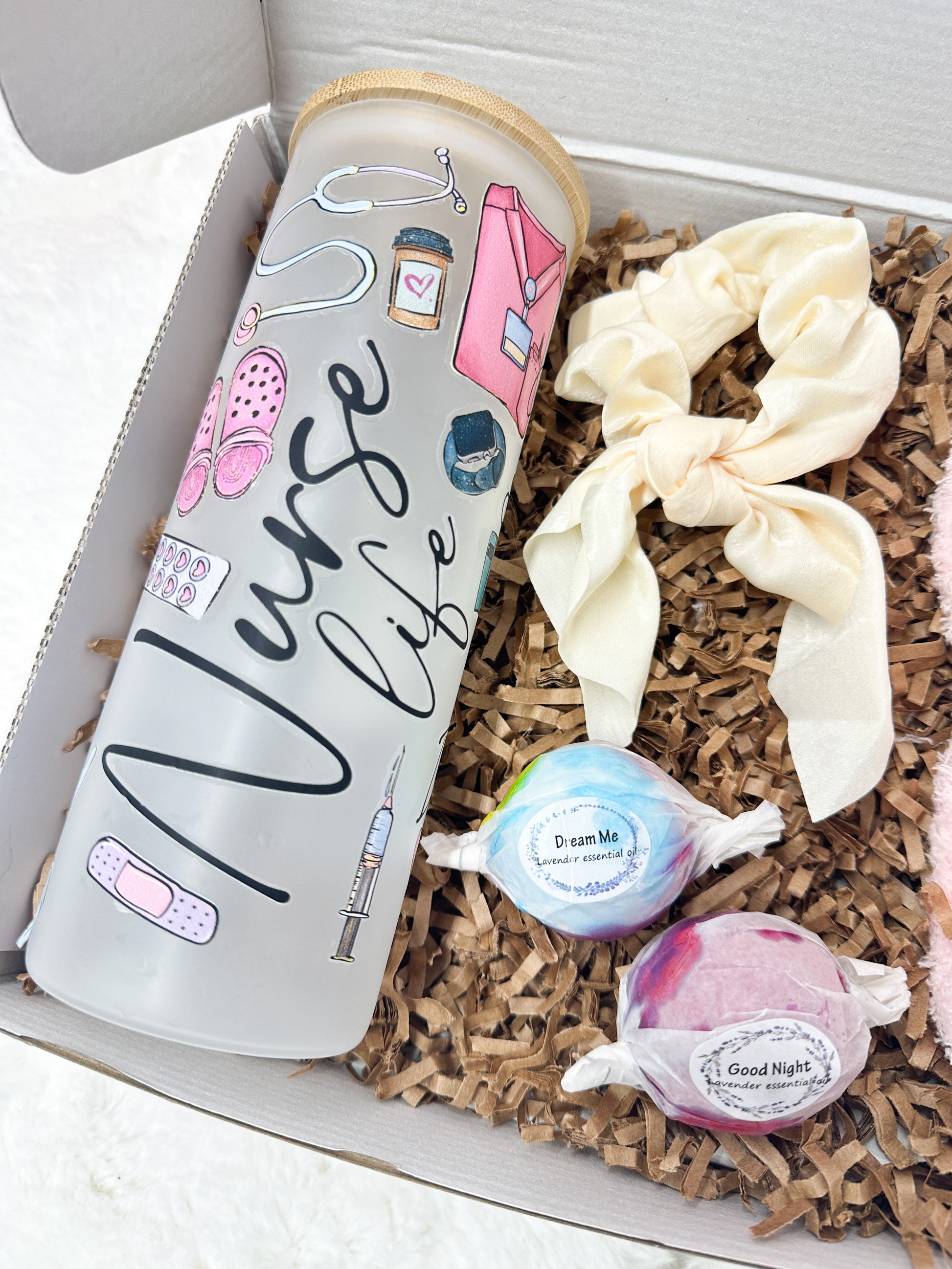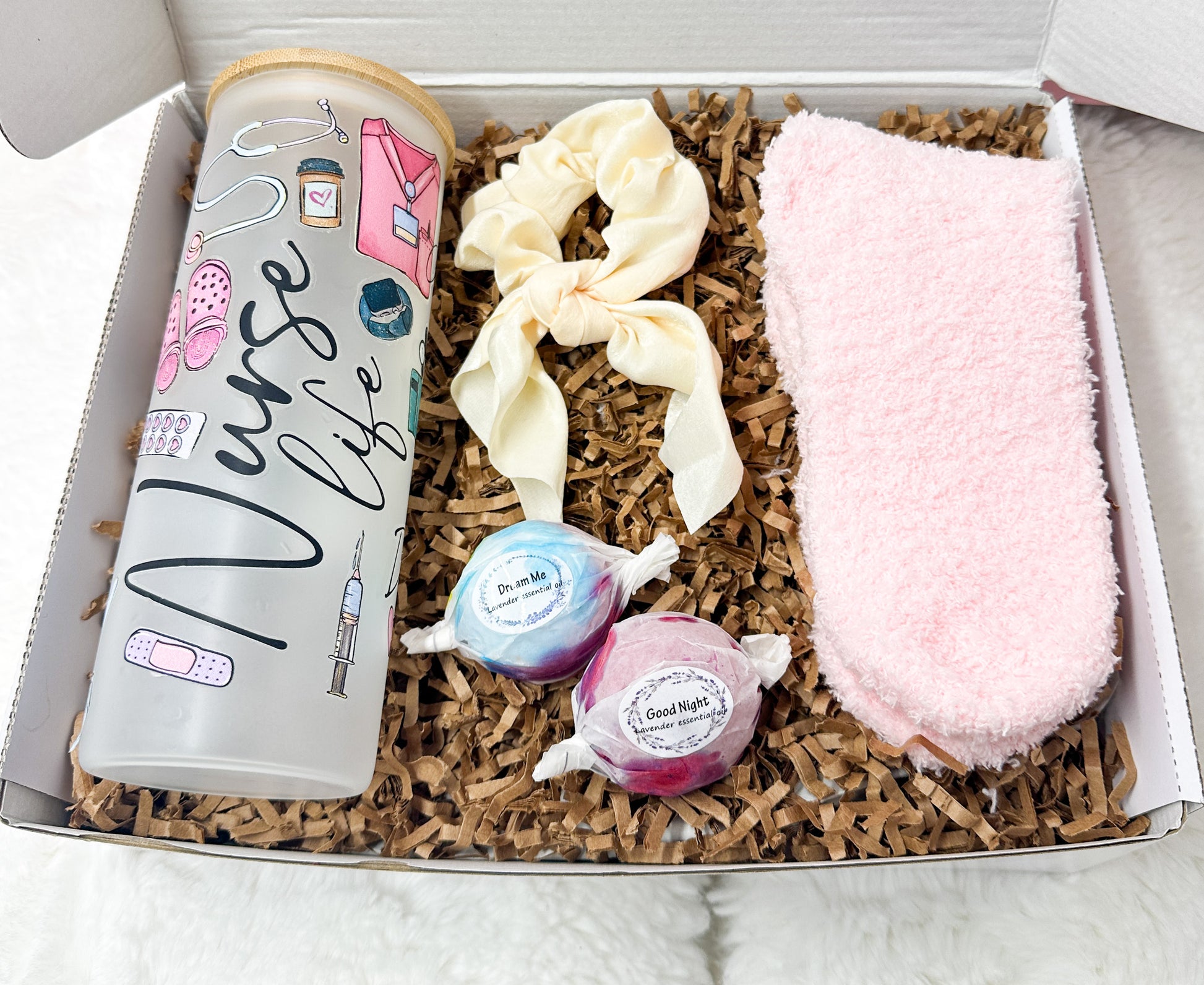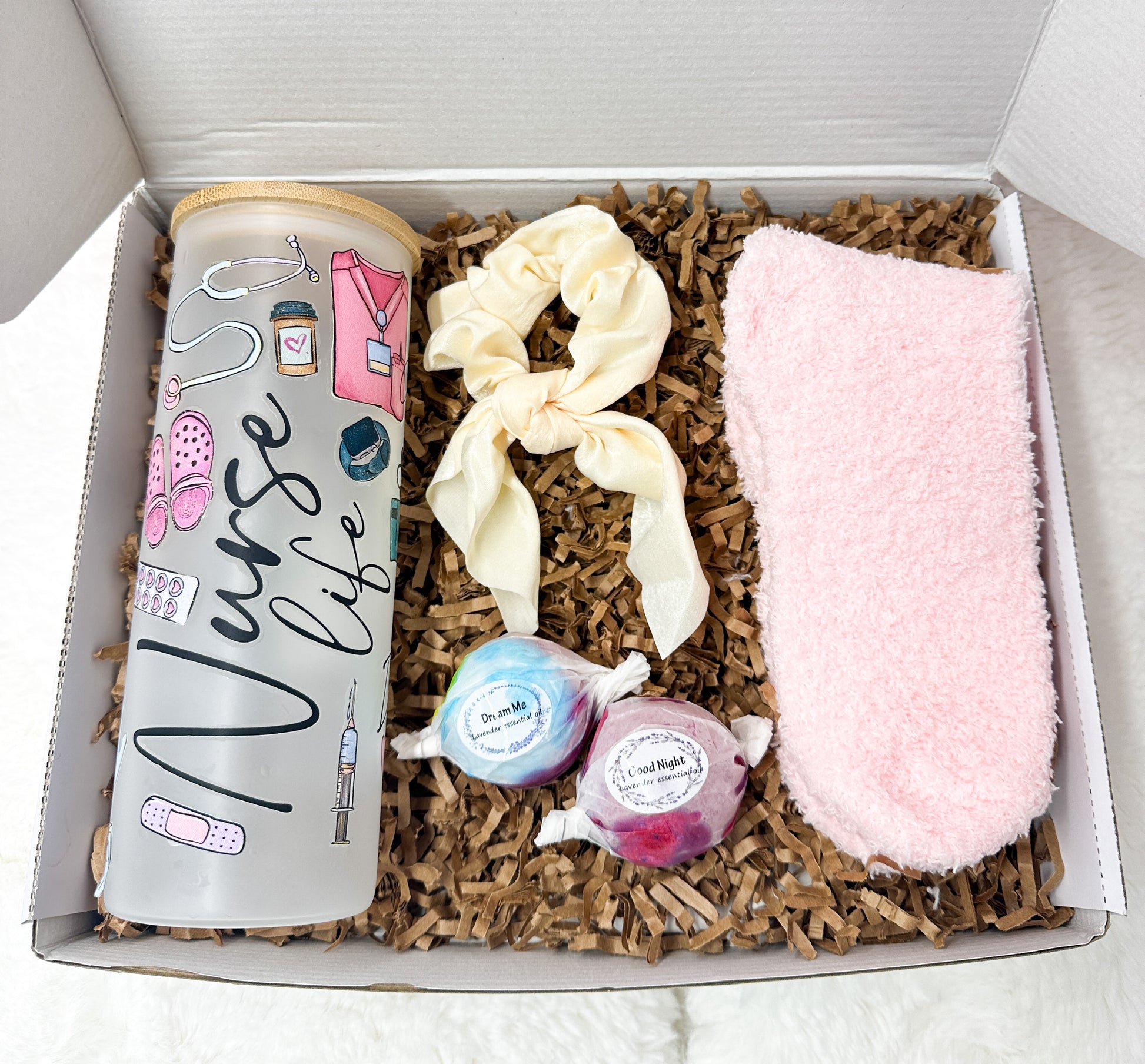 Are you looking for the perfect gift for the hardworking nurse in your life? Our Nurse Life Gift Box has everything she needs to relax and unwind after a long shift. Inside, she'll find a 25 oz frosted tumbler, perfect for keeping her hydrated on the go. The box also includes a set of luxurious bath bombs, a soft and stylish scrunchie, and a pair of cozy fuzzy socks to help her kick back and relax. Whether she's enjoying a day off or winding down after a night shift, this Nurse Life Gift Box is sure to bring a smile to her face. Treat the nurse in your life to the gift of relaxation with this thoughtful and practical gift box.