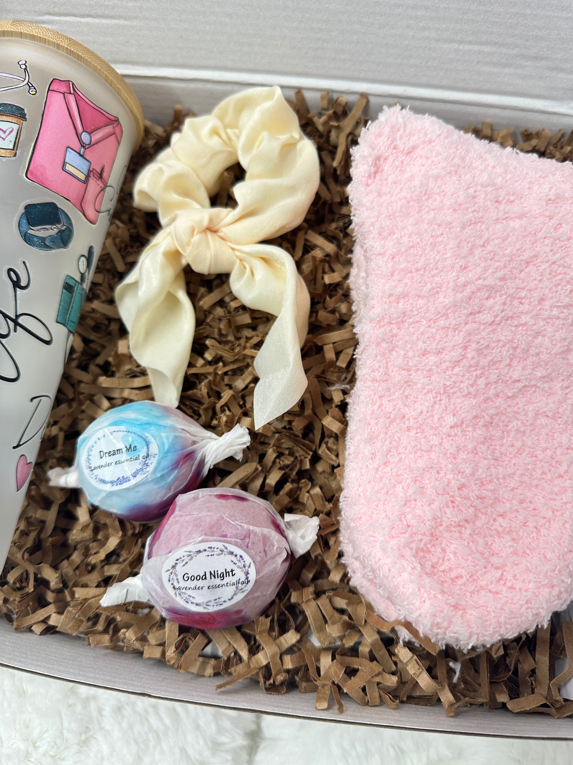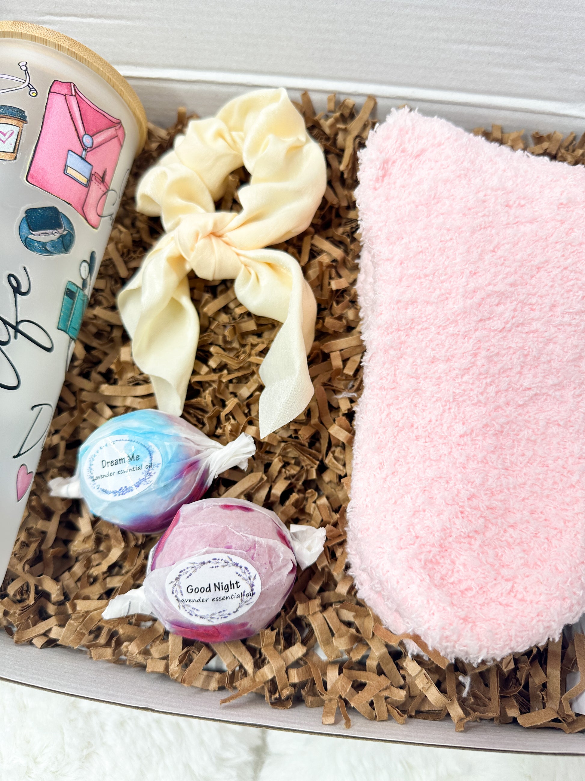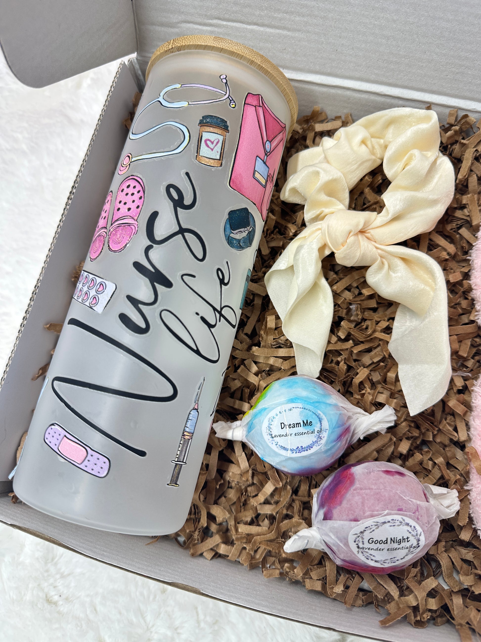 Are you looking for the perfect gift for the hardworking nurse in your life? Our Nurse Life Gift Box has everything she needs to relax and unwind after a long shift. Inside, she'll find a 25 oz frosted tumbler, perfect for keeping her hydrated on the go. The box also includes a set of luxurious bath bombs, a soft and stylish scrunchie, and a pair of cozy fuzzy socks to help her kick back and relax. Whether she's enjoying a day off or winding down after a night shift, this Nurse Life Gift Box is sure to bring a smile to her face. Treat the nurse in your life to the gift of relaxation with this thoughtful and practical gift box.