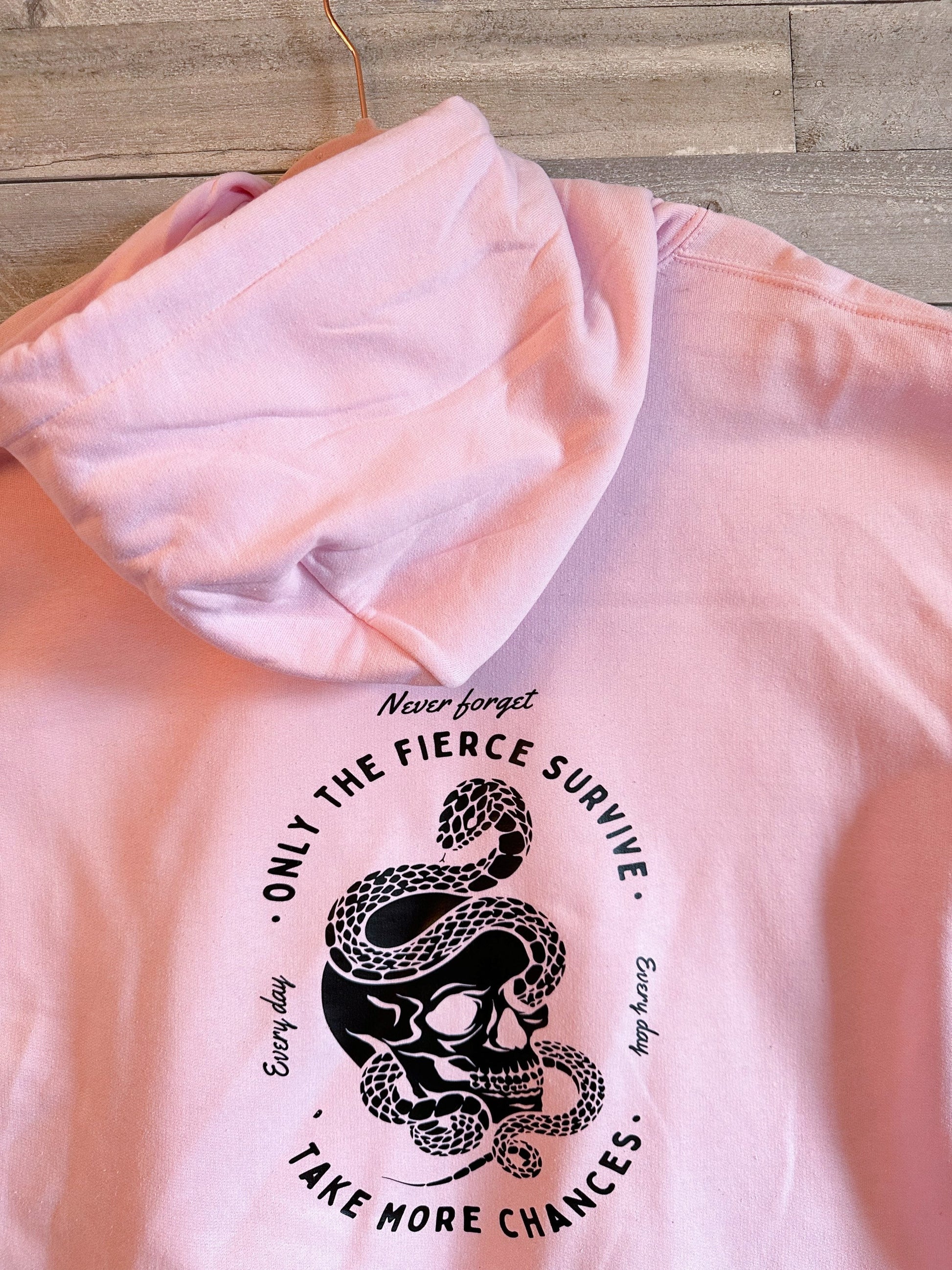 "Only the Fierce Survive, Take More Chances" sweatshirt. Includes a graphic of a skull and a snake on the back and "Never forget take more chances" on the front.