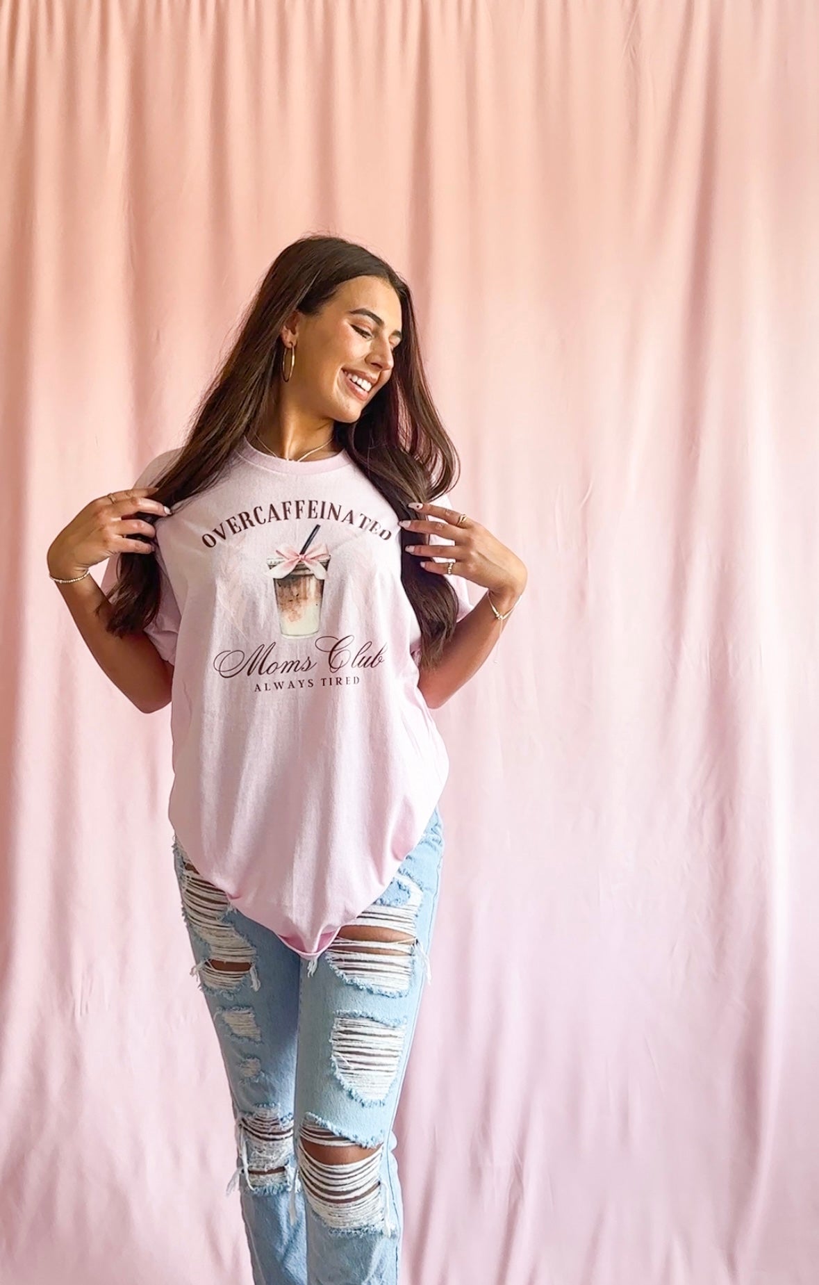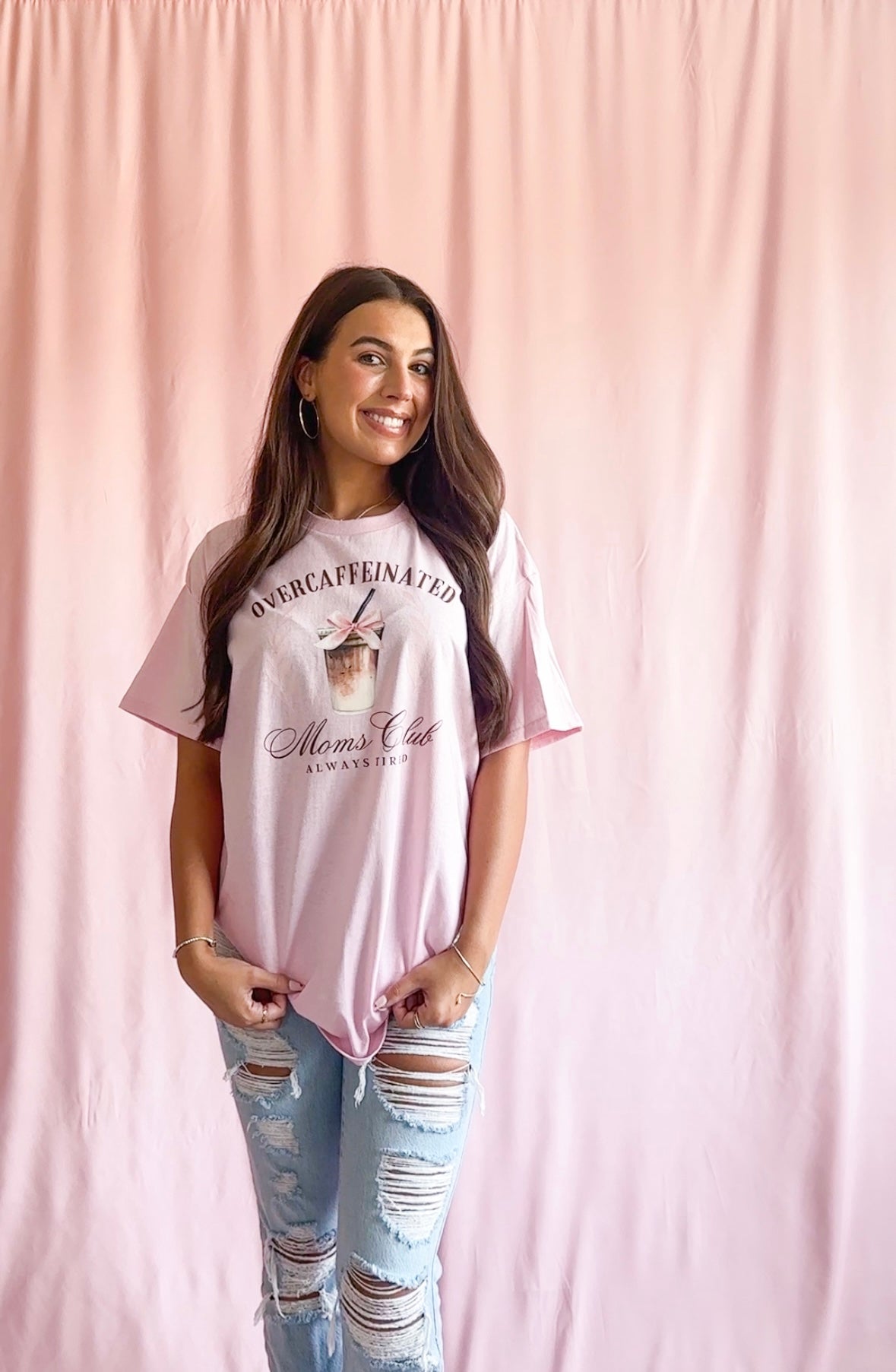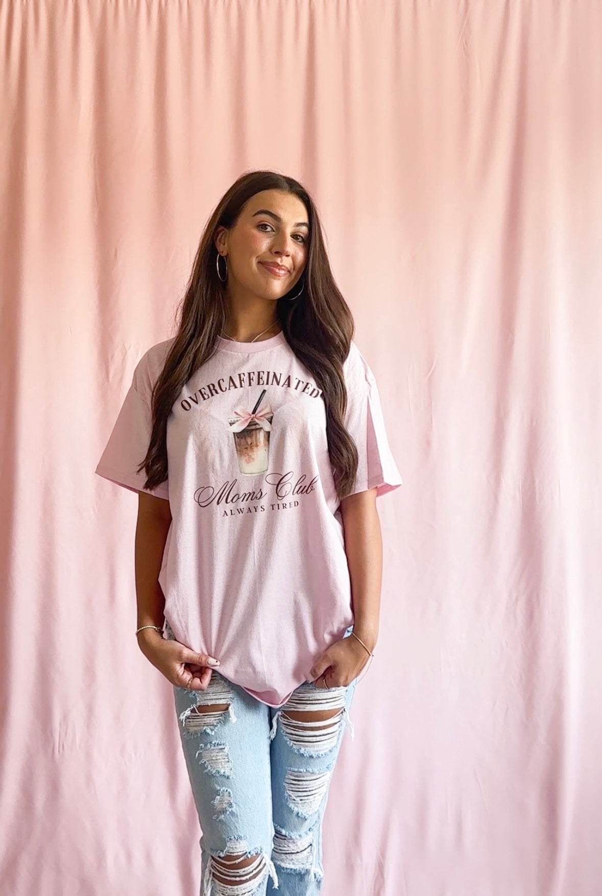 Calling all over-caffeinated moms! This adorable pink t-shirt is the perfect addition to your wardrobe. Made with soft and comfortable fabric, this shirt is perfect for all-day wear. The stylish design featuring an iced latte with a pink bow adds a fun and playful touch to any outfit. Whether you're running errands or enjoying a coffee date with friends, this shirt is sure to be a hit. Join the club and show off your love for coffee and motherhood with this fashionable t-shirt.