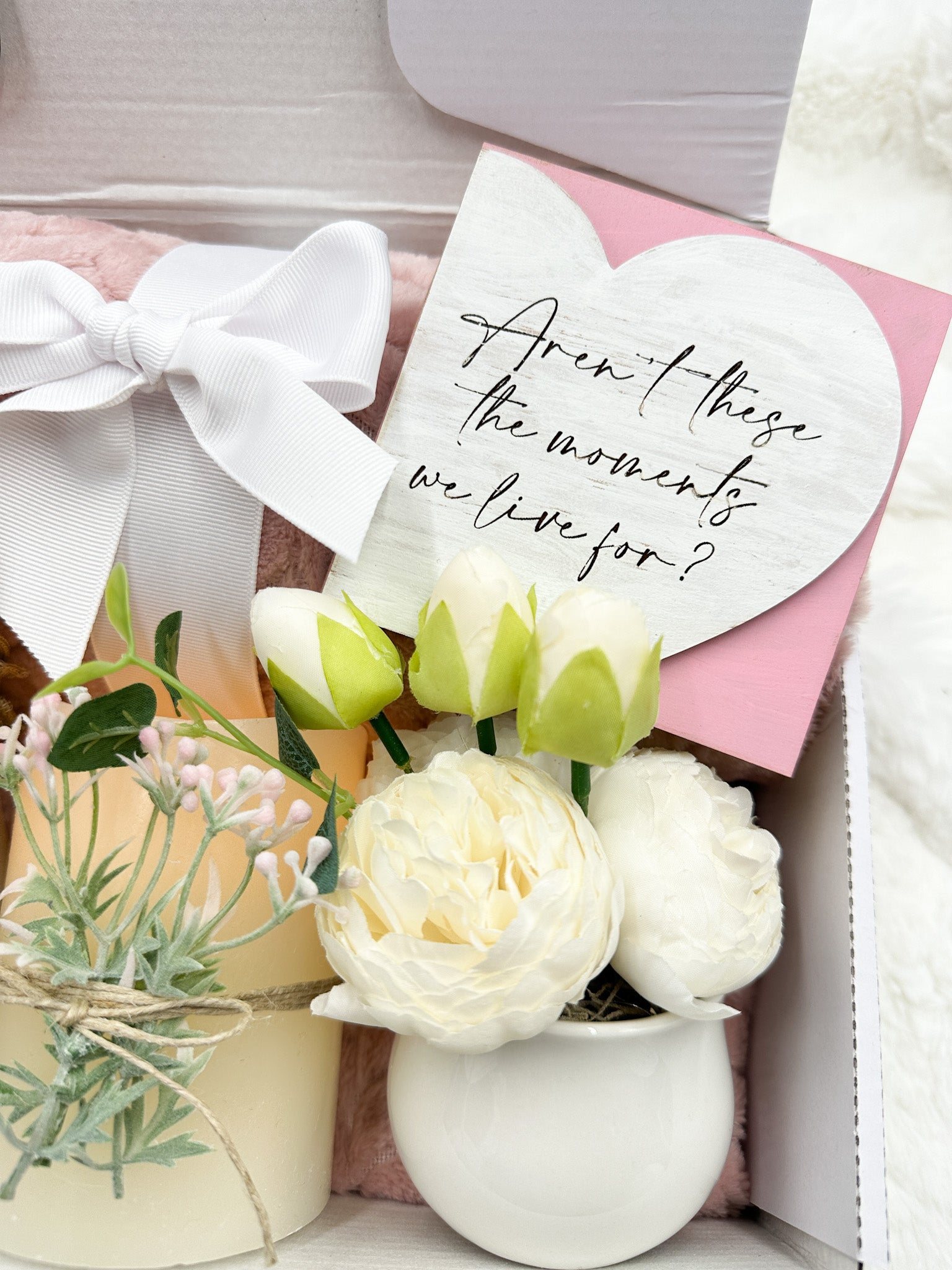 Our Pink Valentine's Day Gift Box is the perfect way to show your love and appreciation for the special women in your life. Whether it's your girlfriend, wife, galentine, co-worker, sister, or mom, this gift box is sure to make them feel loved. It includes a cozy pink blanket, fuzzy socks, a mug with a gold spoon, a burlap bag with a beverage, a beautiful floral arrangement, and heart decor. You can also leave a gift message to make it even more personal. The gift box is wrapped with a beautiful bow, making it the perfect gift for Valentine's Day.