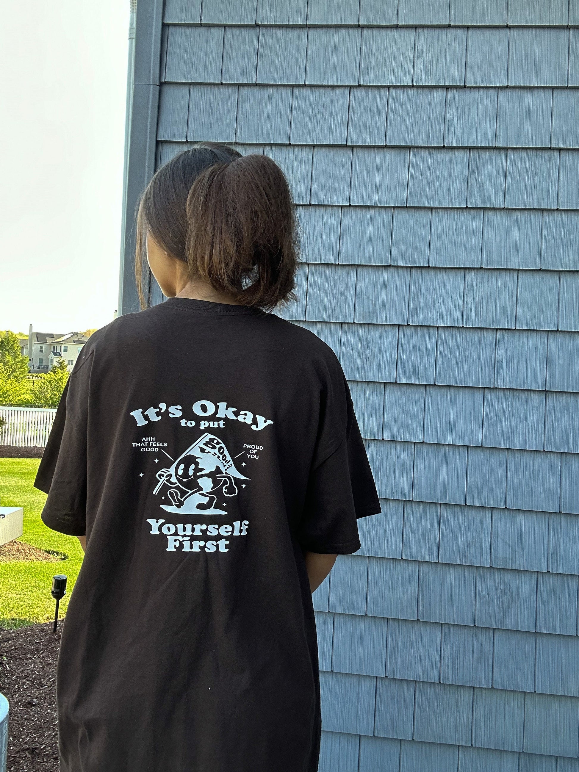 "It's okay to put yourself first" motivational t-shirt! Features a smiley face Earth graphic design on the front and back.
