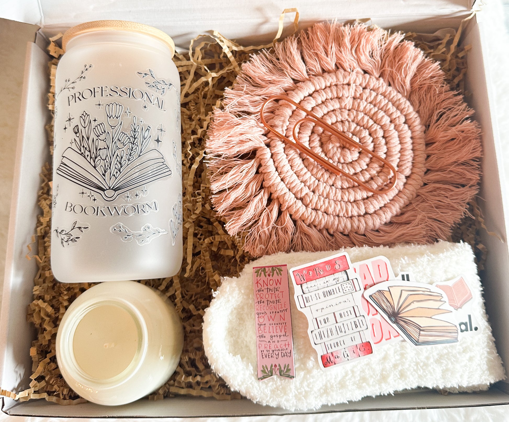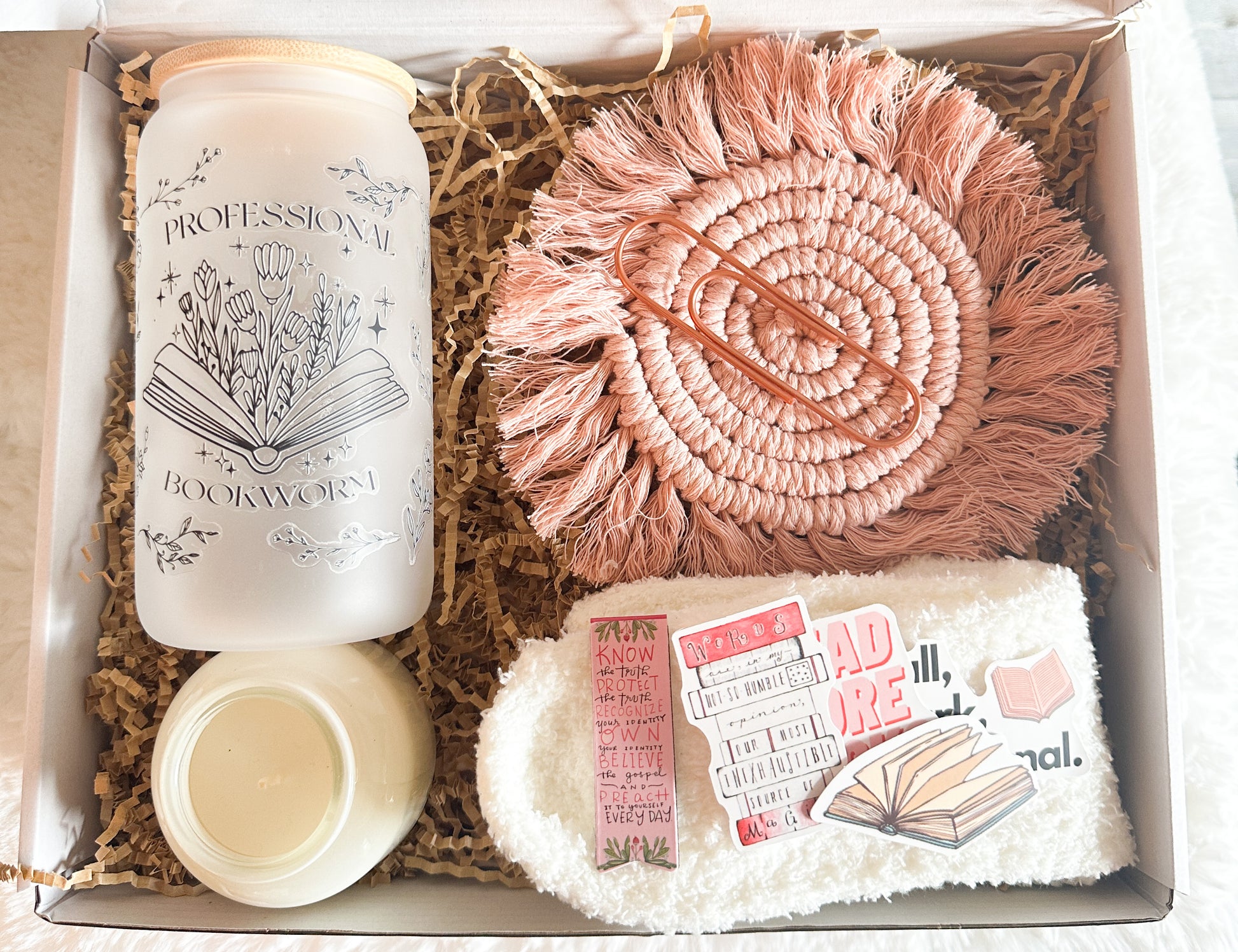 Indulge the bibliophile in your life with GabsDoodleBugDesigns' Reader Gift Box. This delightful collection includes a 16 oz frosted cup proudly bearing the title "Professional Bookworm," a stylish coaster, themed stickers to decorate any literary nook, cozy fuzzy socks, and calming candles. Each item is thoughtfully curated to enhance the reading experience, embodying the quality and care GabsDoodleBugDesigns is known for. Make every reading session special with this unique gift set.
