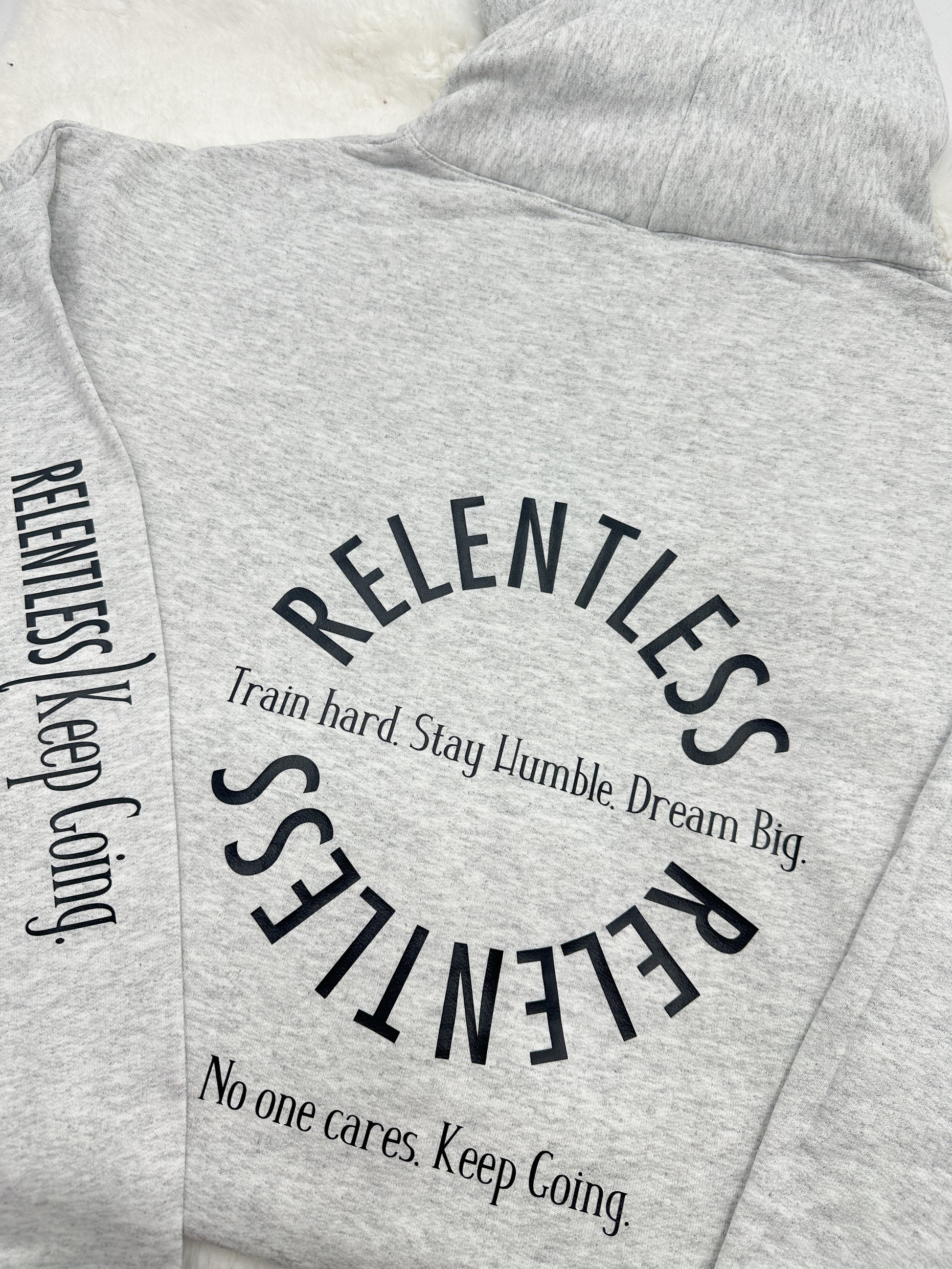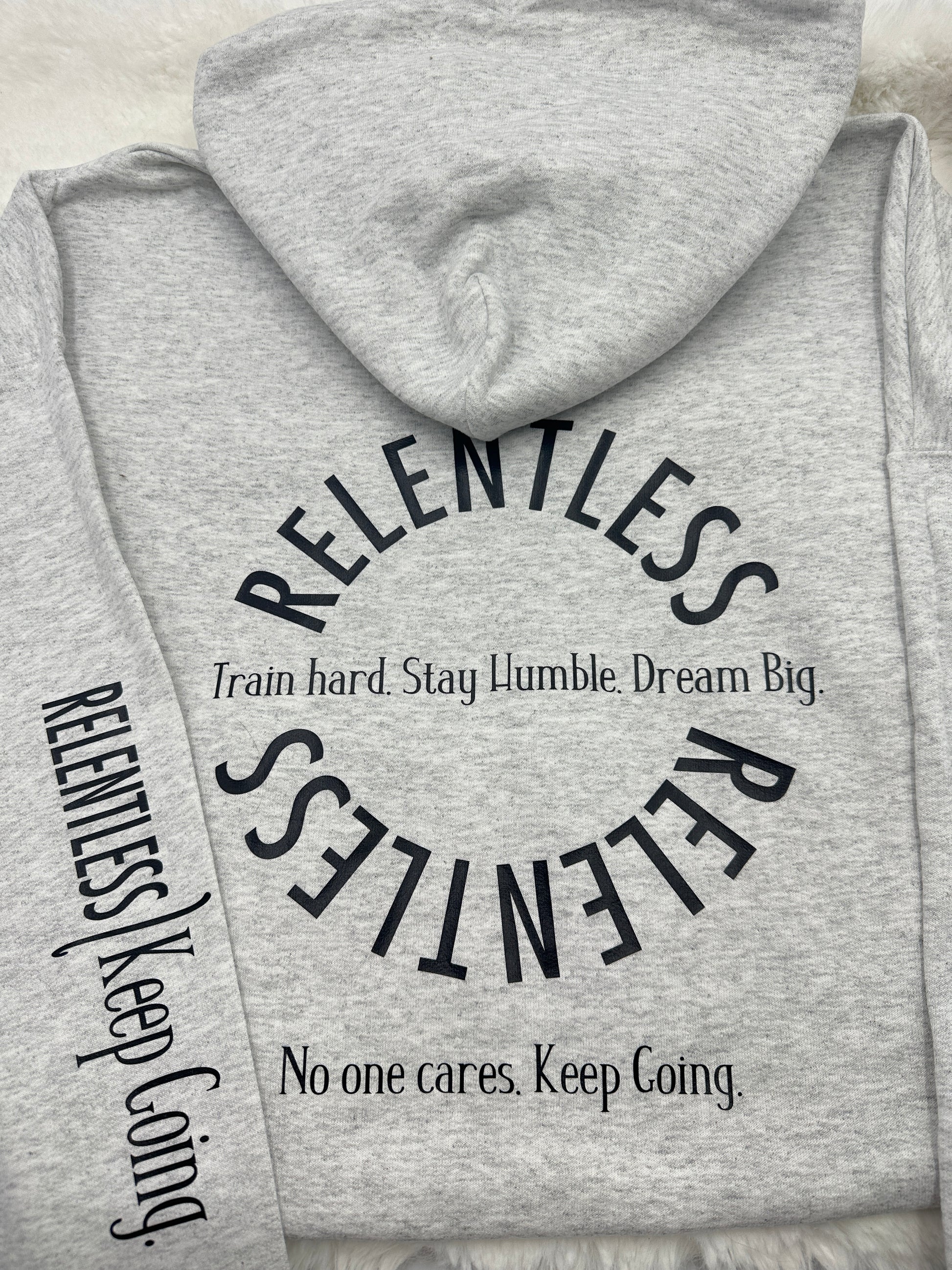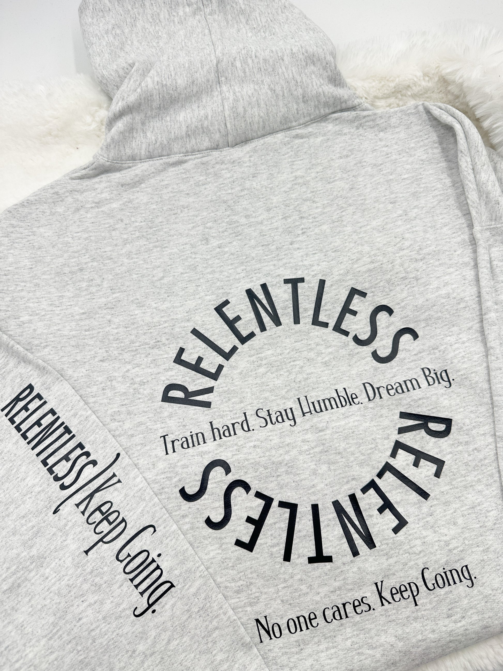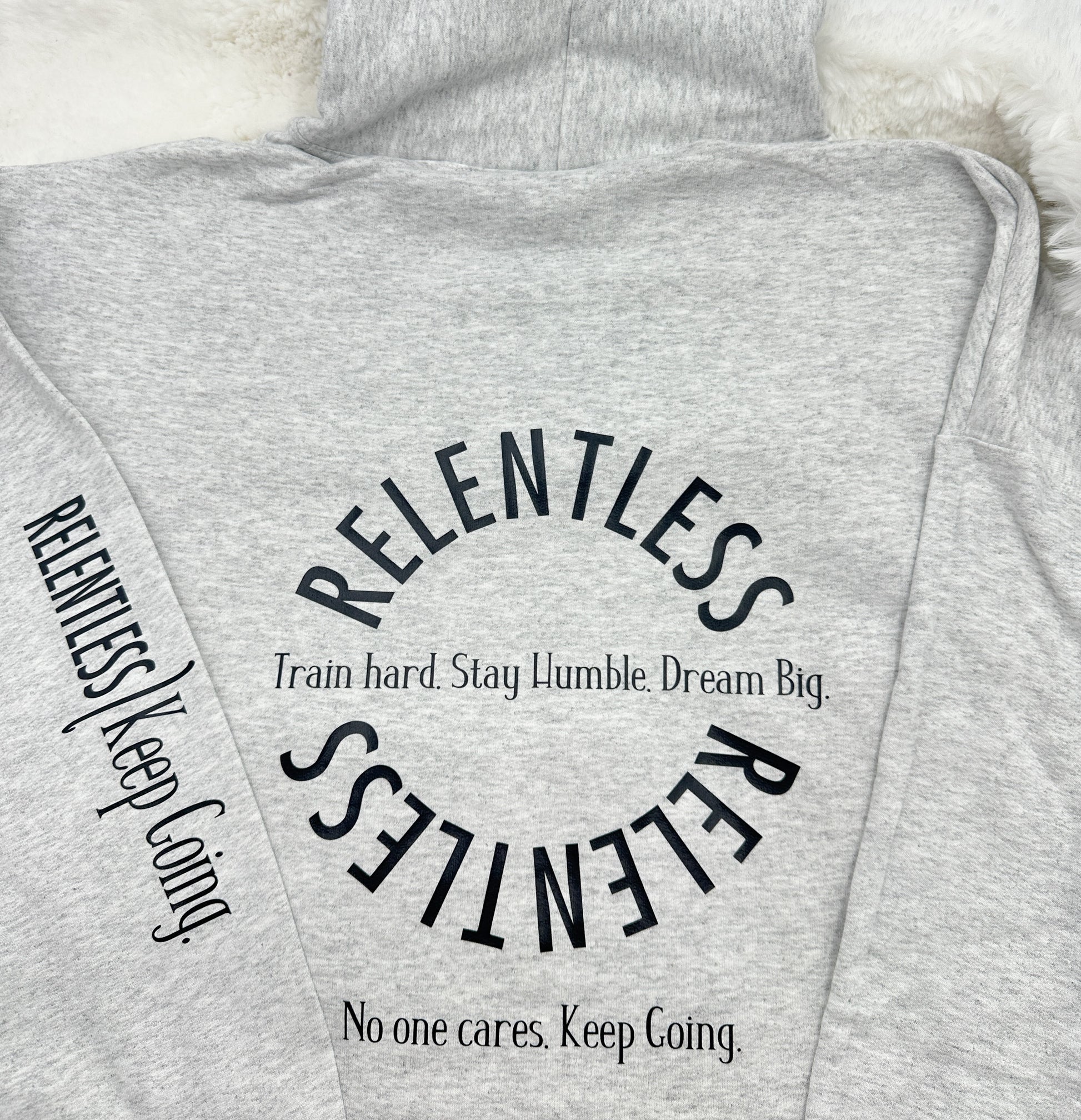 Introducing our Relentless hoodie, the ultimate apparel for anyone who lives by the "never give up" motto. This unisex sweatshirt is perfect to wear on your way to the gym, or as a daily reminder to stay motivated. The hoodie features a motivational quote on the back and sleeve that will inspire you to keep pushing yourself to the limit. Made with high-quality materials, this hoodie is comfortable, durable, and perfect for any occasion. Get your Relentless hoodie today and take the first step towards achieving your goals