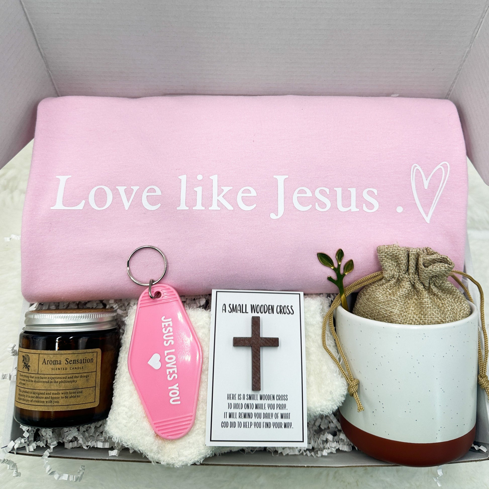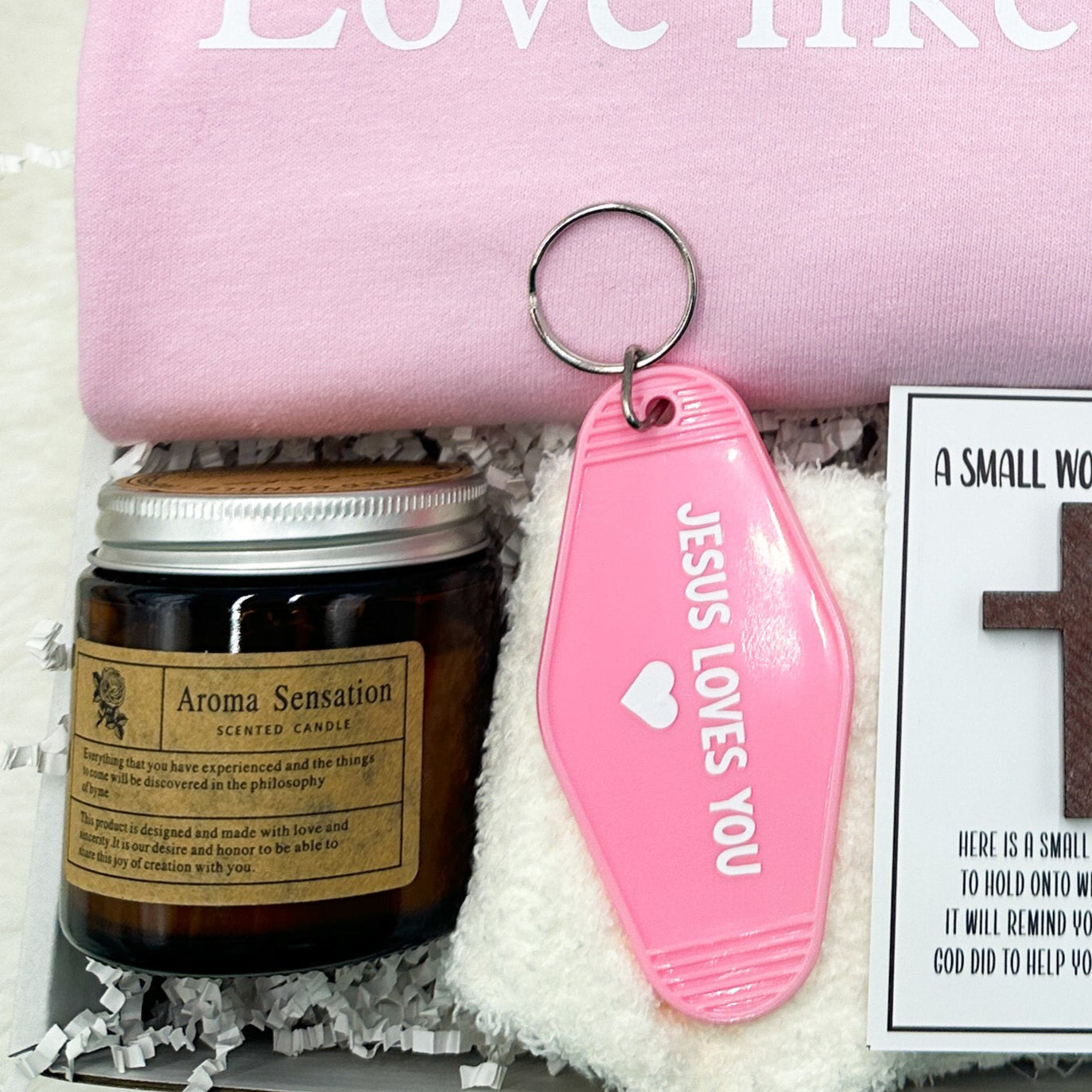 This thoughtful religious gift box is a beautiful expression of love and faith, perfect for uplifting the spirit. Inside, you'll find a cozy pink "Love Like Jesus" T-shirt, a gentle reminder to live with kindness and compassion. The "Jesus Loves You" keychain serves as a small, daily affirmation of God's love. A mini pocket cross with a prayer brings comfort wherever you go, while the included candle adds a peaceful, calming ambiance to any space.