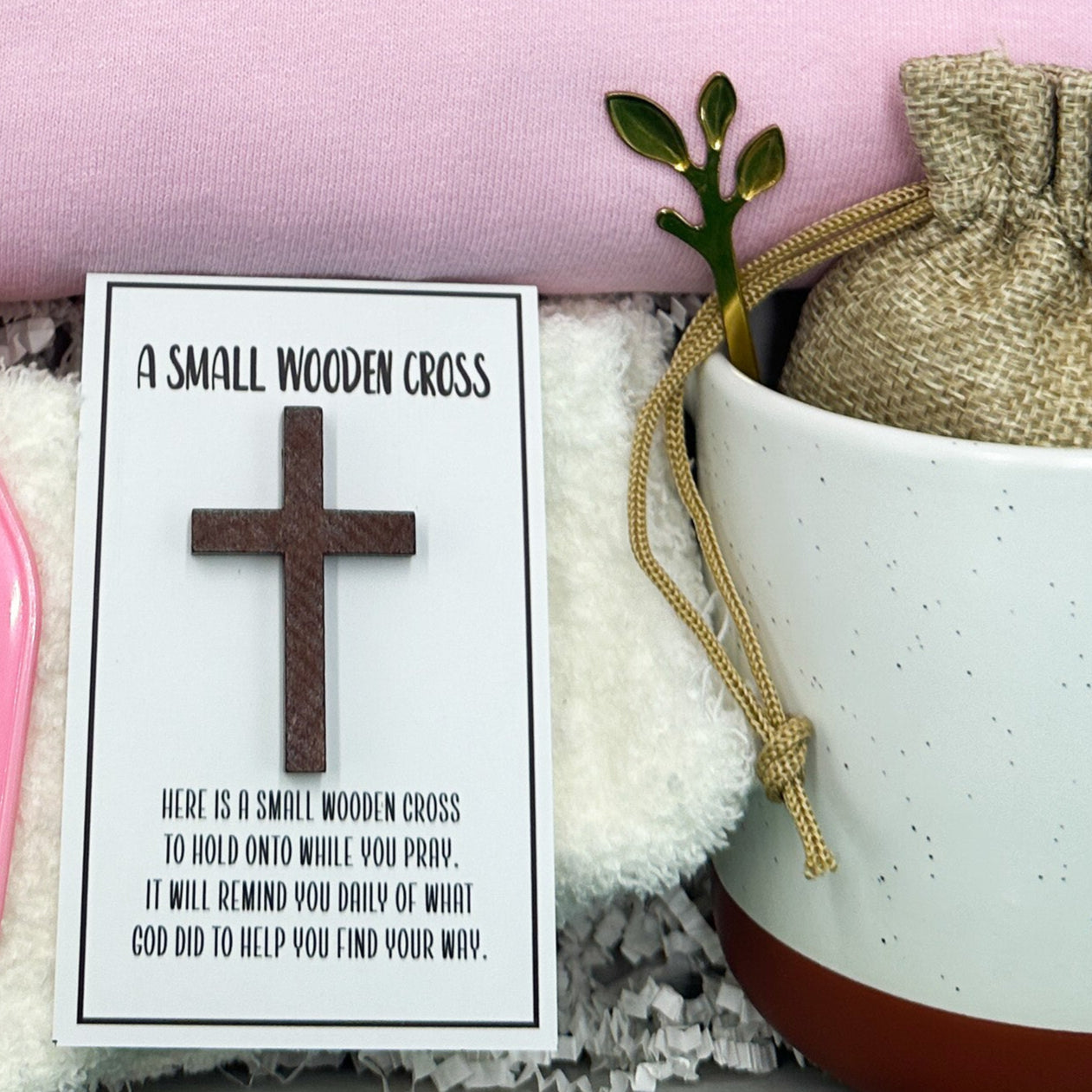 For moments of reflection, enjoy a warm beverage in the lovely mug, paired with fuzzy socks to keep you cozy. The burlap bag filled with a special beverage enhances the gift with an extra touch of care, while the gold spoon adds a little bit of elegance to every cup. This set makes for a truly heartwarming gift that combines faith, comfort, and love in one beautiful package.