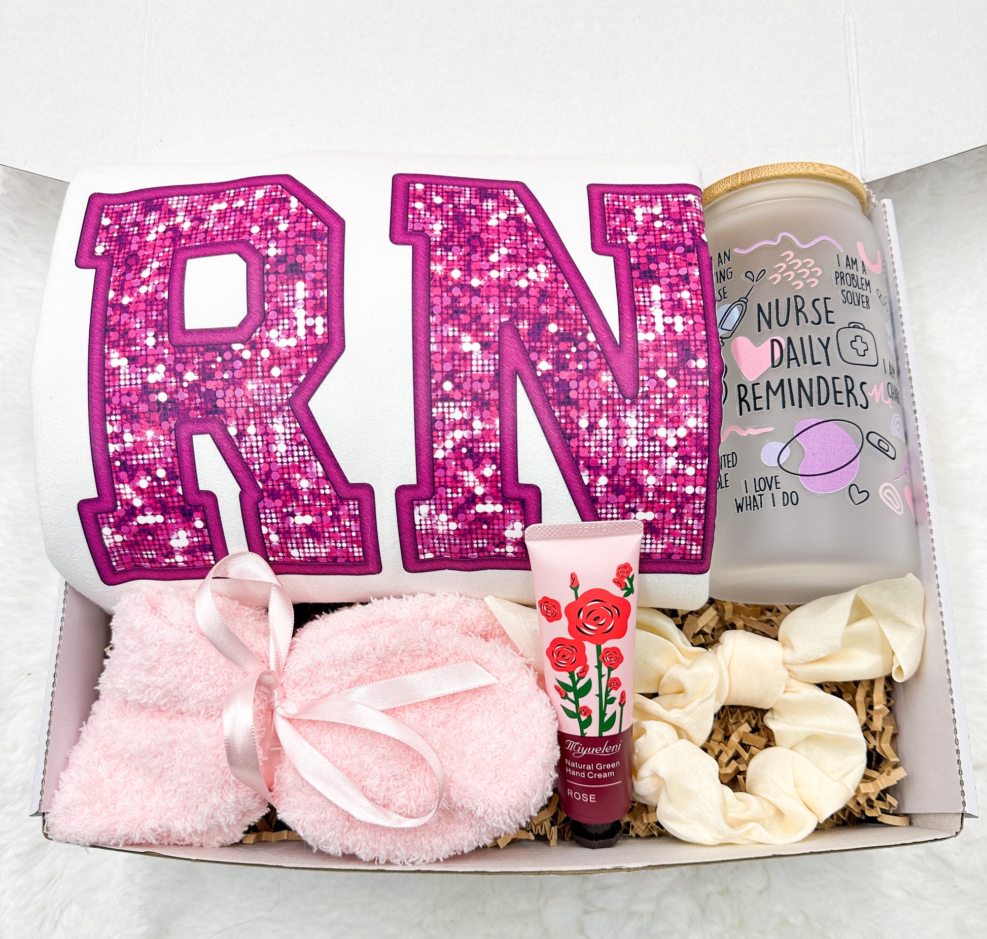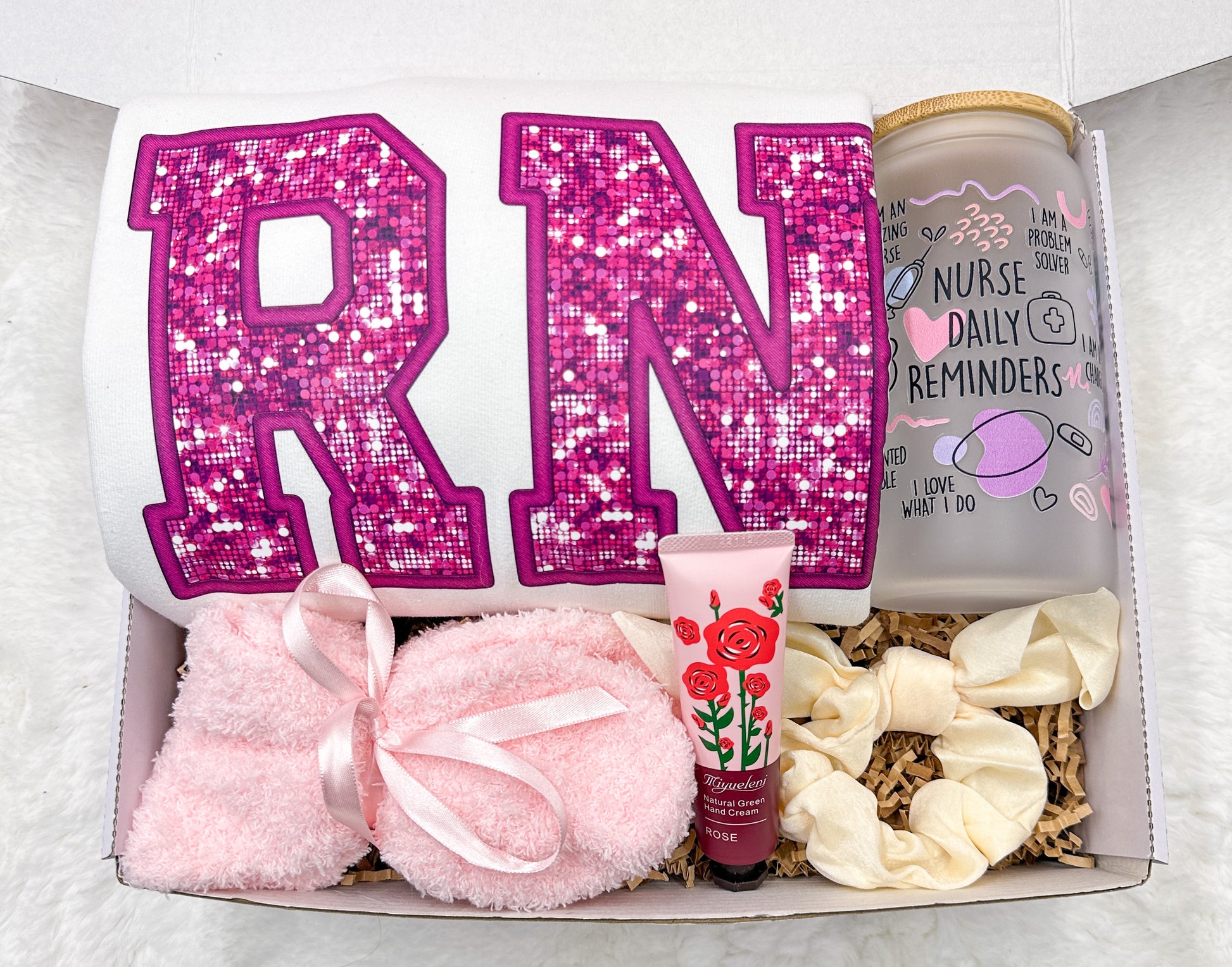 This RN Nurse Gift Box is the perfect present for any nurse, especially those who are celebrating their graduation! The box includes a sparkly RN sweatshirt, a nurse daily reminder 16 oz frosted tumbler, fuzzy socks, hand lotion, and a trendy scrunchie. The cozy and useful items in this gift box are sure to bring comfort and joy to any hardworking nurse. Whether they're studying for their boards or working long shifts, this gift box is the perfect way to show appreciation for their dedication to the field of nursing. Give the gift of relaxation and style to the new RN in your life with this thoughtful and practical nurse gift box.