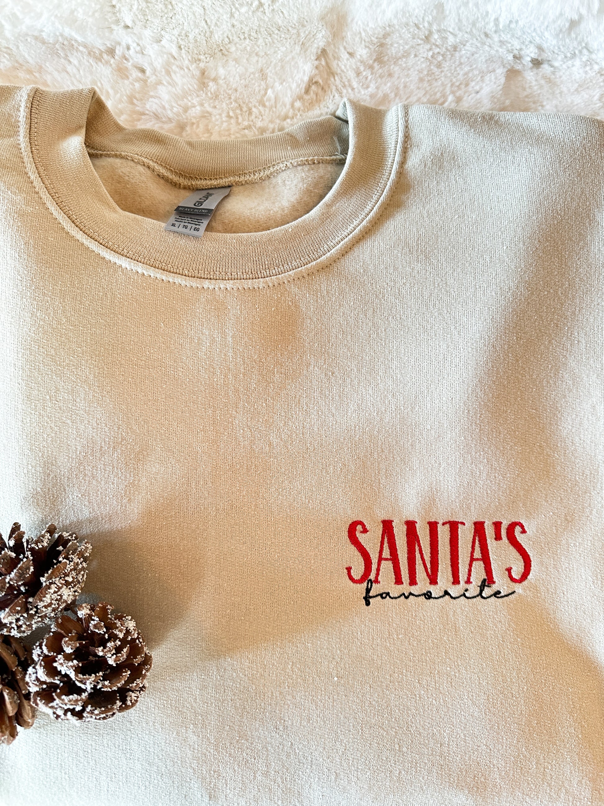Introducing our Santa's Favorite Sweatshirt, the perfect addition to your winter wardrobe! This cozy sweatshirt comes in four different colors: beige, white, black, and grey. Each sweatshirt is embroidered with the phrase "Santa's Favorite" in festive red and green lettering. Made with high quality materials, this sweatshirt will keep you warm and comfortable during the holiday season. Get into the holiday spirit and show off your love for jolly old St. Nick with our Santa's Favorite Sweatshirt