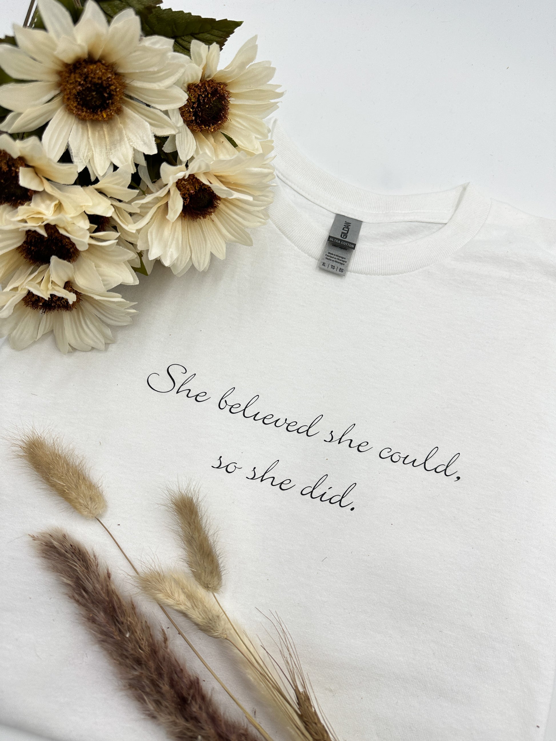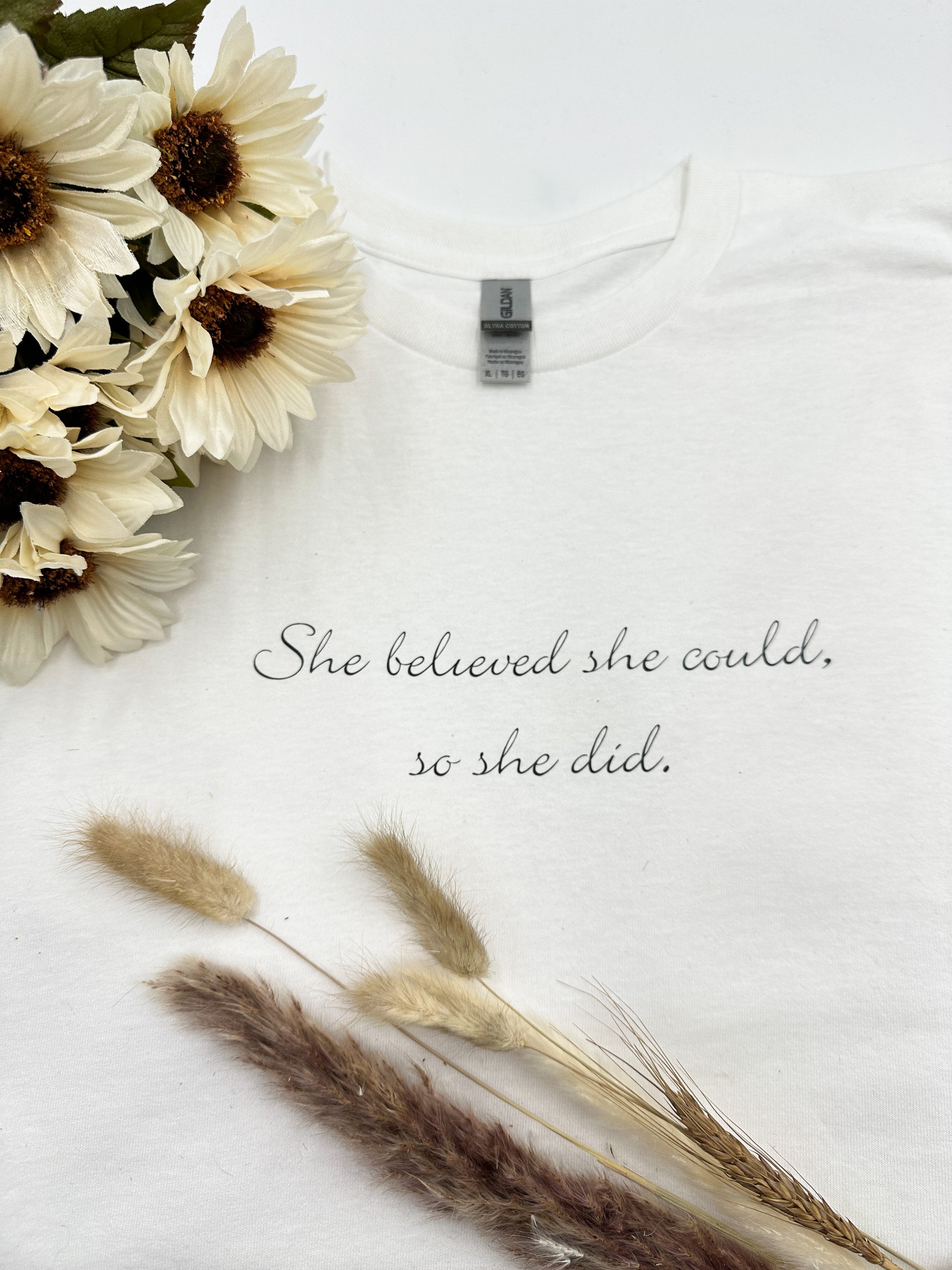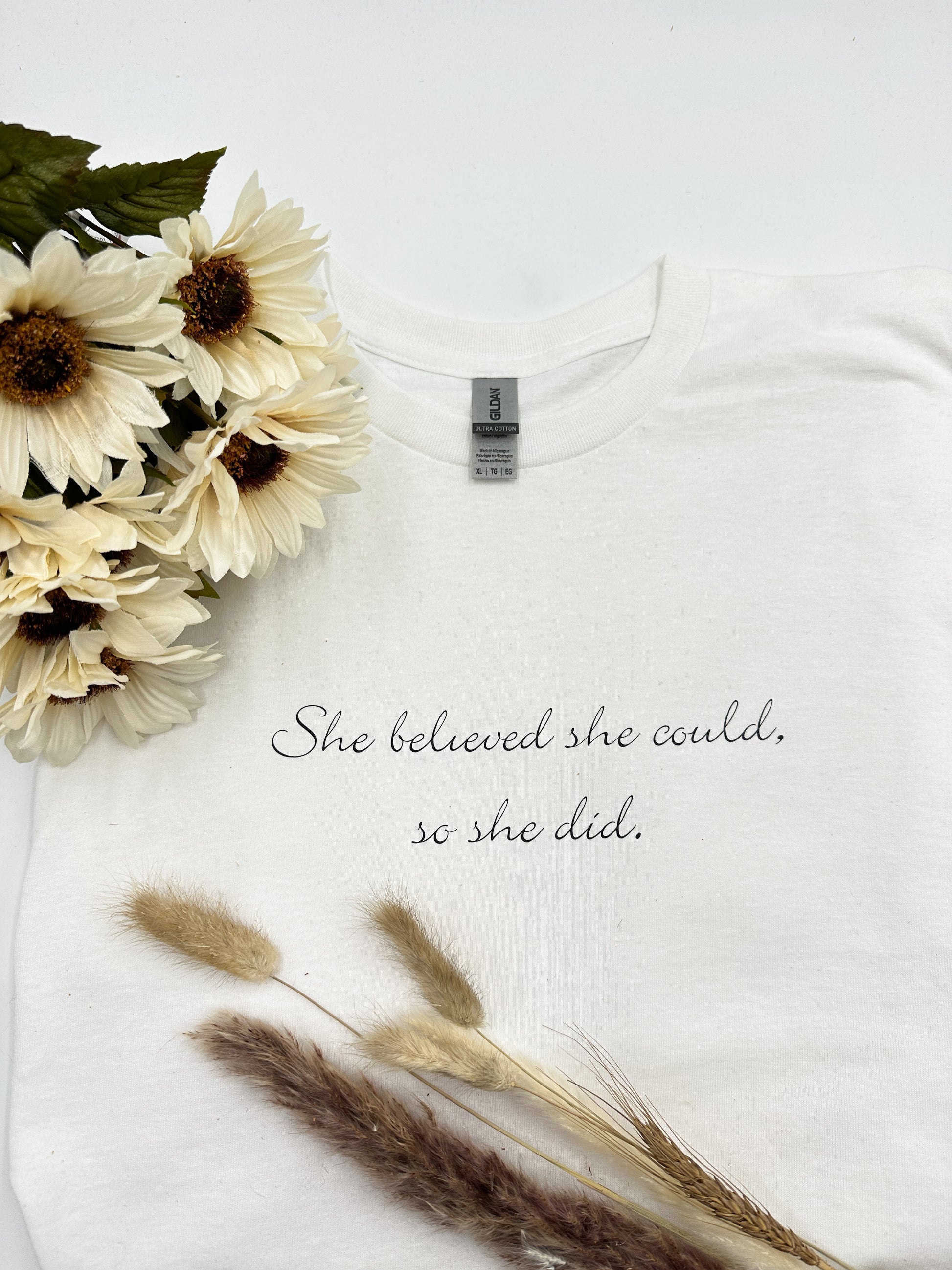 The She Believed T-shirt is for all the strong and confident women out there who believe in themselves. This t-shirt is available in three different colors – white, black, and grey. The design features the empowering quote "She believed she could, so she did" in bold letters, which is sure to inspire and motivate everyone who sees it. Made with high-quality fabric, this t-shirt is comfortable to wear and perfect for any casual occasion. Add this stylish and meaningful piece to your wardrobe today