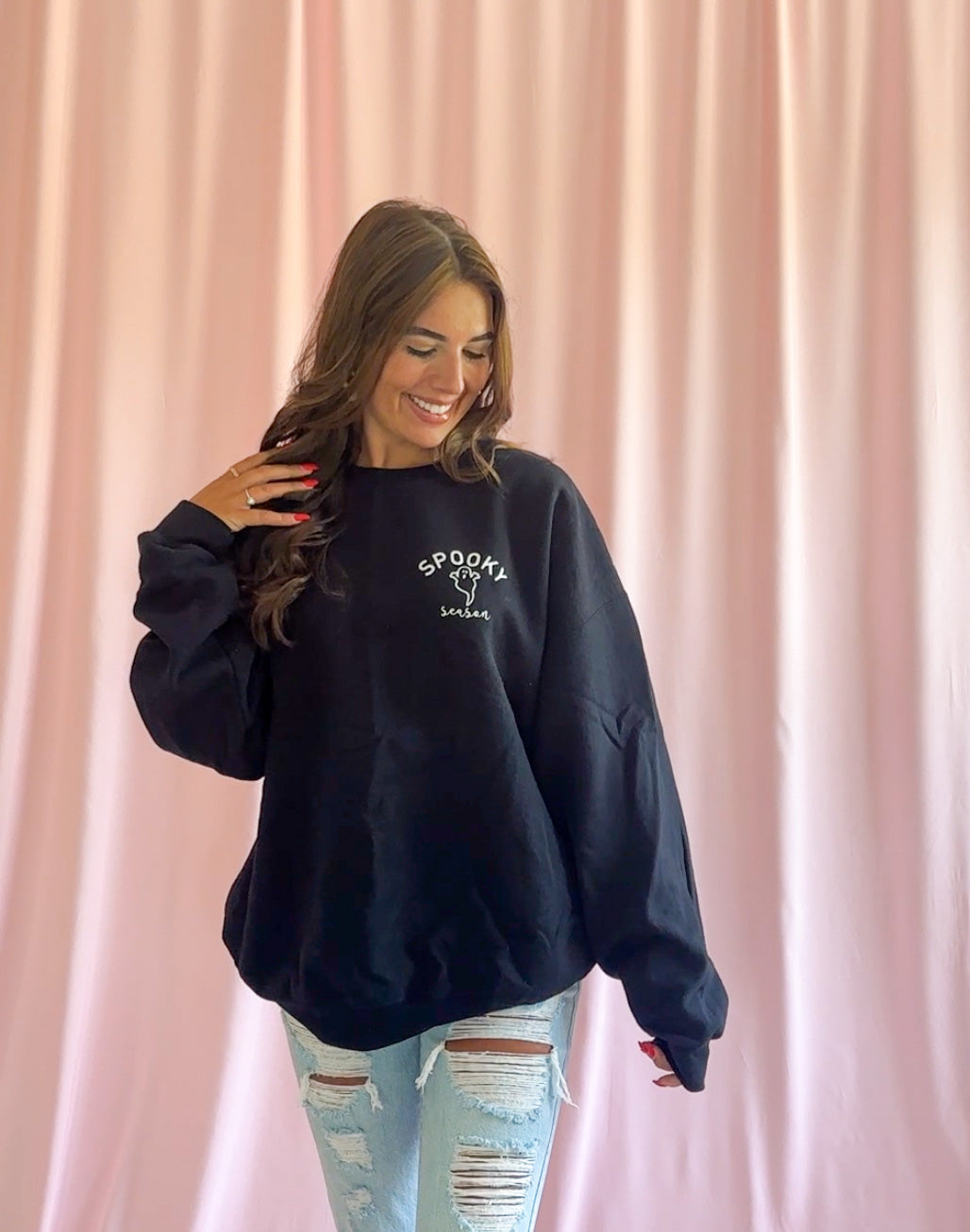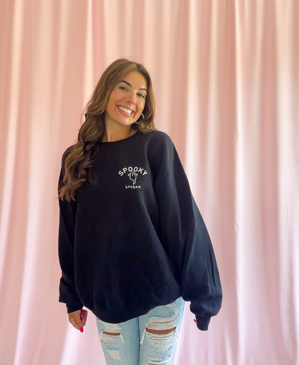 Get into the Halloween spirit with our Spooky Season Ghost Sweatshirt in Black! This cozy and stylish sweatshirt features a hauntingly adorable ghost design perfect for the spookiest time of the year. Made with soft and comfortable fabric, this sweatshirt is perfect for staying warm while trick-or-treating or attending a Halloween party. For an oversized and relaxed look, we recommend sizing up. Embrace the spooky season in style with this must-have ghost sweatshirt!