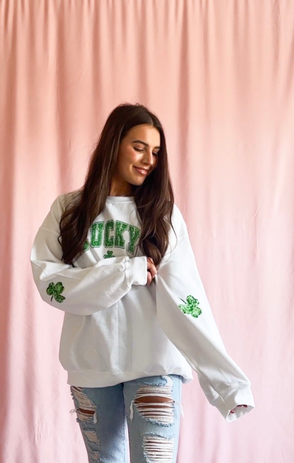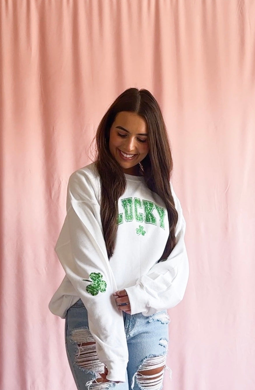 Get ready to celebrate St. Patrick's Day in style with our Lucky Shamrock Glitter Sweatshirt! This cozy and festive sweatshirt features a fun and sparkly glitter design, with the word "Lucky" boldly emblazoned on the front and charming shamrocks decorating both sleeves. Made from a comfortable and soft fabric, this sweatshirt is perfect for staying cozy while spreading some Irish cheer. Whether you're attending a parade or simply enjoying the holiday with friends, this sweatshirt is a must-have for any St. Patrick's Day festivities. Don't miss out on the chance to show off your Irish pride with this eye-catching and playful sweatshirt!