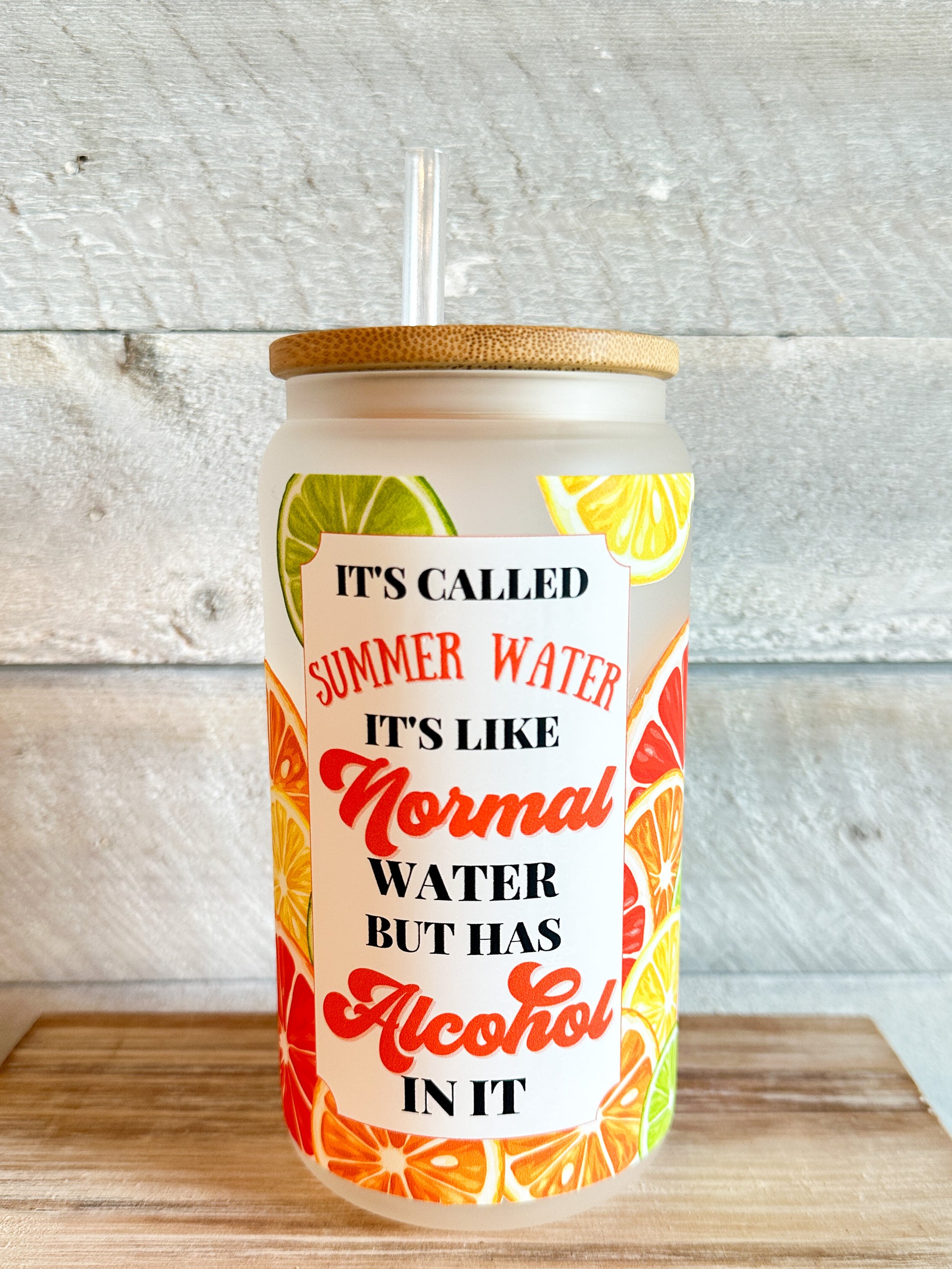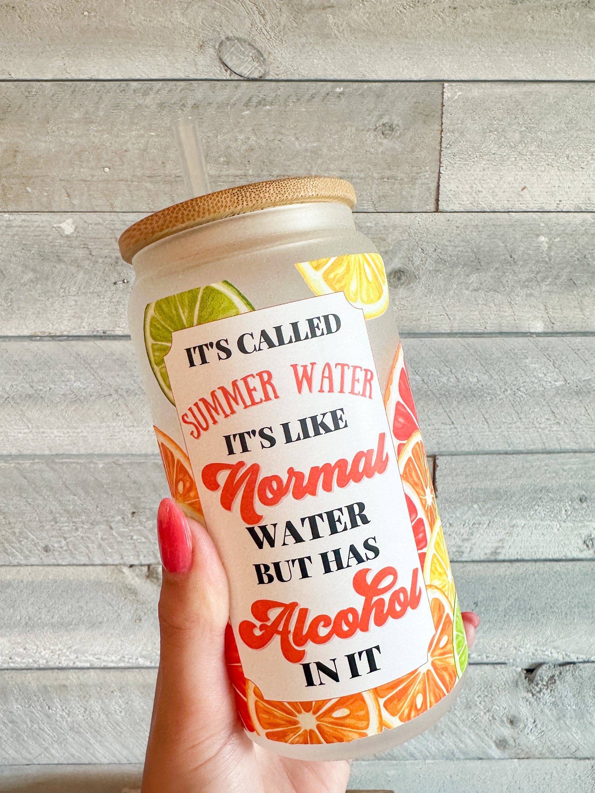 Introducing our Summer Alcohol Frosted Tumbler, the perfect accessory for enjoying your favorite summer beverages. This 16 oz tumbler features a fun and festive design with the slogan "it's called summer water but it has alcohol in it" - a playful nod to everyone's favorite summer drink. The frosted exterior helps keep your drink cool and condensation-free, while the durable construction ensures it can handle all your outdoor adventures. Whether you're sipping on a refreshing cocktail by the pool or enjoying a cold beverage at a backyard barbecue, this tumbler is a must-have for the season. Make a statement and keep your drink cold with our Summer Alcohol Frosted Tumbler - it's the ultimate summer accessory.