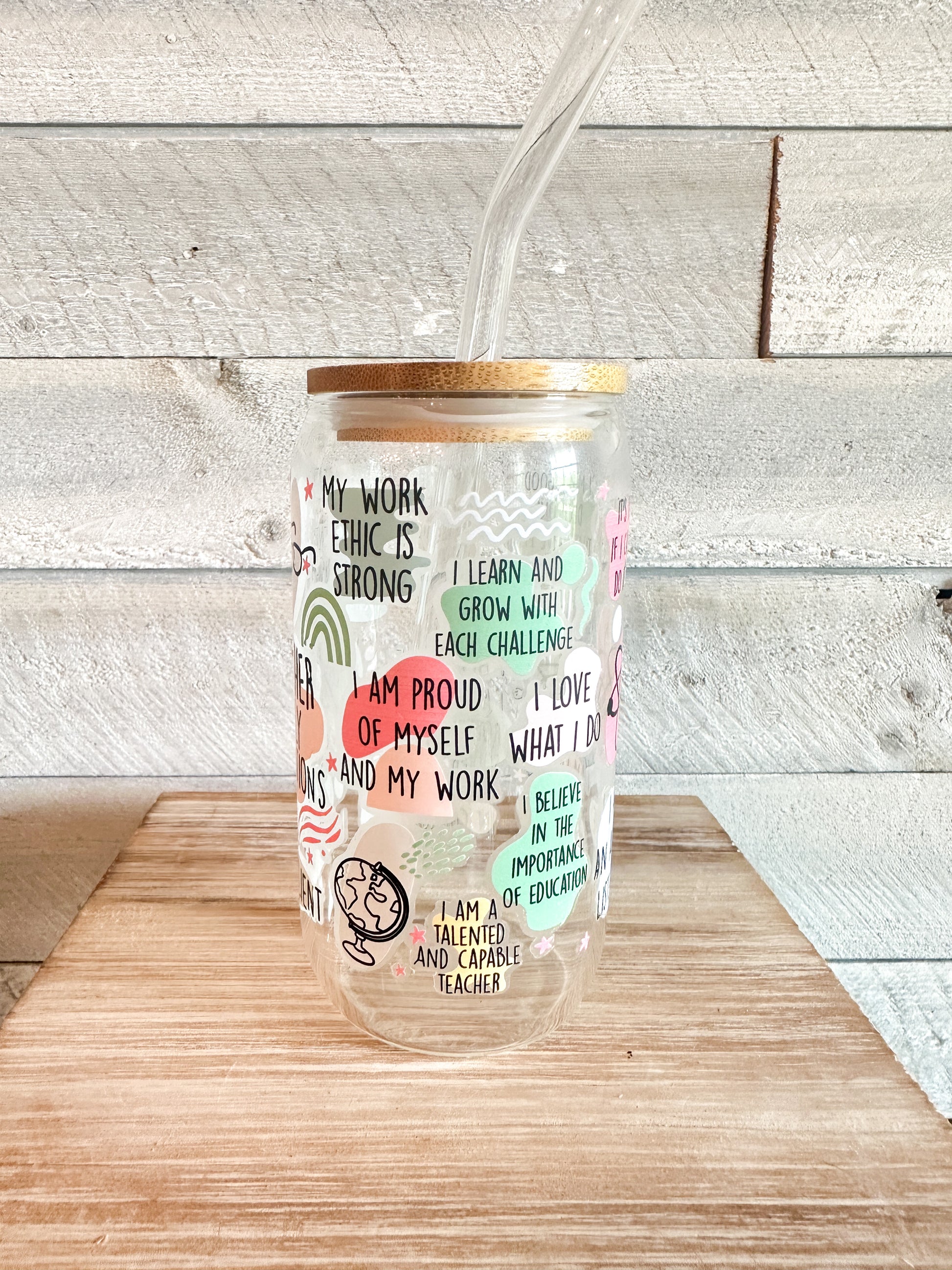 Stay positive and motivated throughout your day with our Teacher Daily Affirmations Tumbler! This 16 oz tumbler features uplifting and empowering affirmations specifically curated for teachers. Made with durable and high-quality materials, this tumbler is perfect for keeping your favorite hot or cold beverages at the perfect temperature all day long. Whether you're heading to the classroom or enjoying a well-deserved break, this tumbler will keep you inspired and encouraged. It also makes a thoughtful and practical gift for any teacher in your life. Make your daily routine a little brighter with our Teacher Daily Affirmations Tumbler!