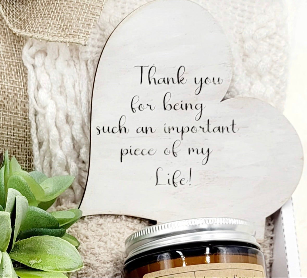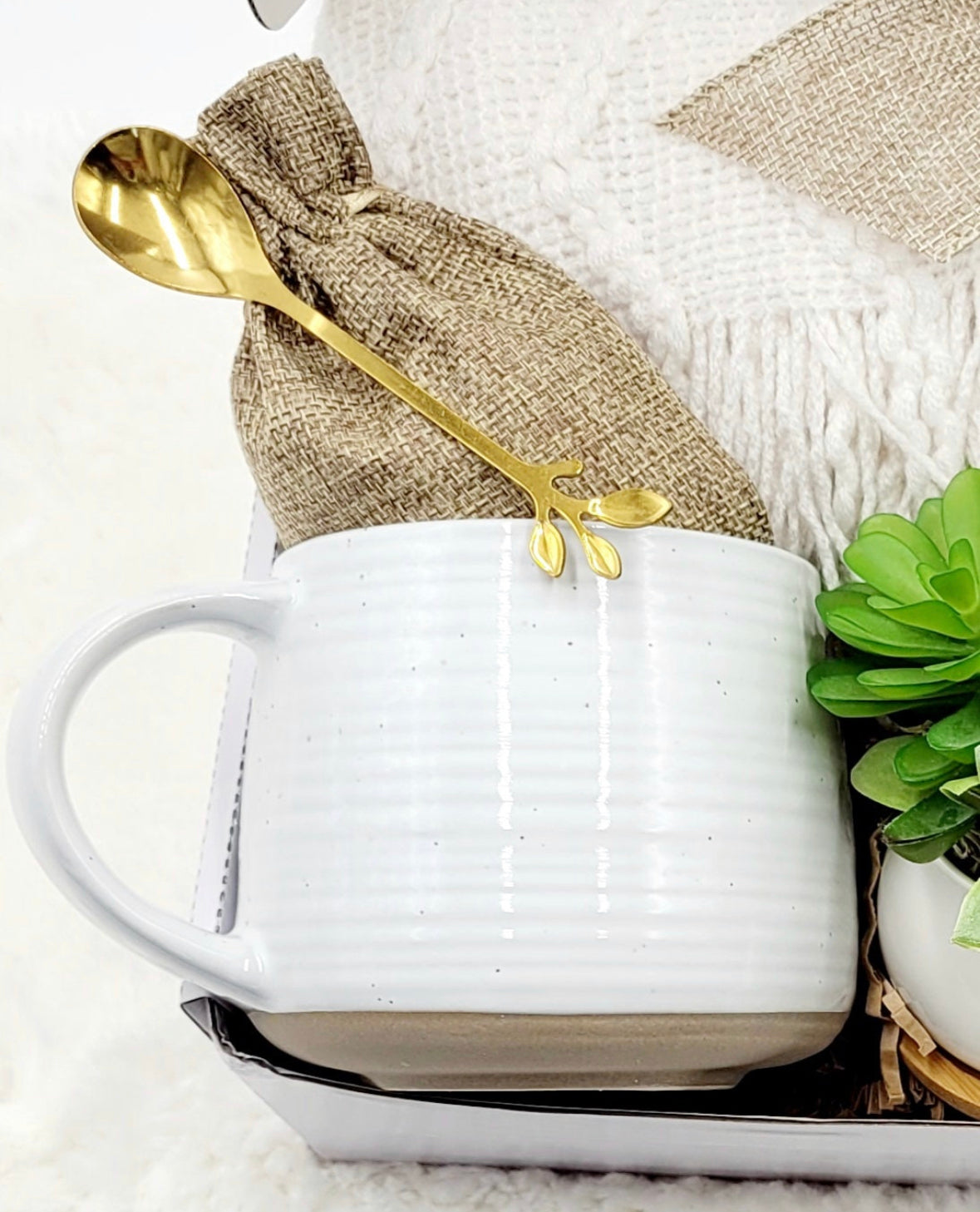 This Thank You Gift Basket is the perfect present for anyone who loves a cozy and festive holiday season. Inspired by the beauty of a White Christmas, this gift basket includes all the cozy necessities for a warm and relaxing winter. It comes with a fringe throw blanket, a candle, a succulent plant, a handmade wood heart sign, a burlap bag with a beverage mug and a gold spoon, and a pair of fuzzy socks. Give the gift of comfort and joy this holiday season with this delightful Thank You Gift Basket.