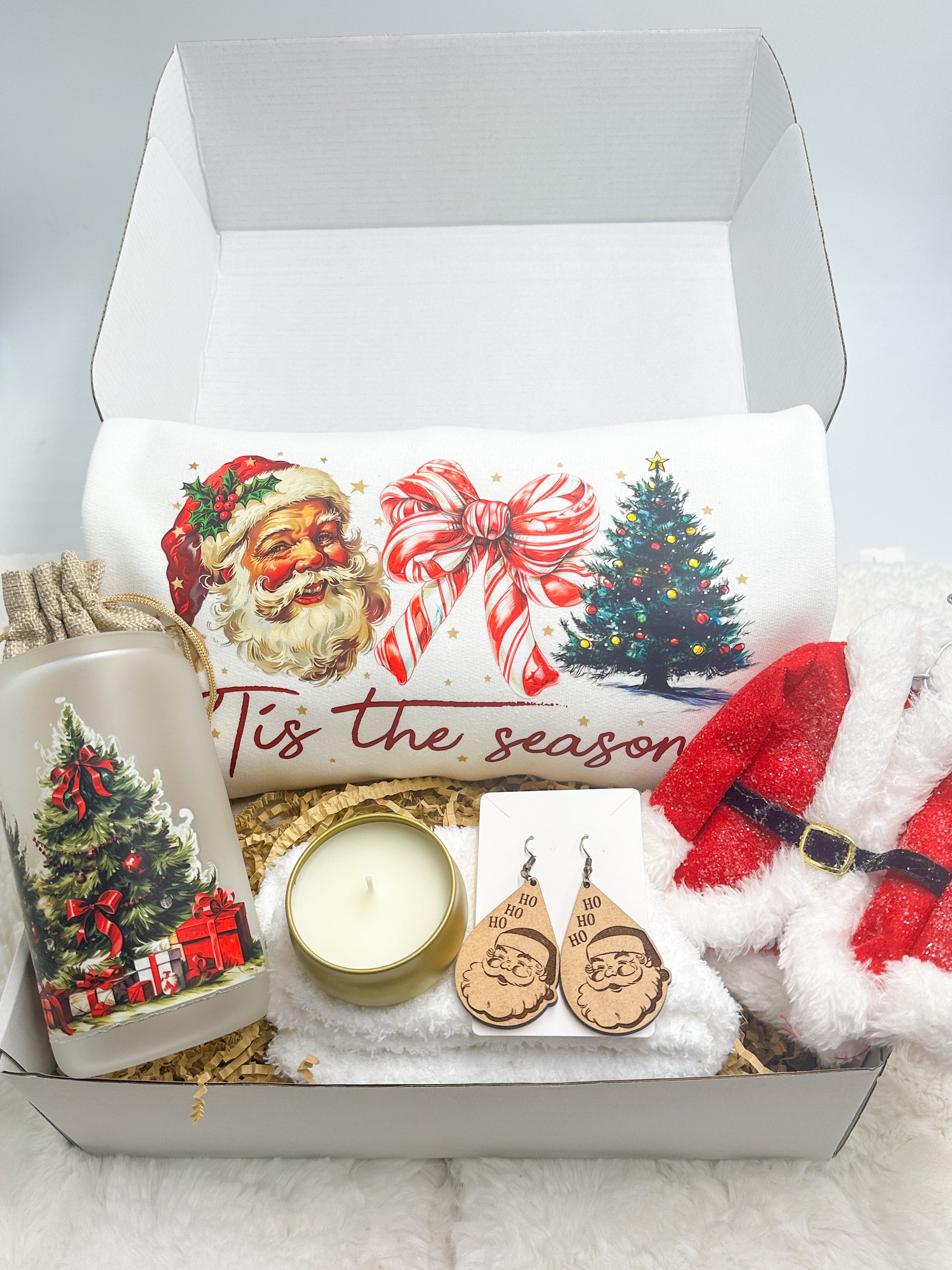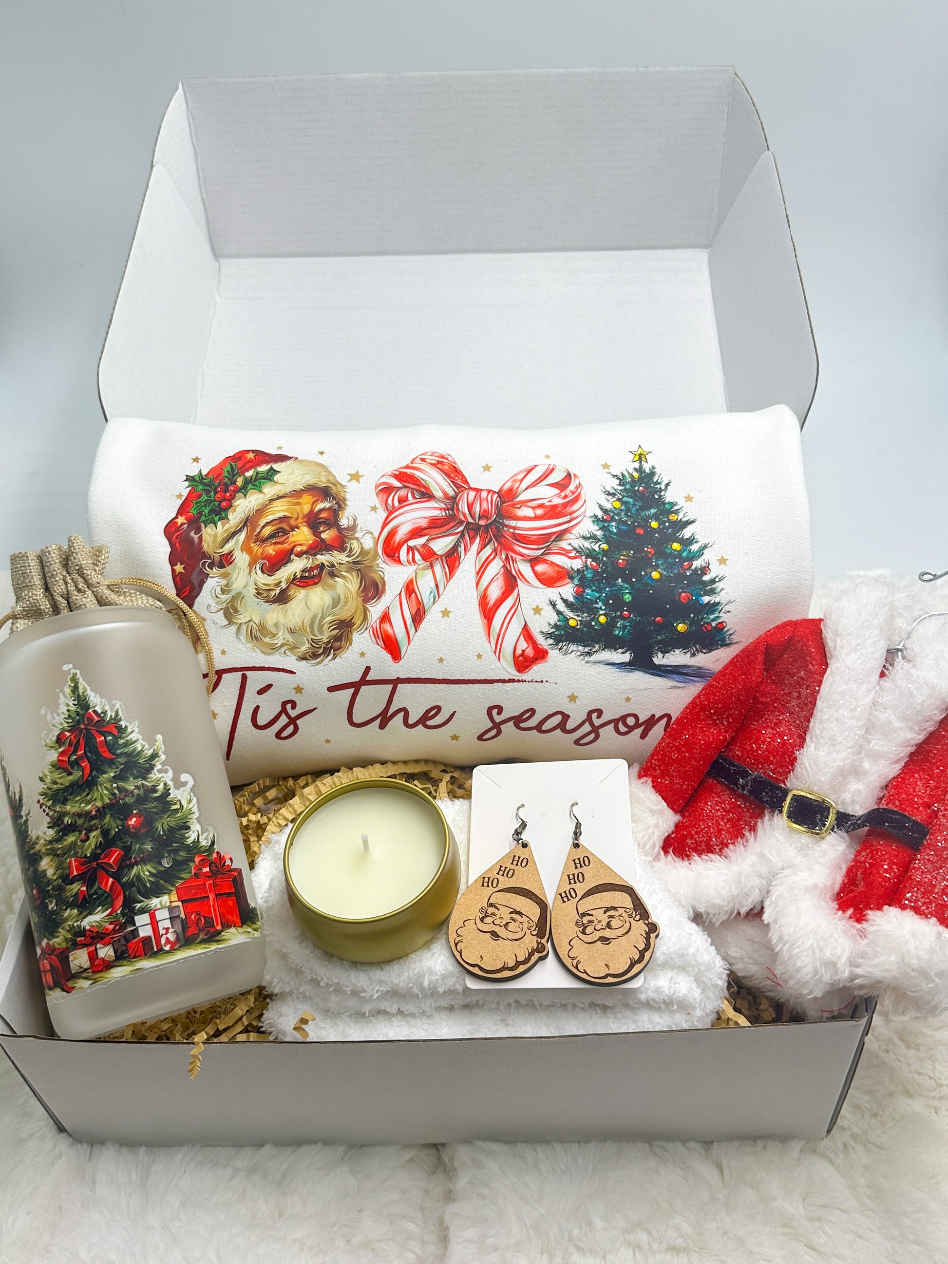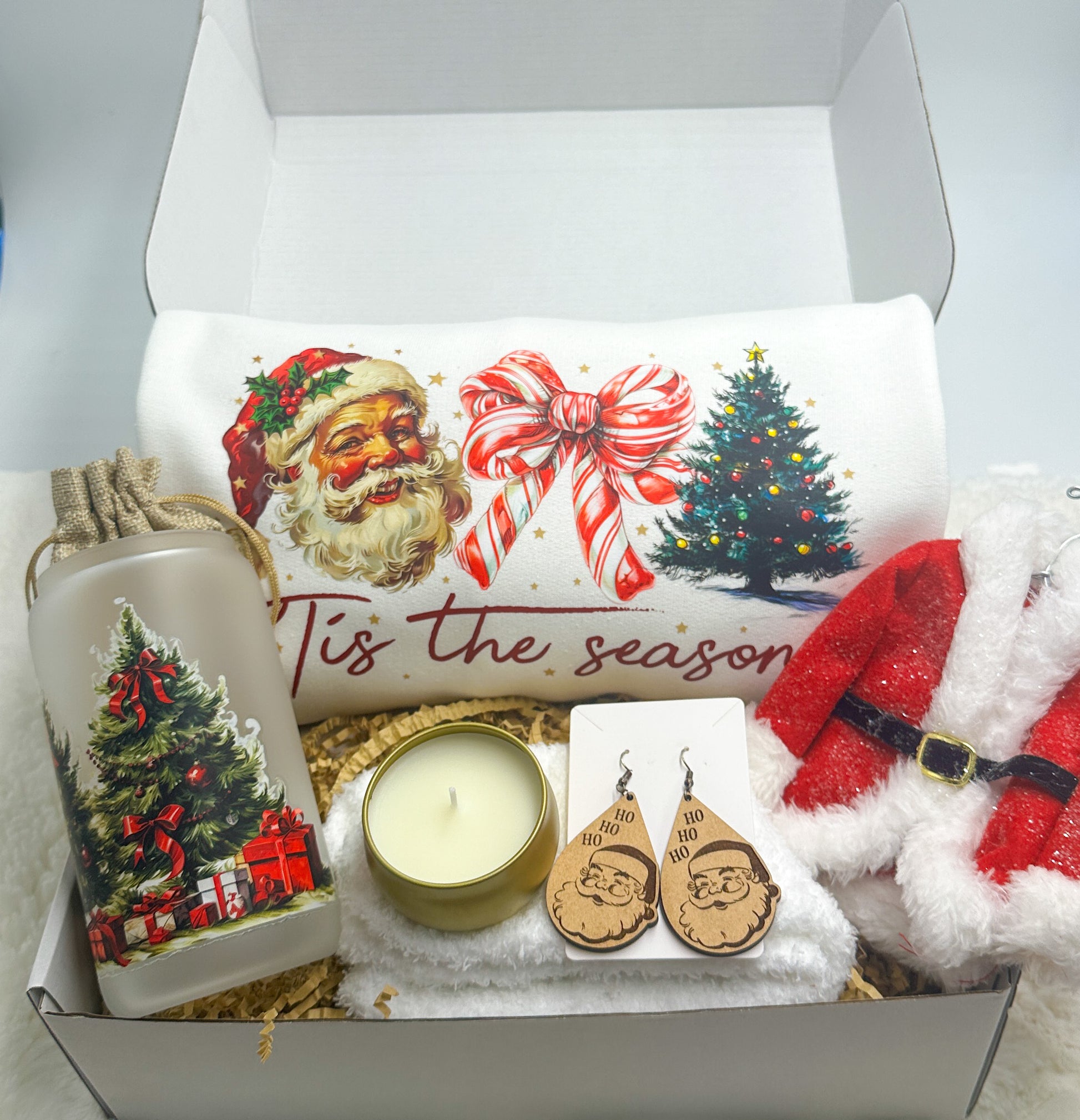 Experience the magic of the holidays with the Tis The Season Christmas Gift Box from GabsDoodleBugDesigns. This thoughtfully curated set includes a cozy "tis the season" sweatshirt, charming Santa earrings, a festive Santa coat ornament, a 16 oz tumbler adorned with a Christmas tree design, a delightful candle, and a pair of warm fuzzy socks. Each item is handpicked to celebrate the joy and warmth of the season, making it the perfect gift for loved ones or a special treat for yourself. Discover the spirit of Christmas and support a business that values quality and customer satisfaction. Share the holiday cheer with our delightful gift box, exclusively at GabsDoodleBugDesigns.