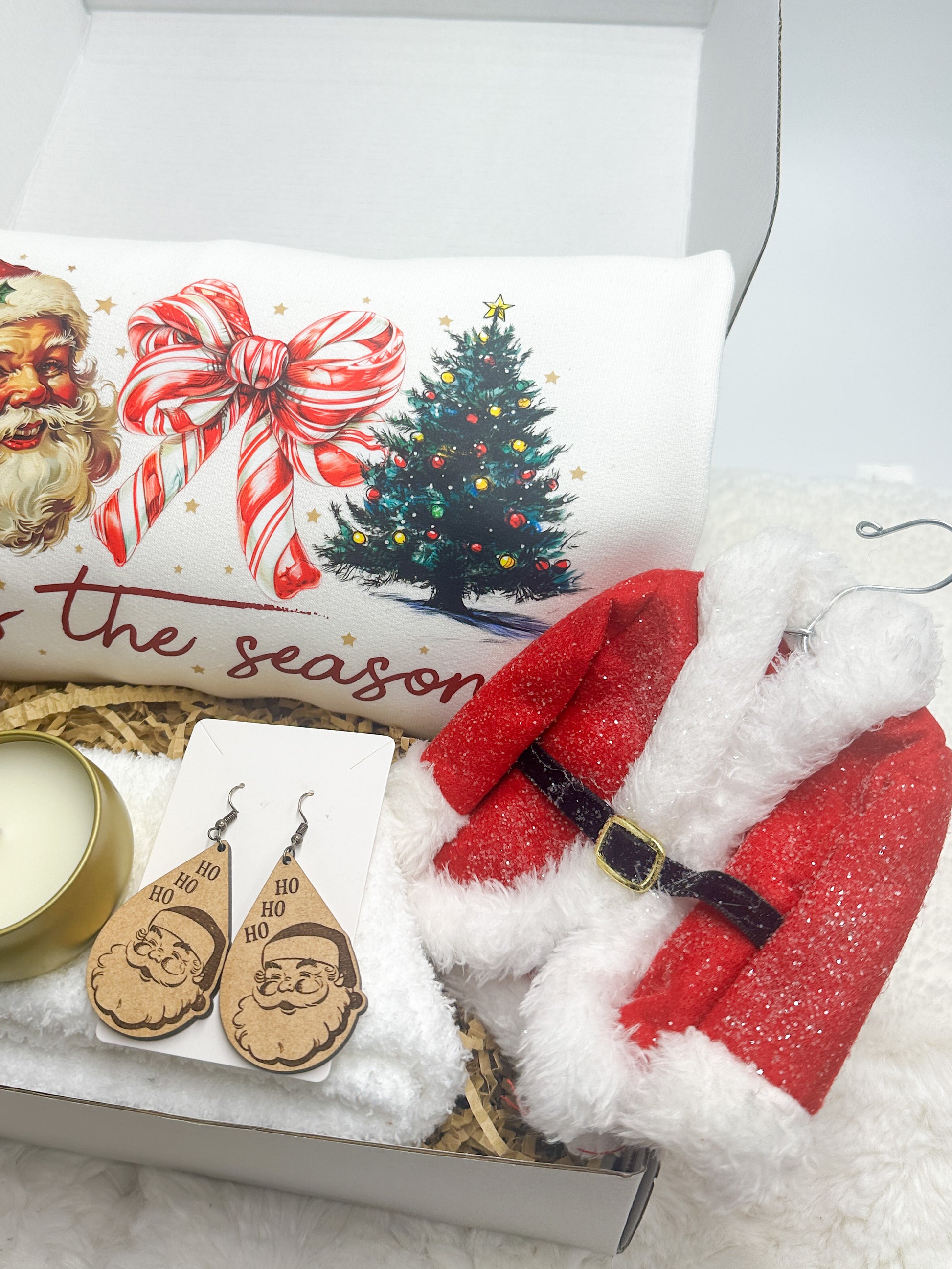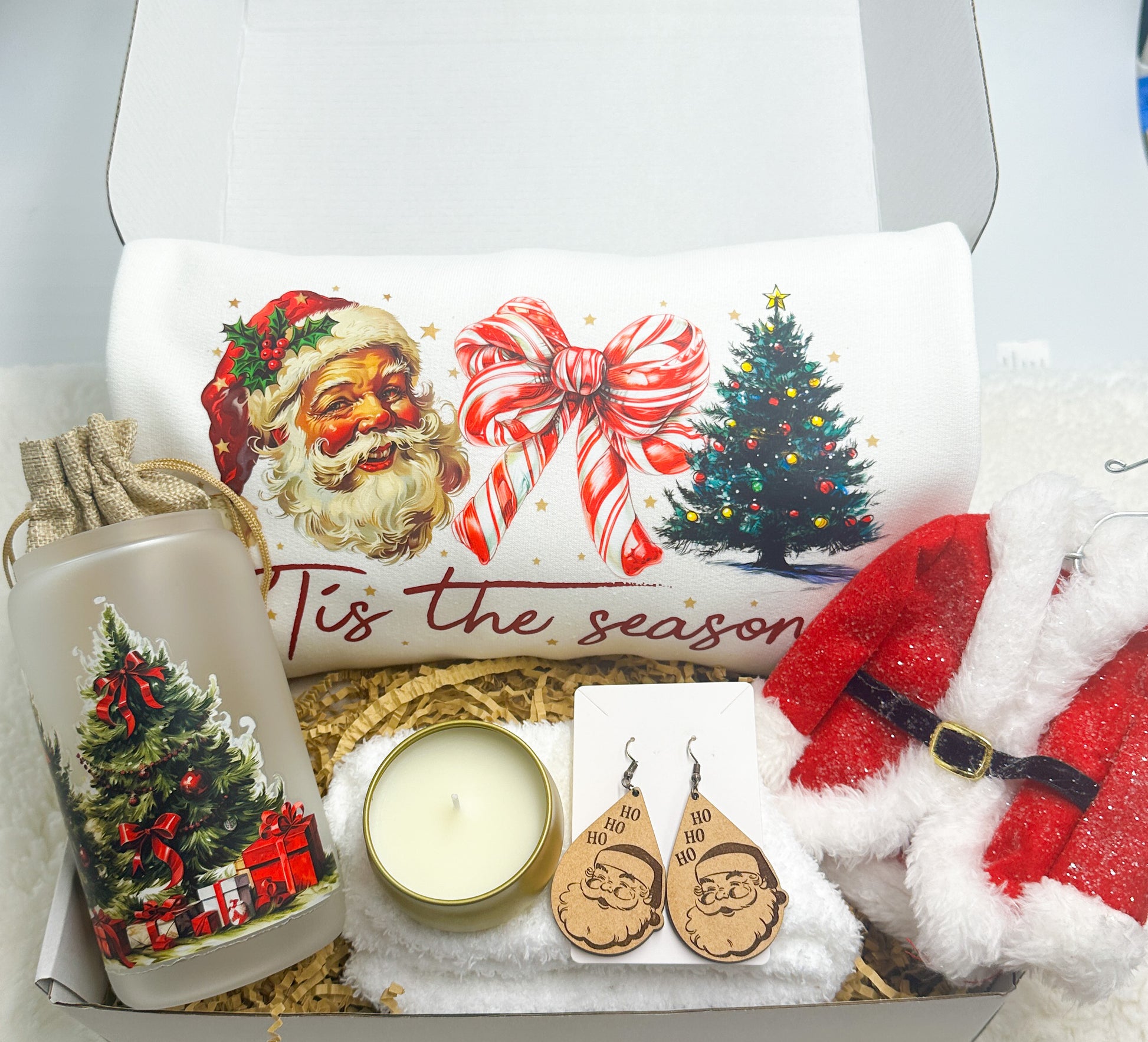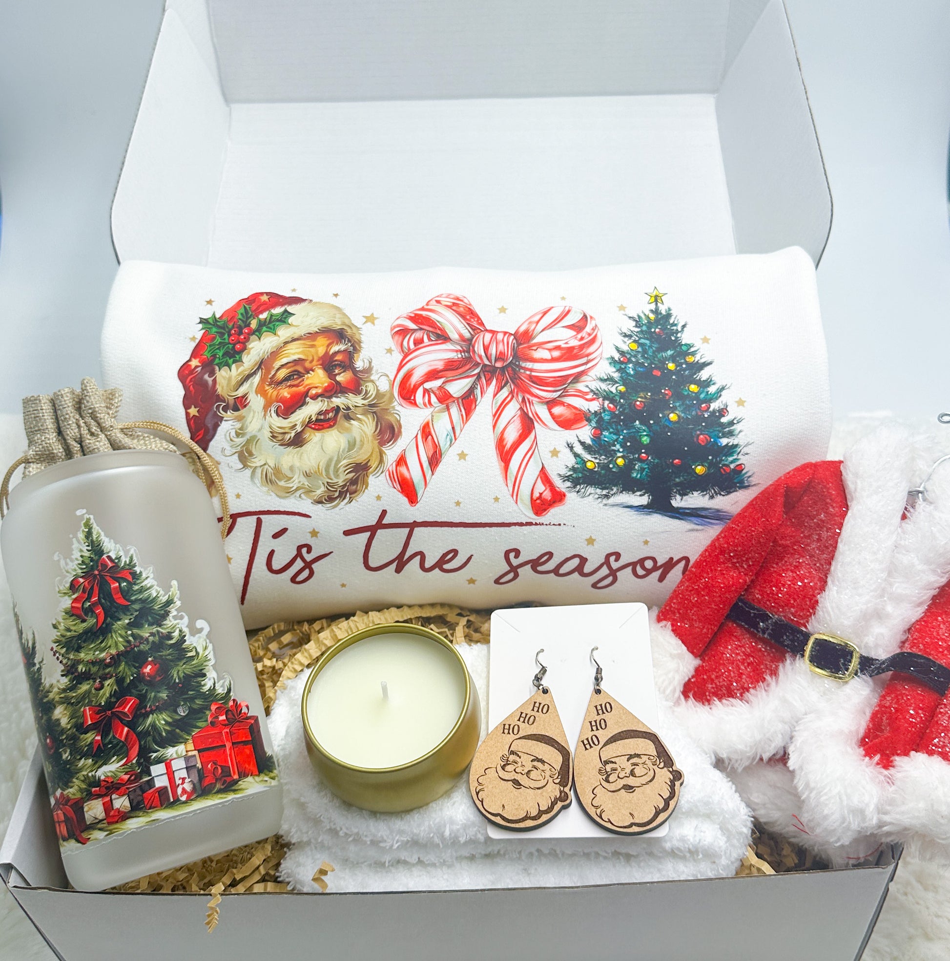 Experience the magic of the holidays with the Tis The Season Christmas Gift Box from GabsDoodleBugDesigns. This thoughtfully curated set includes a cozy "tis the season" sweatshirt, charming Santa earrings, a festive Santa coat ornament, a 16 oz tumbler adorned with a Christmas tree design, a delightful candle, and a pair of warm fuzzy socks. Each item is handpicked to celebrate the joy and warmth of the season, making it the perfect gift for loved ones or a special treat for yourself. Discover the spirit of Christmas and support a business that values quality and customer satisfaction. Share the holiday cheer with our delightful gift box, exclusively at GabsDoodleBugDesigns.