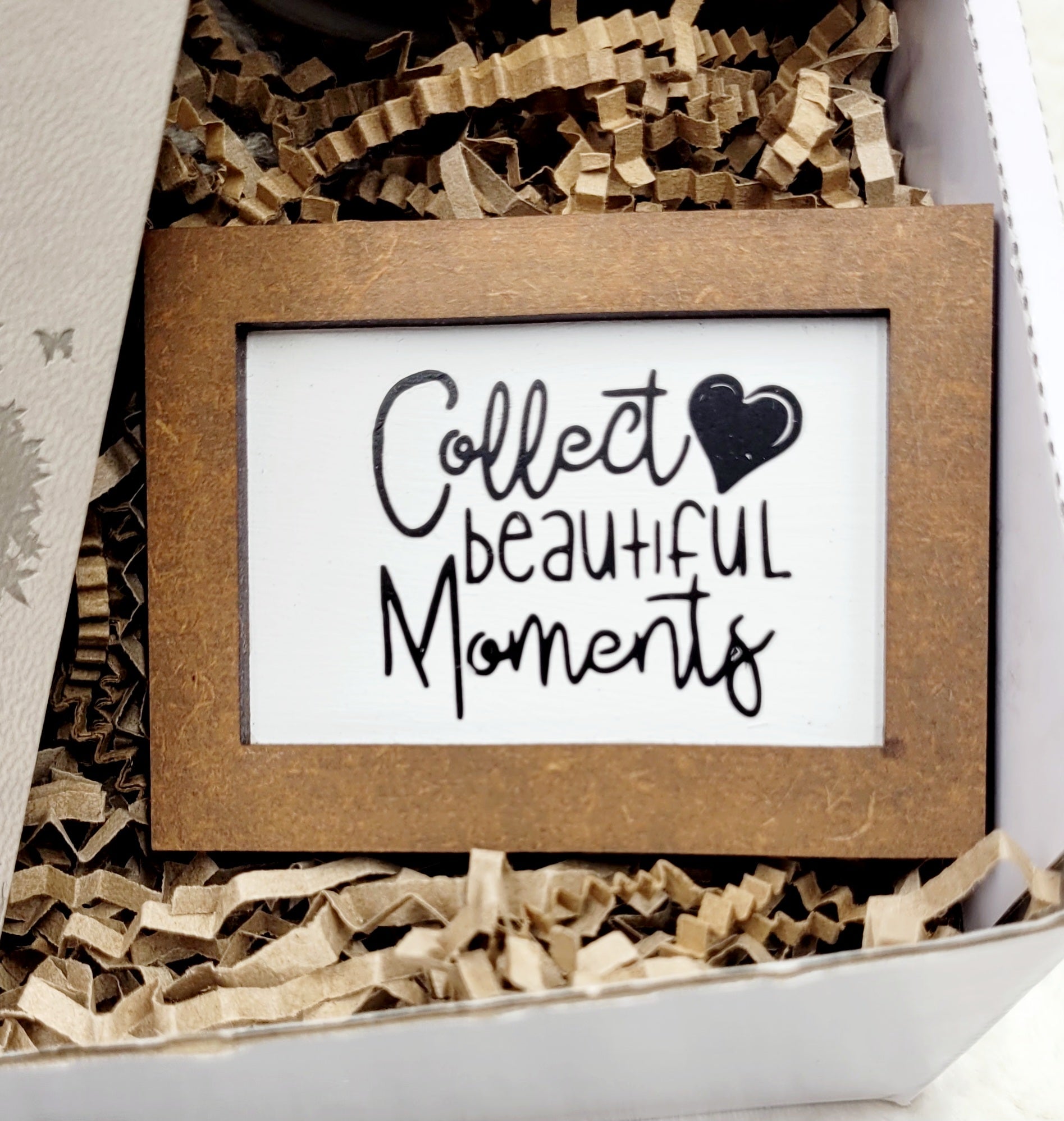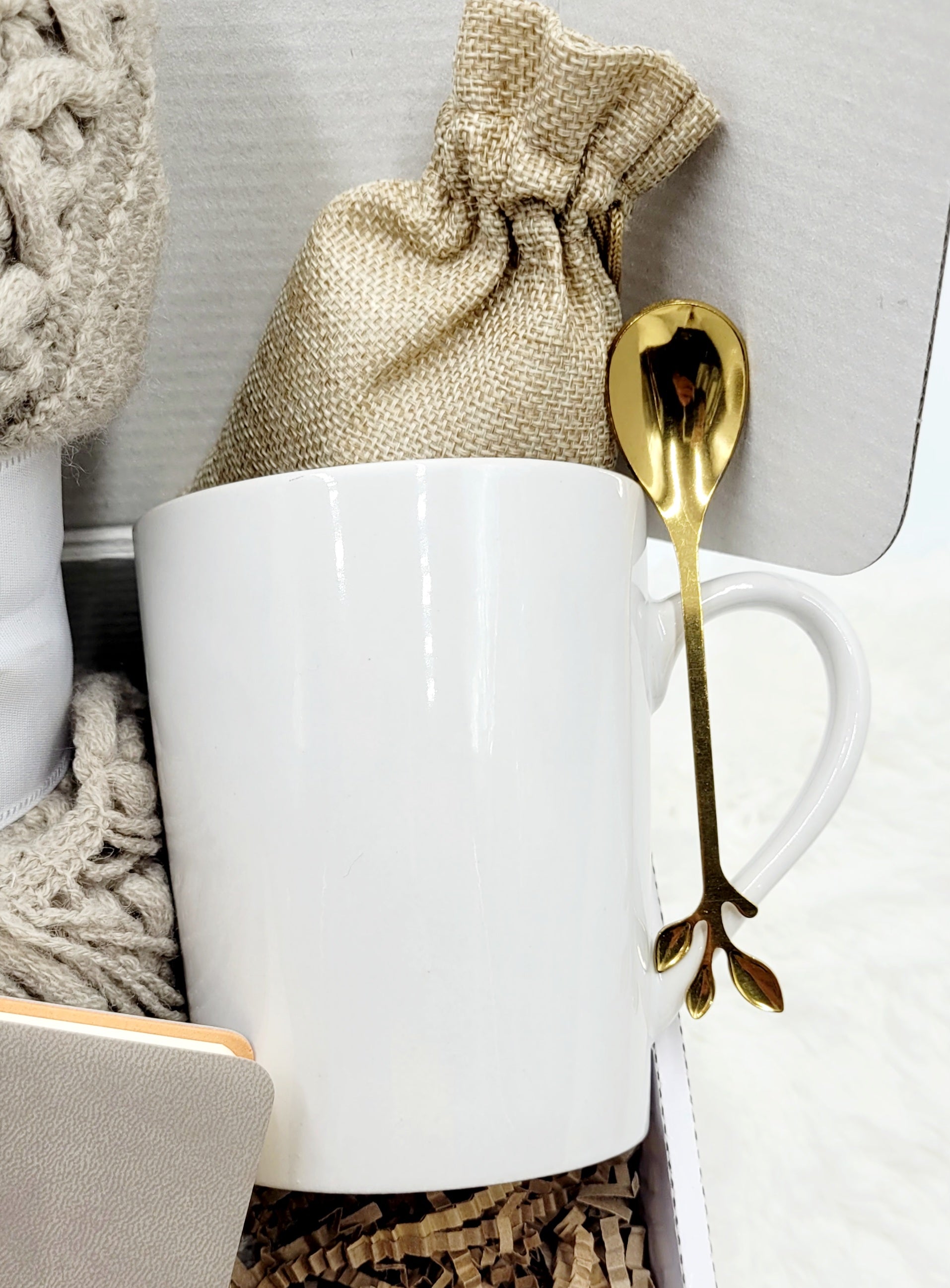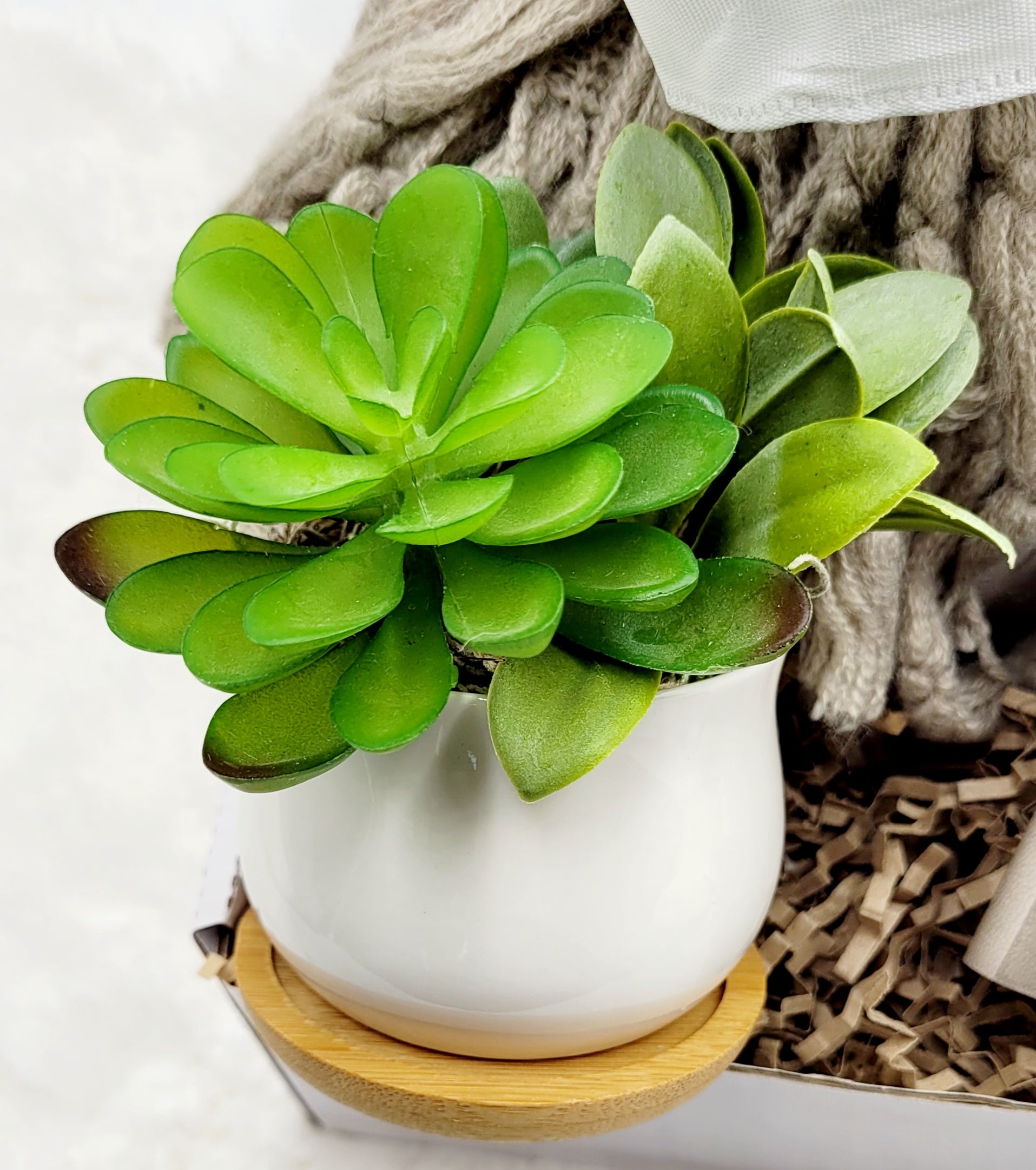 This Wellness Gift Basket is the perfect gift for any person in your life, whether it's your best friend or teacher. Inside the basket, you'll find a cozy blanket, a pocket notebook, a mug with a gold spoon, a faux succulent plant with a coaster, and a "Collect Beautiful Moments" sign. The burlap bag comes with a beverage, making it easy for her to sit back and relax. The basket comes wrapped with a bow and includes a gift message to make the gift even more special.