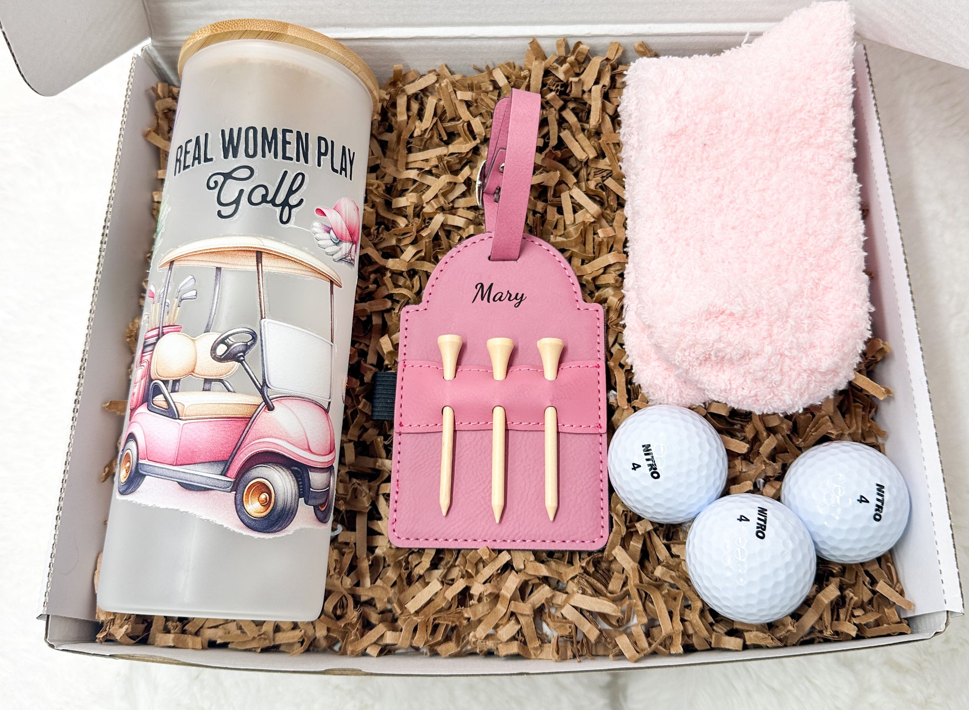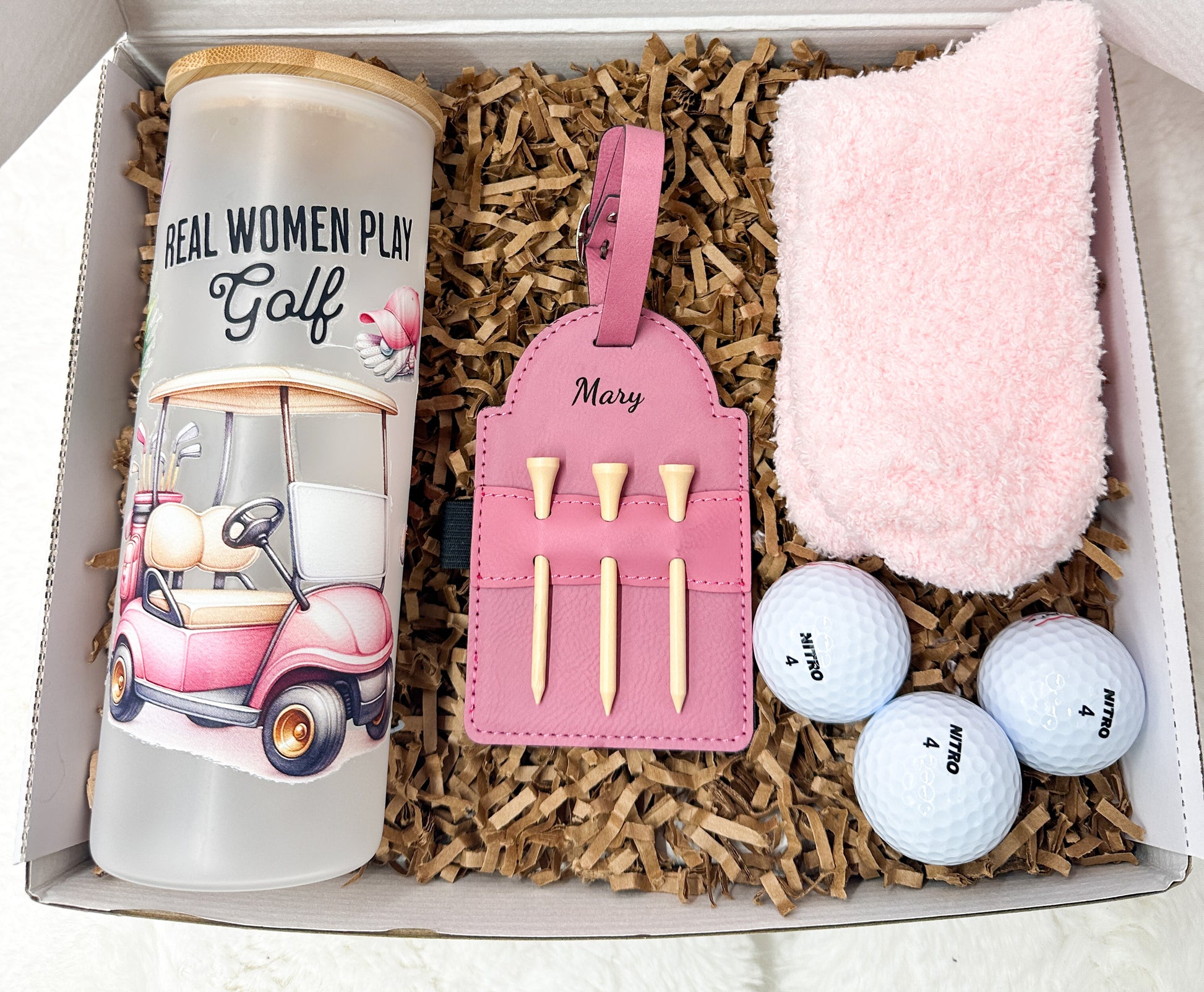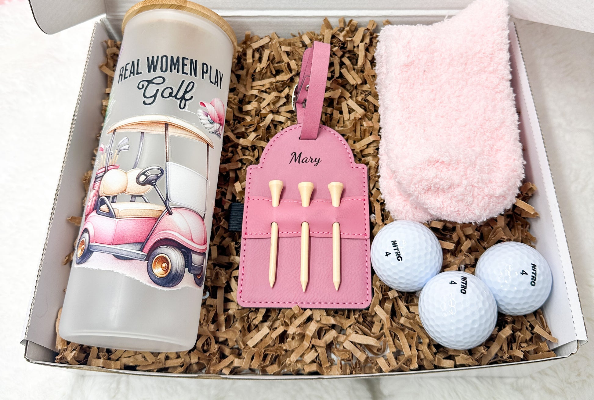 Introducing the ultimate gift for the female golfer in your life - the Real Women Play Golf Gift Box! This curated box includes a 25 oz frosted tumbler to keep her hydrated on the course, a personalized engraved tea holder name tag for her golf bag, and a pair of luxurious fuzzy socks to keep her feet cozy after a long day of teeing off. Whether she's a seasoned pro or just starting out, this gift box is sure to delight any woman who loves the sport of golf. Give her the gift of comfort and style with the Real Women Play Golf Gift Box. Perfect for birthdays, holidays, or just to show her you care.