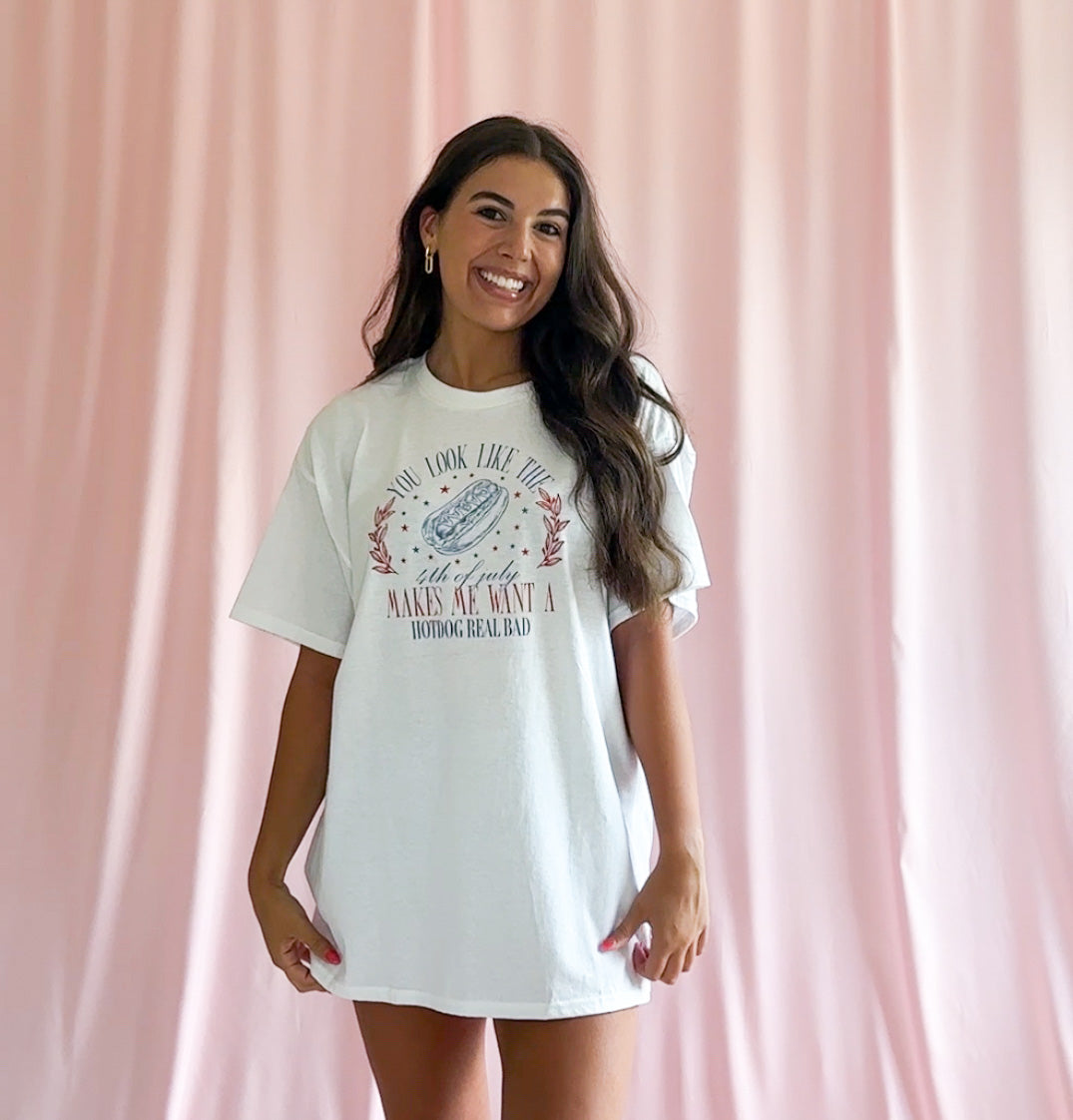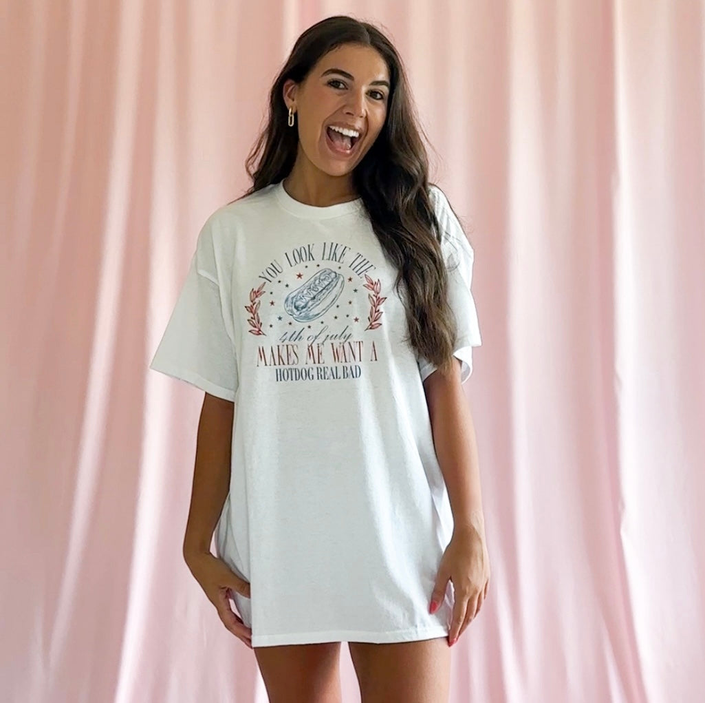 Celebrate the Fourth of July in style with our "You look like the fourth of july makes me want a hot dog real bad" tshirt! This fun and patriotic tshirt is perfect for showing off your love for America's favorite holiday. Made for women, this tshirt is available in multiple sizes, and we recommend sizing up for an oversize, relaxed look. Whether you're heading to a barbecue, fireworks show, or just want to show off your American pride, this tshirt is a must-have for your wardrobe. Made with high-quality materials, this tshirt is comfortable, durable, and perfect for any Fourth of July celebration.